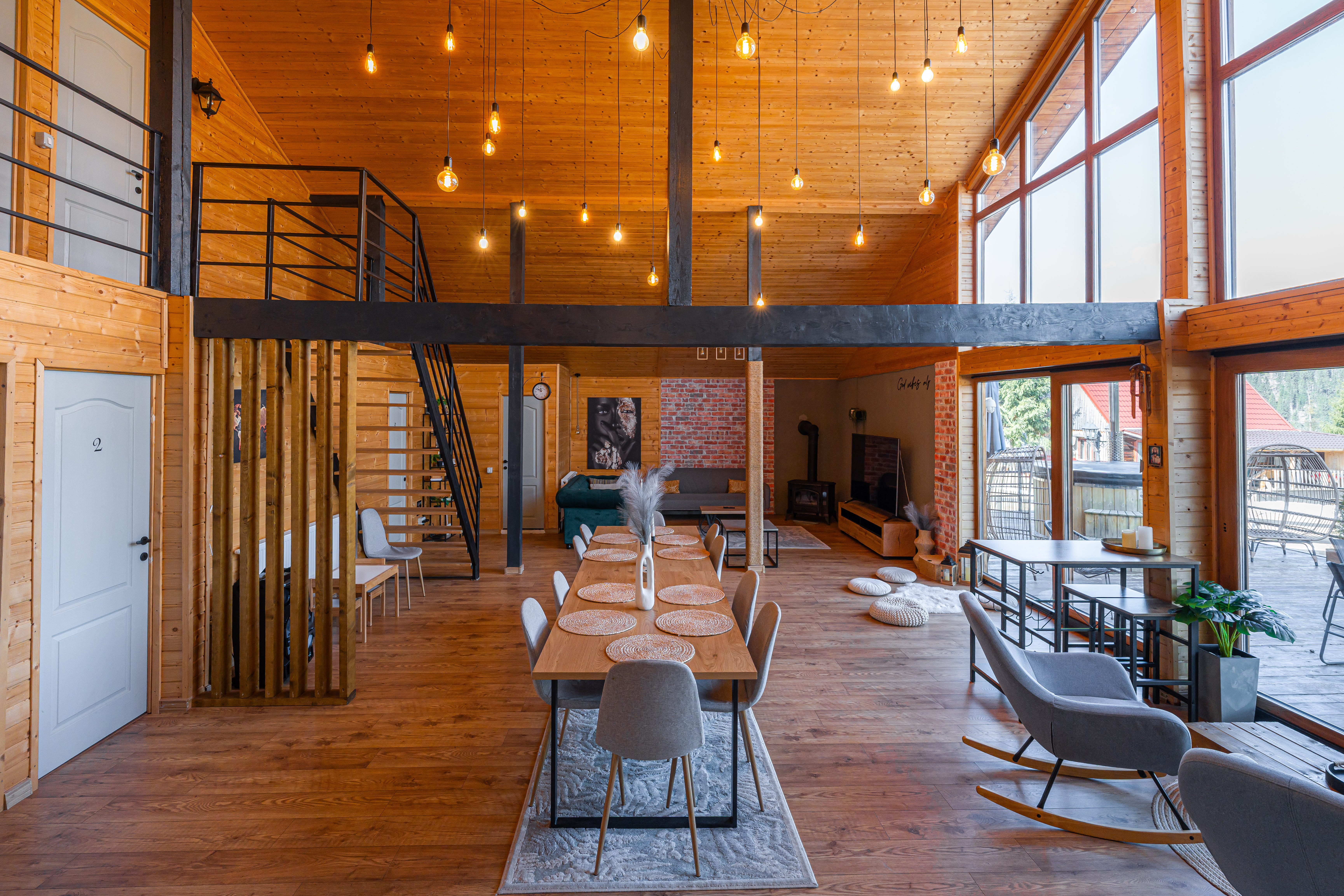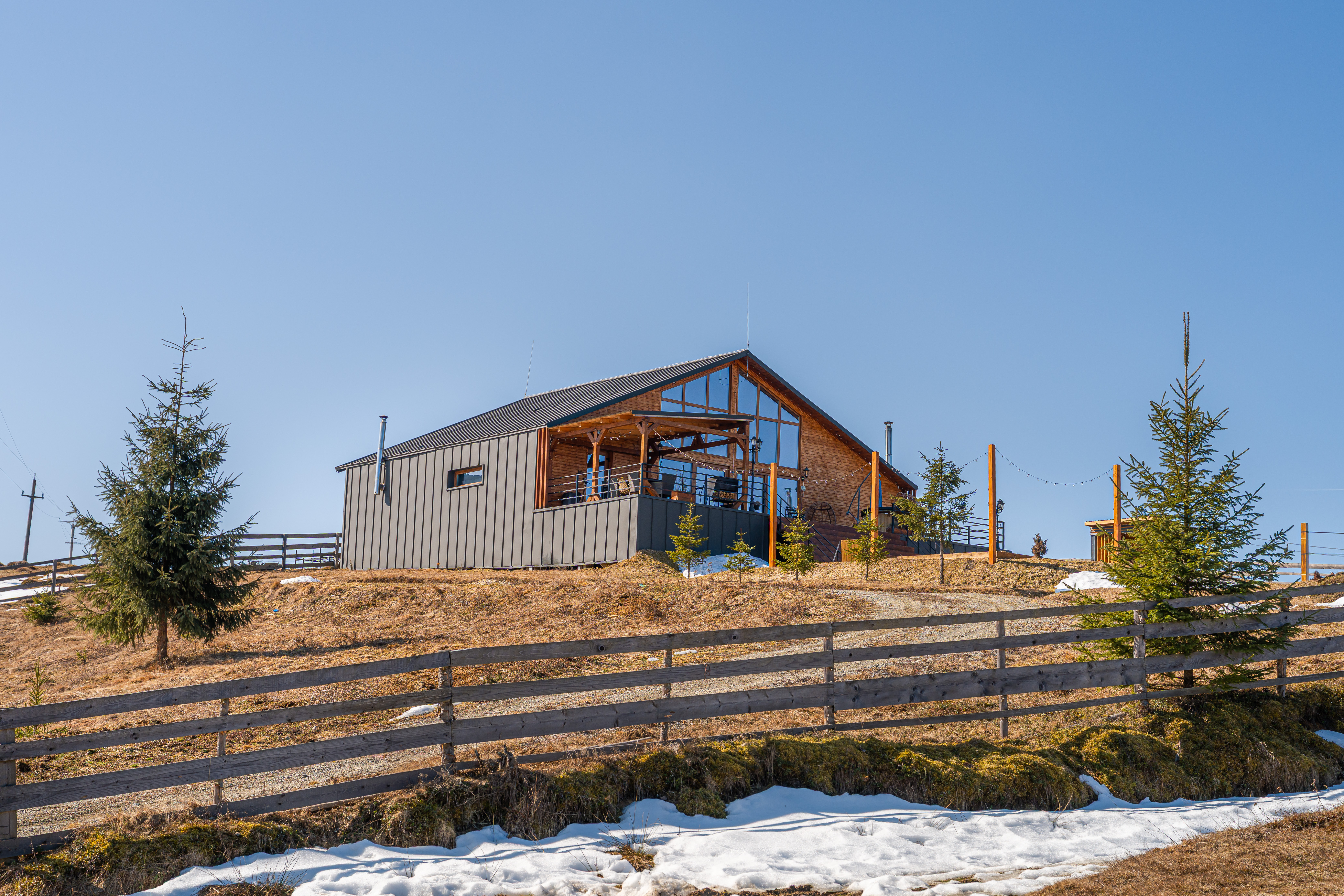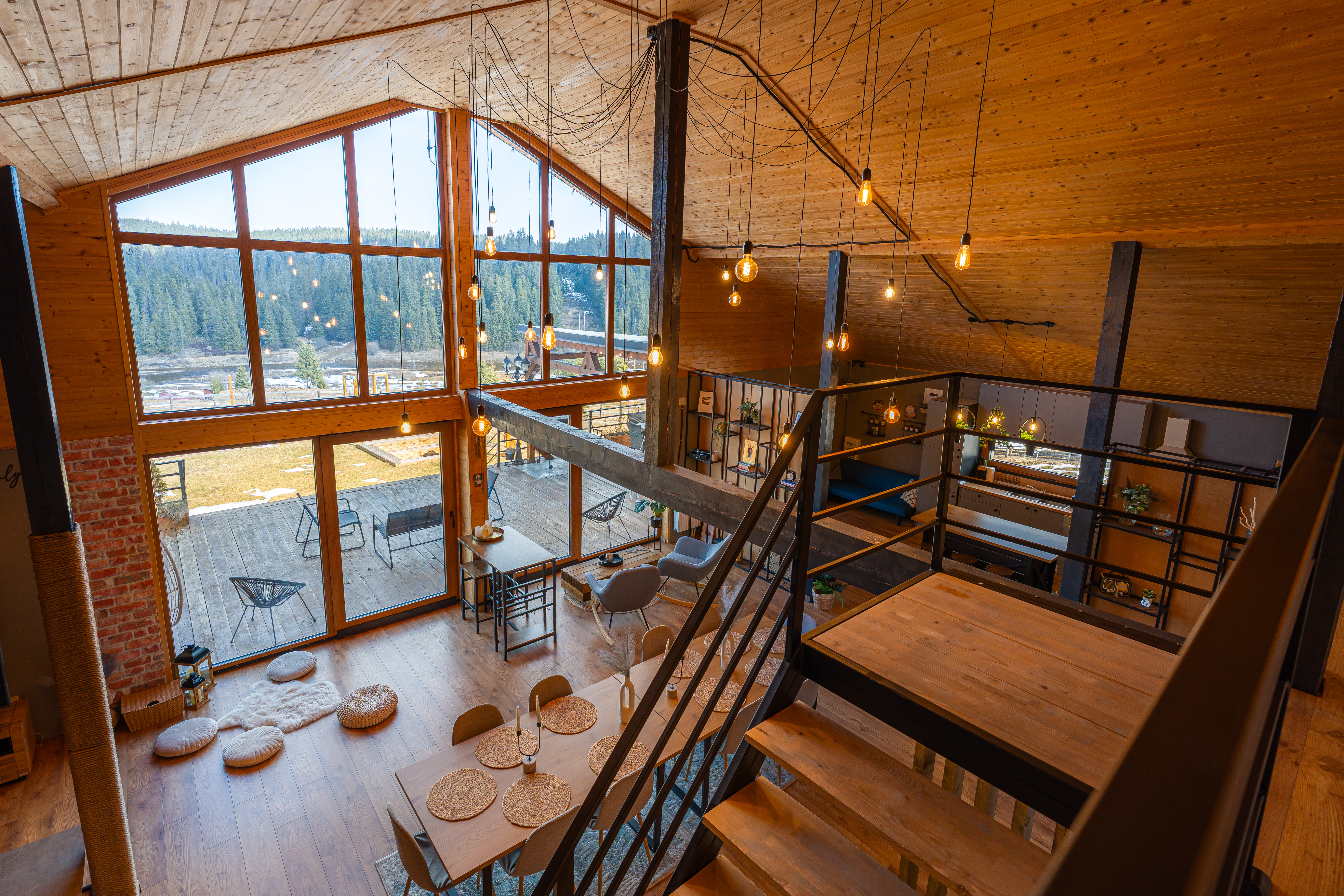 Completed in 2024 on a generous plot of over 3,000 sqm, the residence was conceived as a modern mountain chalet capable of functioning equally well as a private holiday home or a boutique hospitality destination. Its balanced volumes, natural materials, and expansive glazing create bright interiors that open seamlessly toward the landscape, allowing the scenery to become an integral part of daily living. The double-height living area forms the architectural centerpiece of the home, offering an airy, elegant atmosphere complemented by a dining space and fully equipped kitchen designed for both comfort and social gatherings.