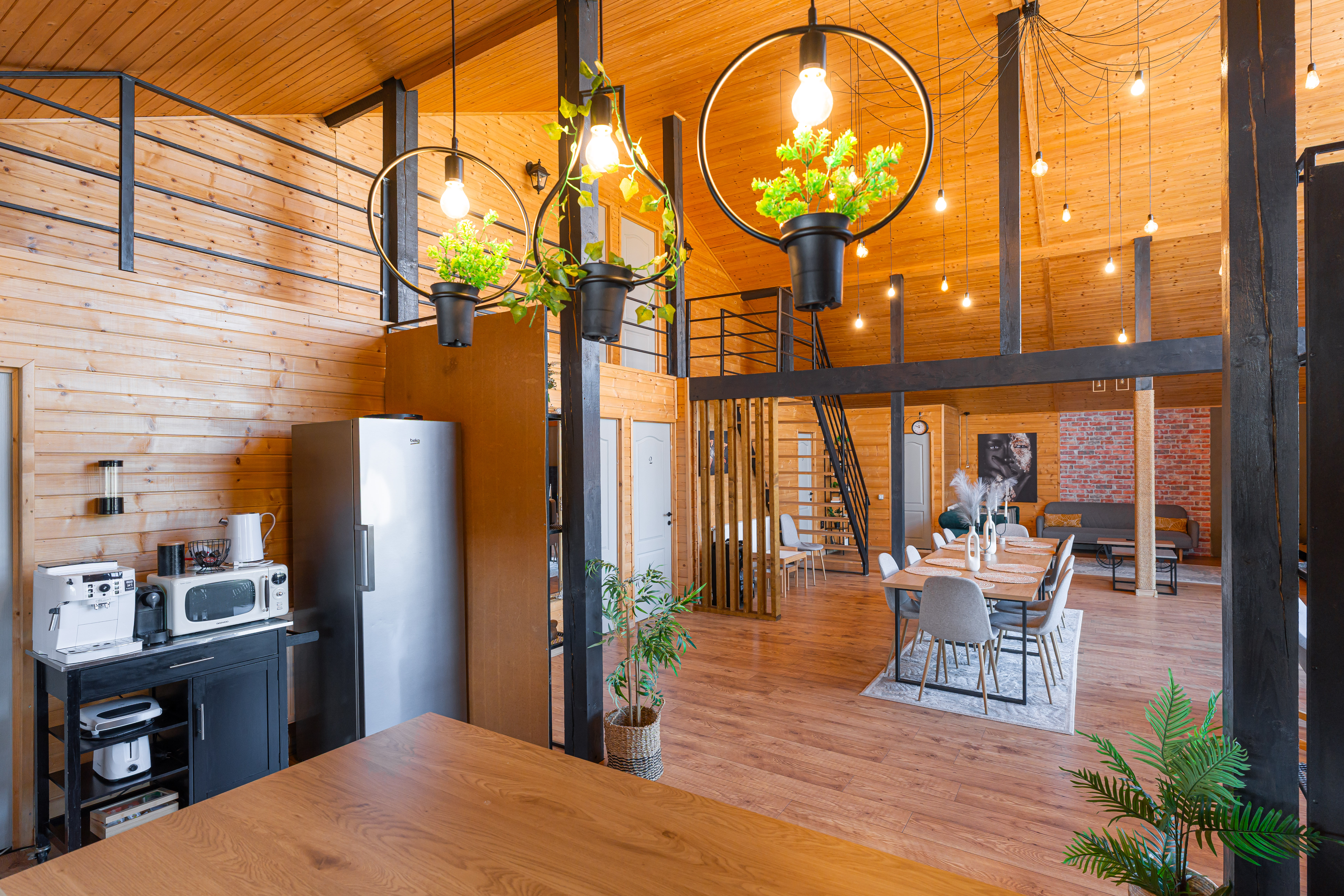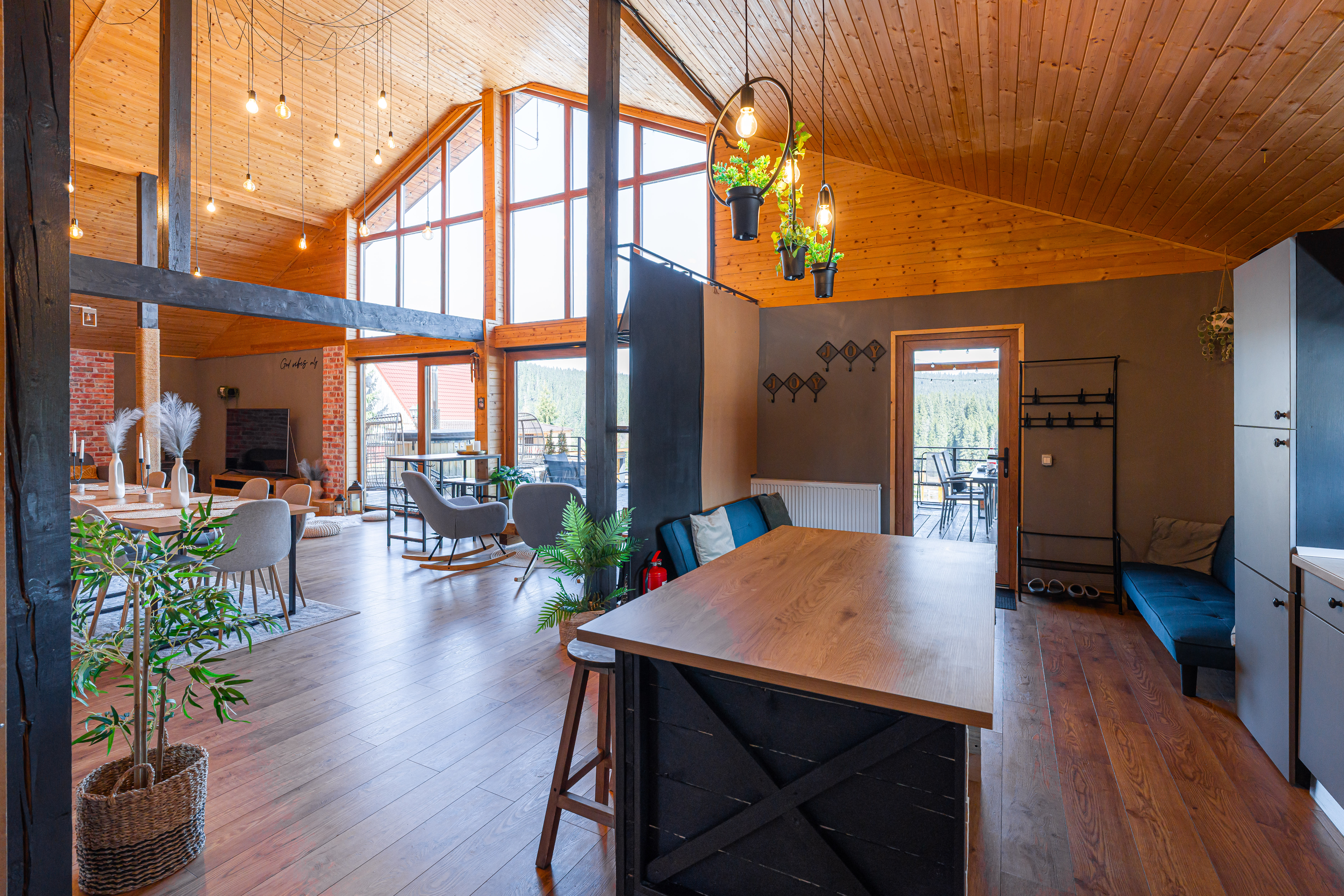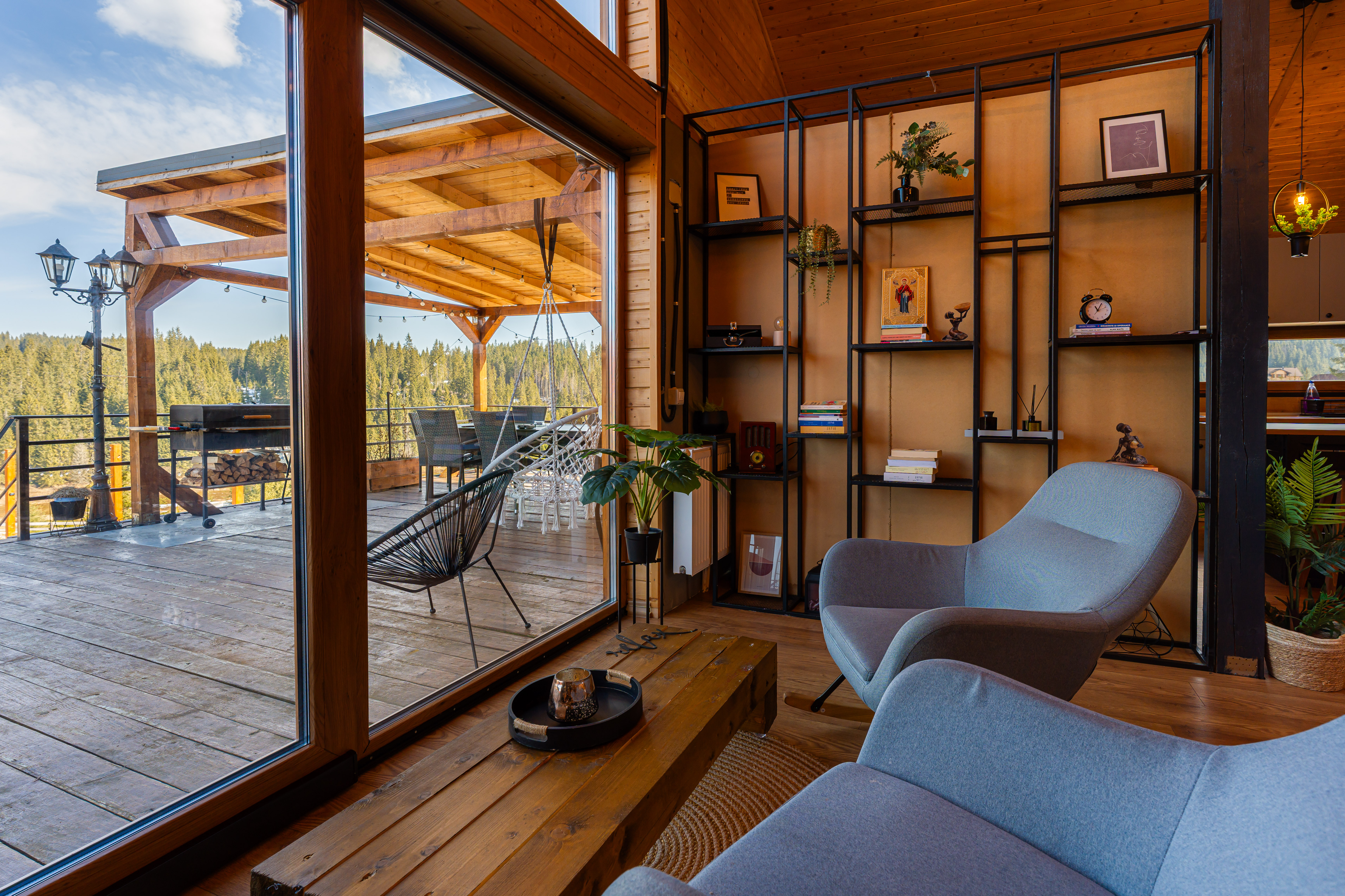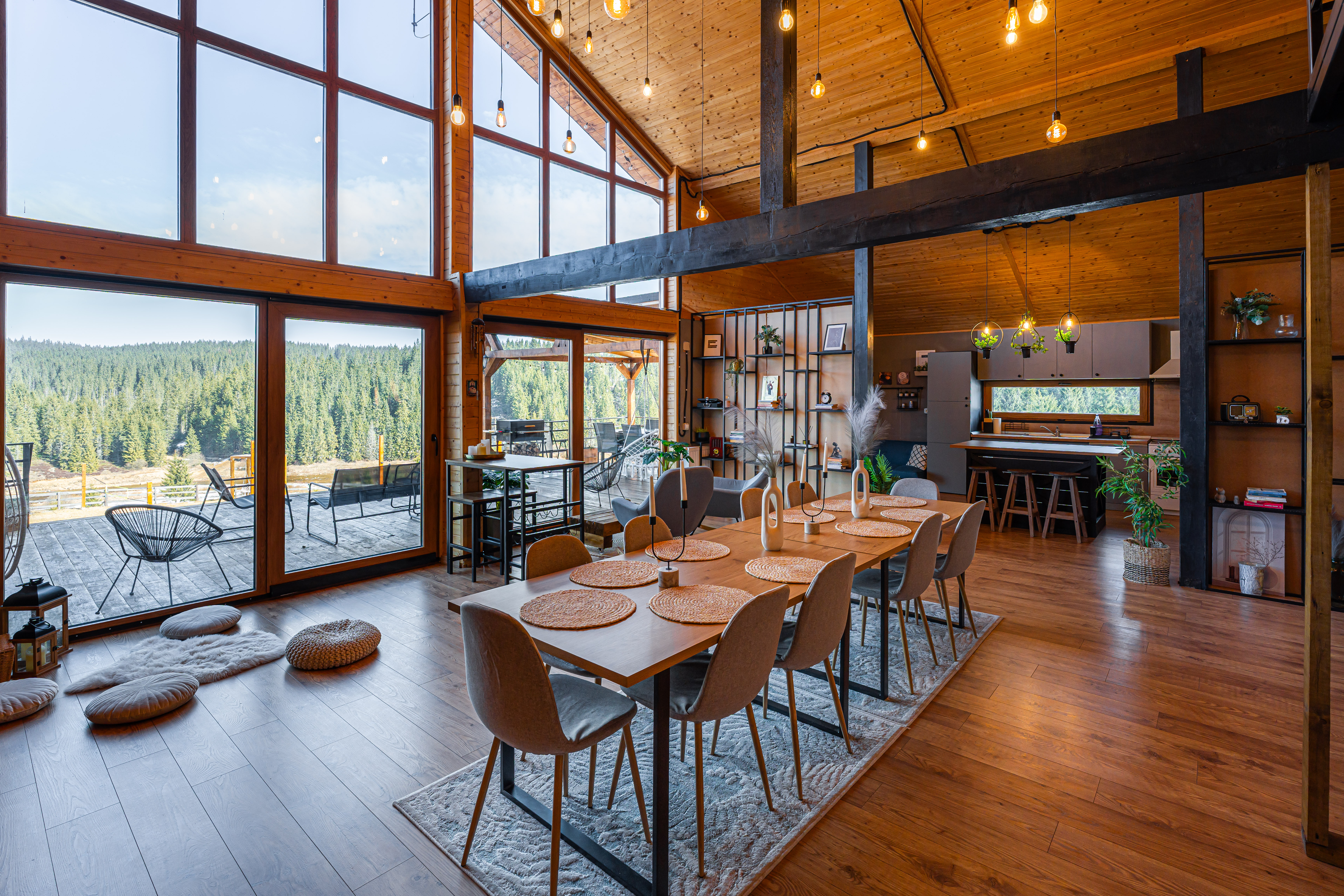 Completed in 2024 on a generous plot of over 3,000 sqm, the residence was conceived as a modern mountain chalet capable of functioning equally well as a private holiday home or a boutique hospitality destination. Its balanced volumes, natural materials, and expansive glazing create bright interiors that open seamlessly toward the landscape, allowing the scenery to become an integral part of daily living. The double-height living area forms the architectural centerpiece of the home, offering an airy, elegant atmosphere complemented by a dining space and fully equipped kitchen designed for both comfort and social gatherings.