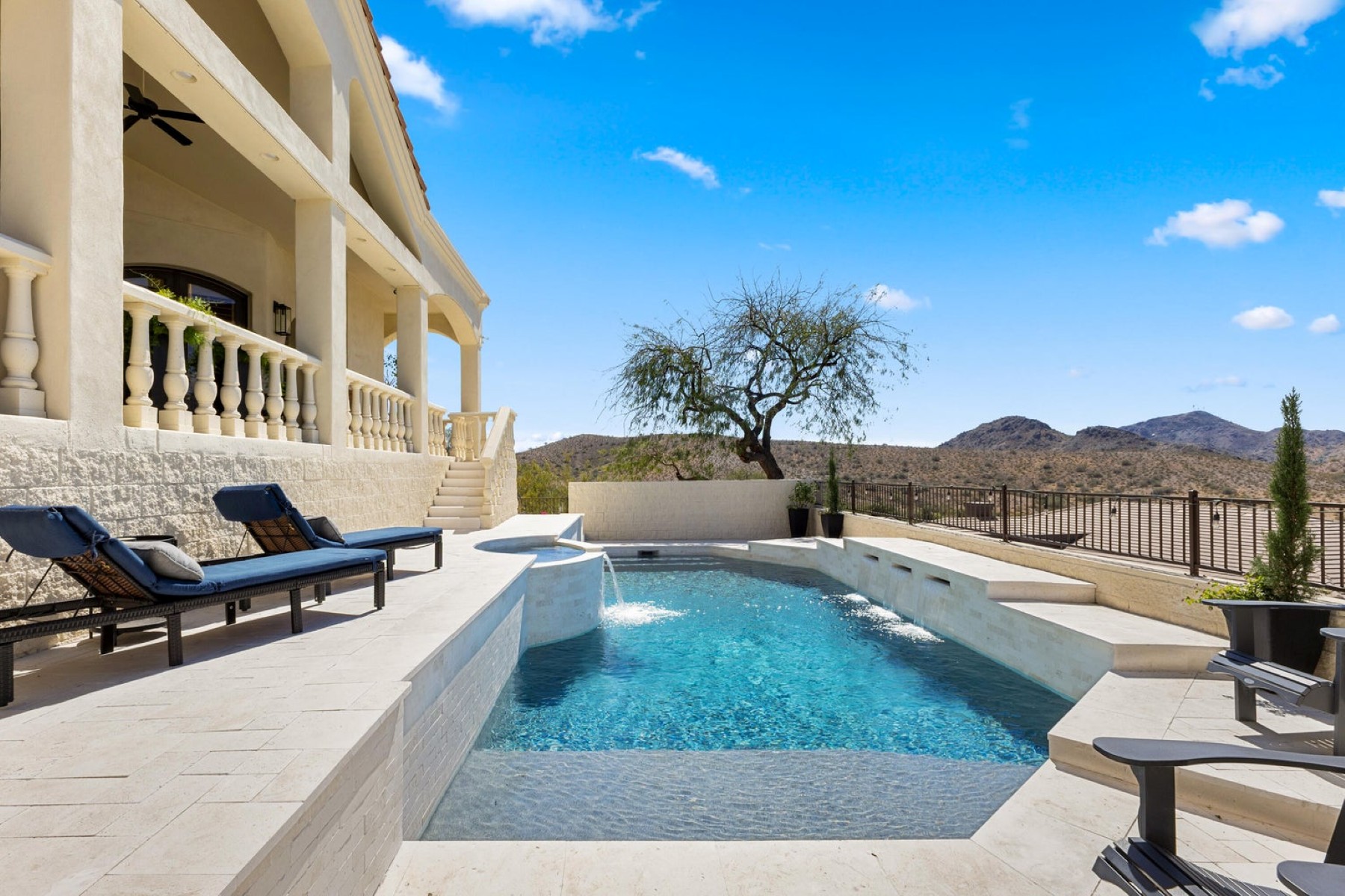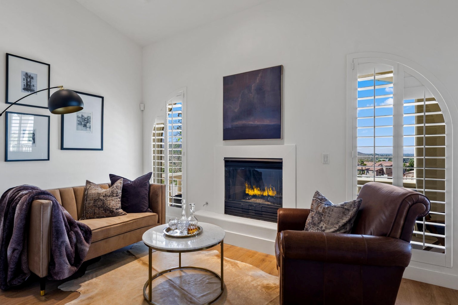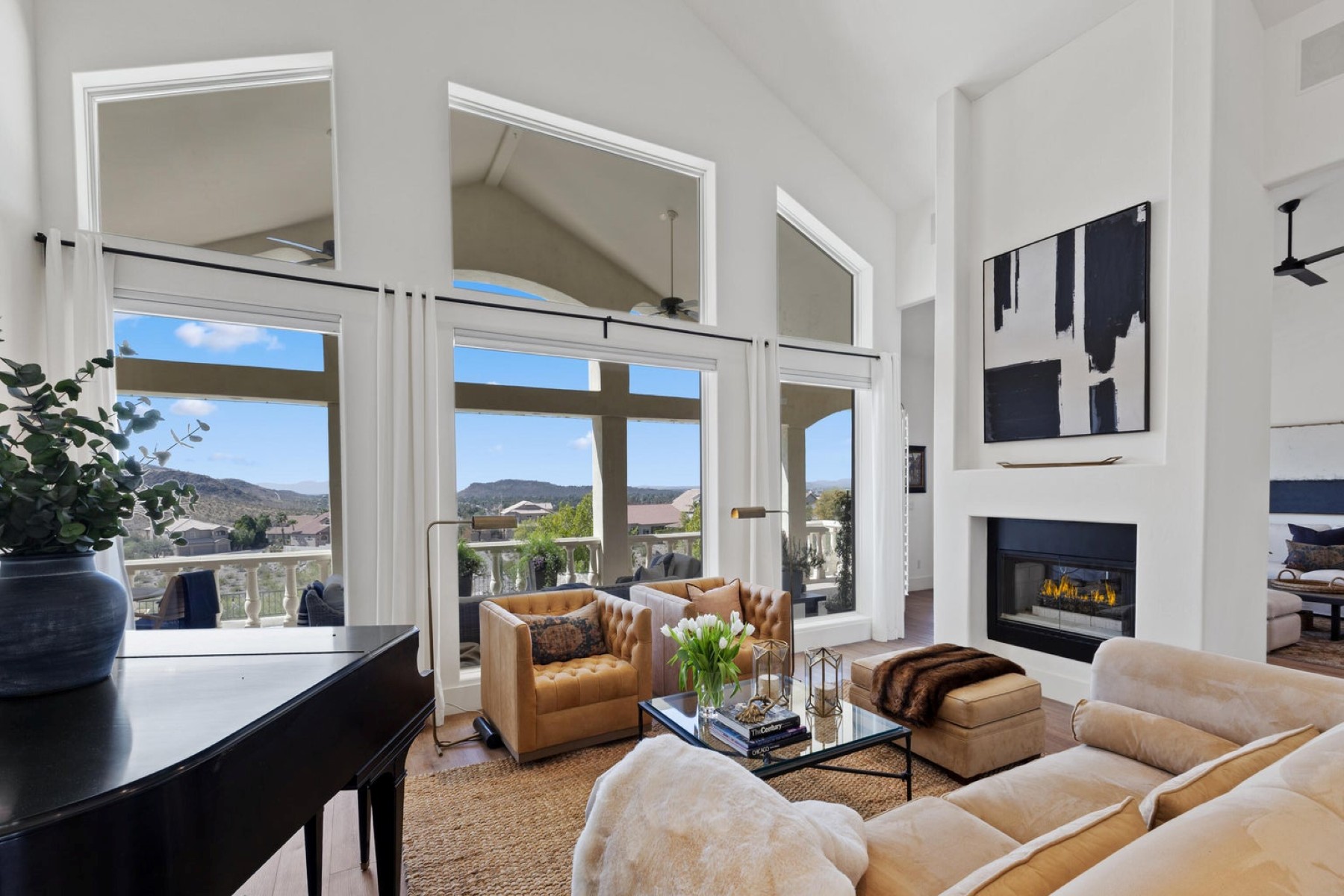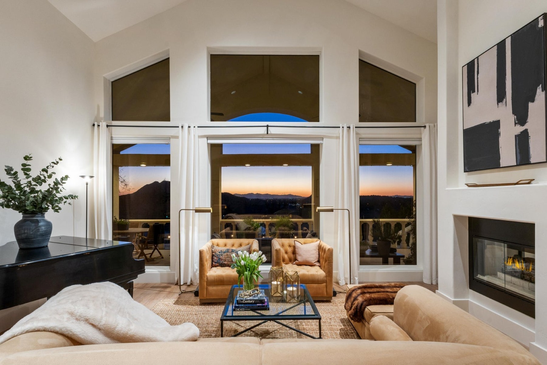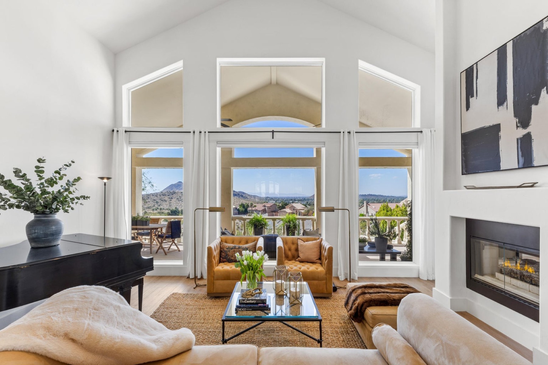 Experience breathtaking, panoramic views from every room on the main level of this masterfully renovated residence. Spanning over 4,600 sq ft, the home impresses with soaring cathedral ceilings and 10.5' minimum heights on the main floor. The heart of the home features a dramatic see-through fireplace connecting the elegant living and family rooms, both framed by captivating vistas. The kitchen serves as a culinary hub, featuring a center island and stunning quartzite slab counters. It is thoughtfully equipped with a beverage fridge and a dedicated coffee bar, making it as functional for morning routines as it is for evening entertaining. The main-level master suite is a true retreat, featuring a sitting area, fireplace, access to the balcony, dual walk-in closets, and a spa-like bath finished in exquisite Carrera marble. A dedicated den and guest bedroom complete the main level. The lower level maintains a spacious feel with 9' ceilings and includes two additional bedrooms, a full bath, and two entertainment spaces; one featuring a TV room with a full bar, and fireplace; while the other space creates a game room environment. Whether you are hosting on the expansive upstairs balcony or lounging by the pool--accessible from both levels--the indoor-outdoor transition is effortless. This home is a rare blend of scale, sophisticated designer finishes, and tranquil scenery. From the Carrera tile to the quartzite surfaces, every detail has been curated for a turnkey luxury lifestyle.