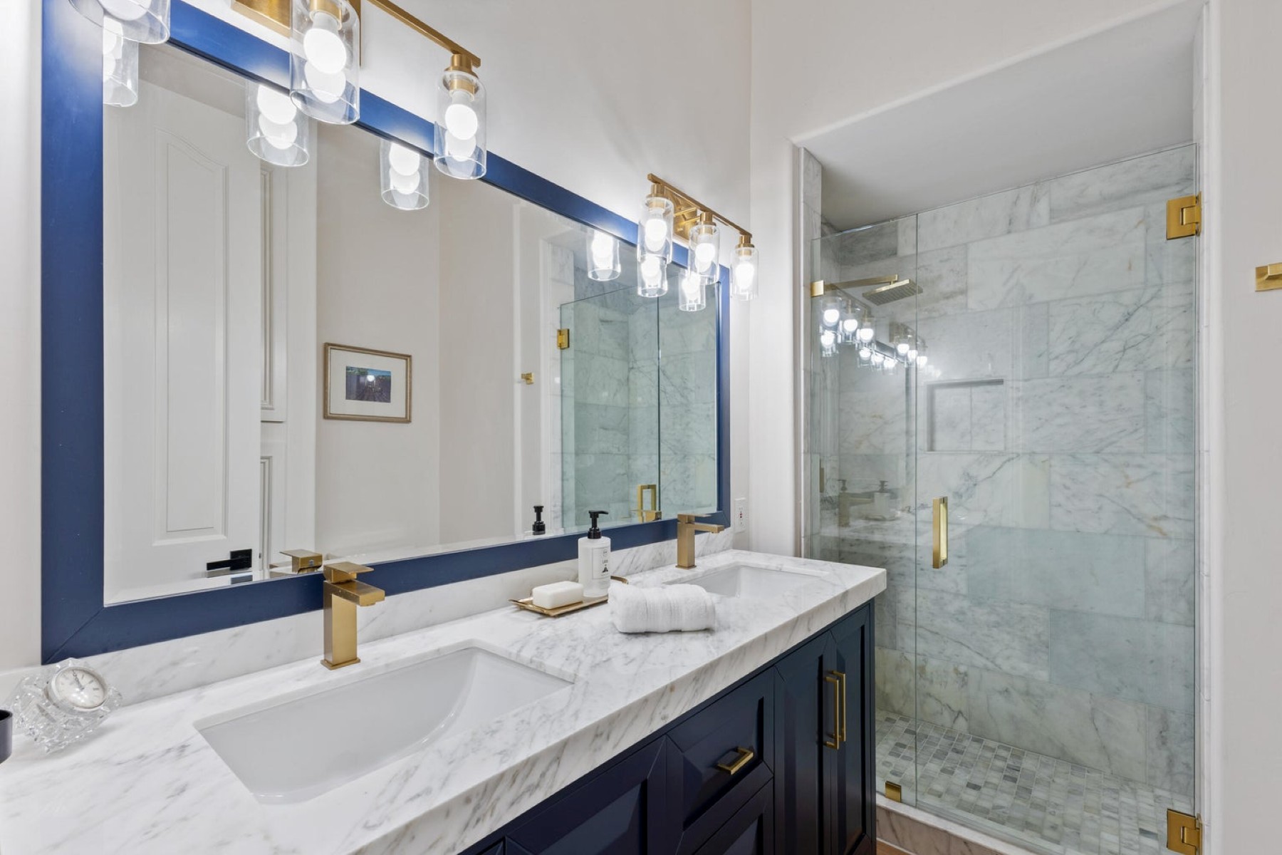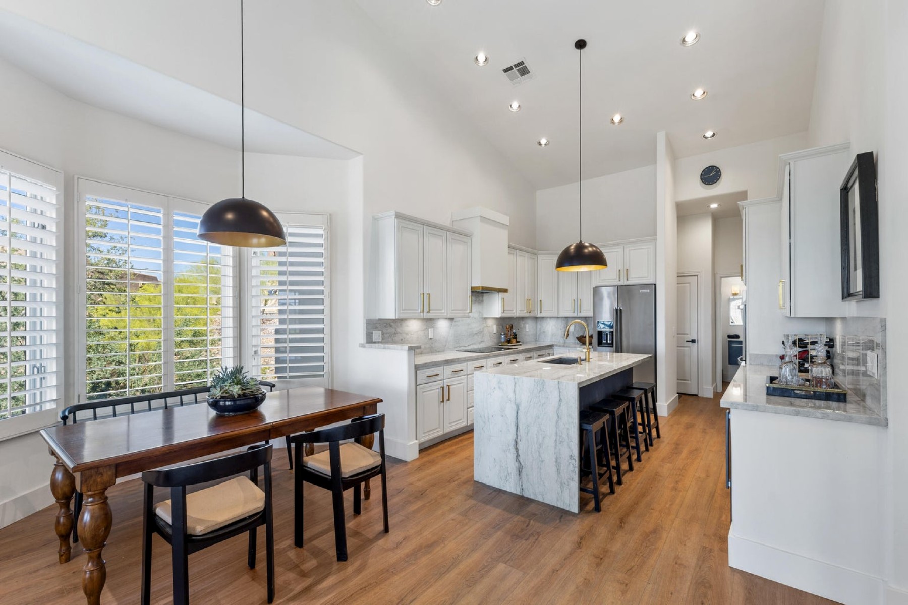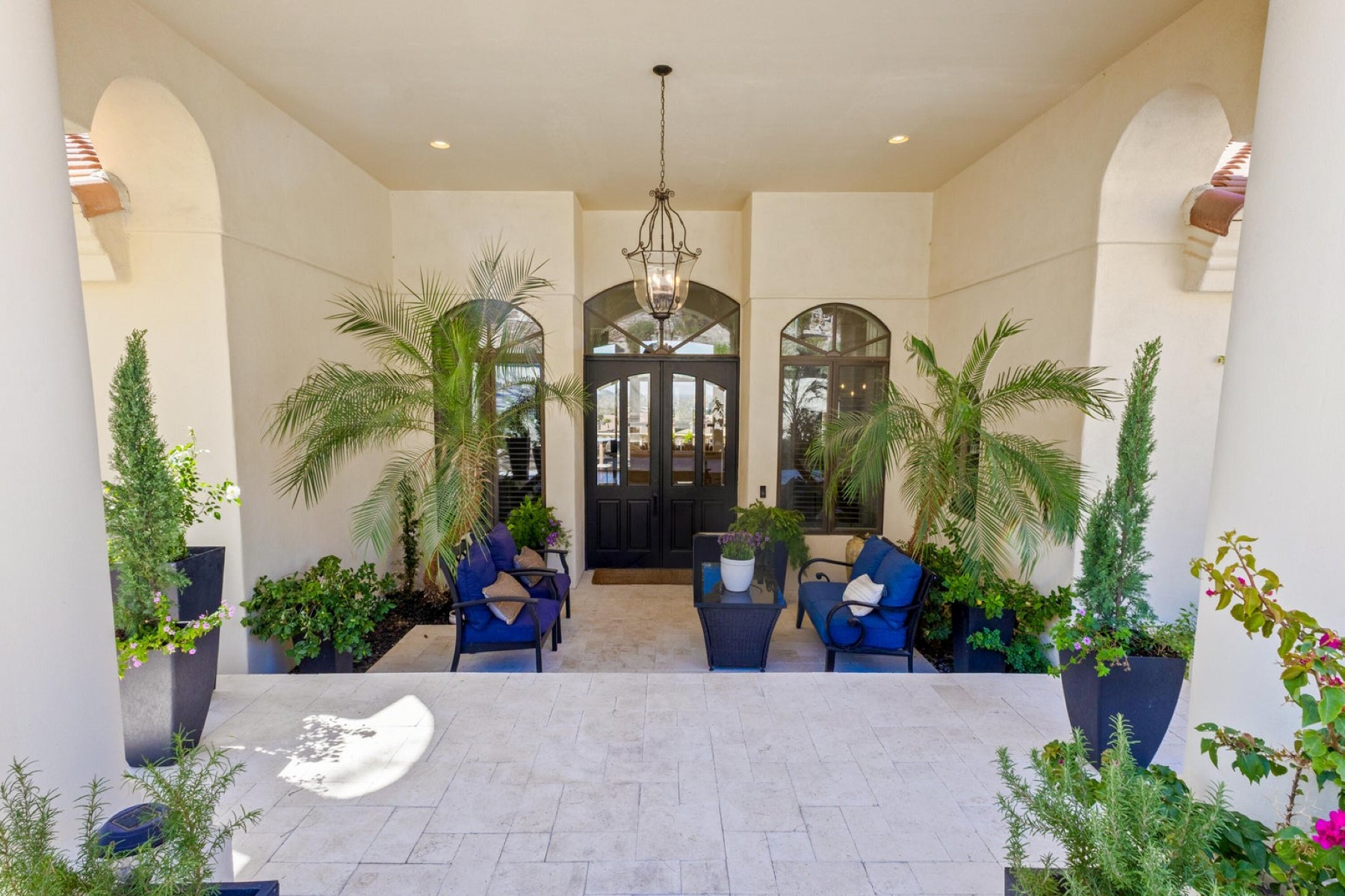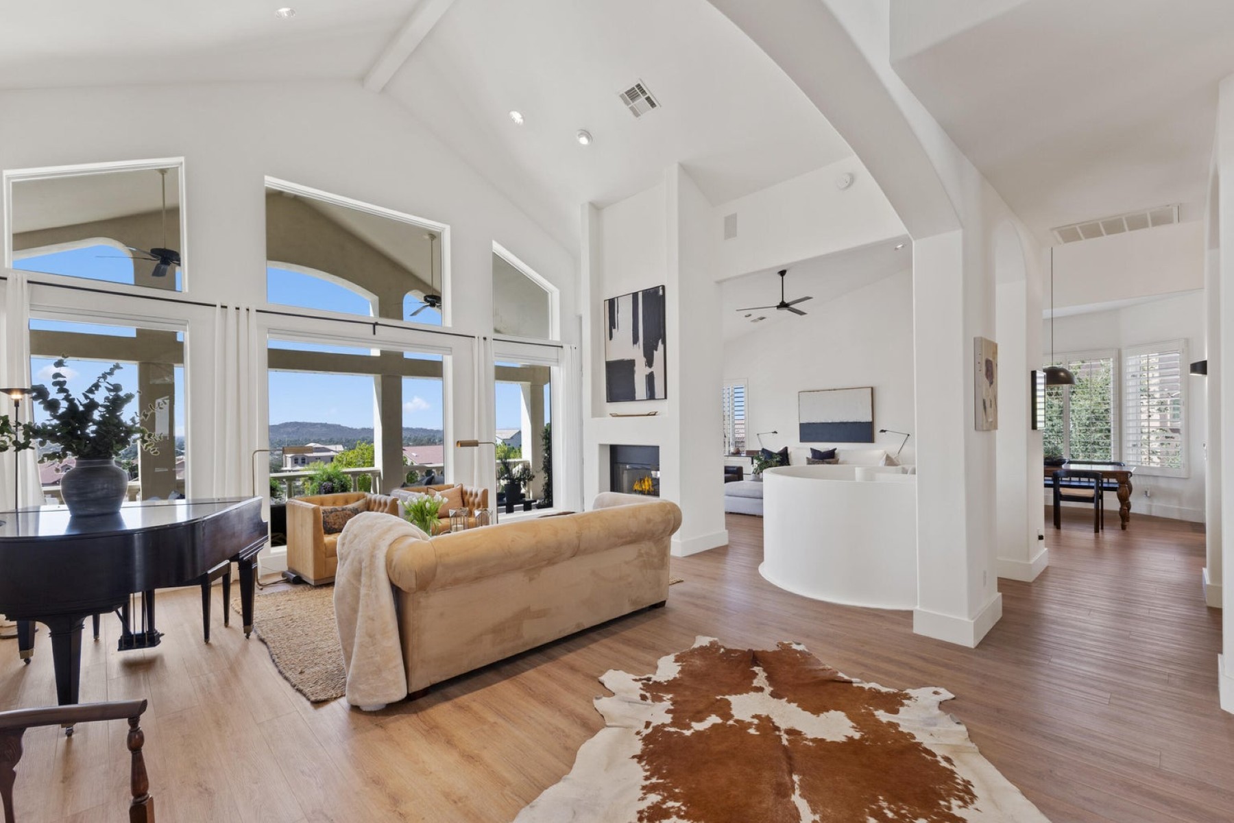 Experience breathtaking, panoramic views from every room on the main level of this masterfully renovated residence. Spanning over 4,600 sq ft, the home impresses with soaring cathedral ceilings and 10.5' minimum heights on the main floor. The heart of the home features a dramatic see-through fireplace connecting the elegant living and family rooms, both framed by captivating vistas. The kitchen serves as a culinary hub, featuring a center island and stunning quartzite slab counters. It is thoughtfully equipped with a beverage fridge and a dedicated coffee bar, making it as functional for morning routines as it is for evening entertaining. The main-level master suite is a true retreat, featuring a sitting area, fireplace, access to the balcony, dual walk-in closets, and a spa-like bath finished in exquisite Carrera marble. A dedicated den and guest bedroom complete the main level. The lower level maintains a spacious feel with 9' ceilings and includes two additional bedrooms, a full bath, and two entertainment spaces; one featuring a TV room with a full bar, and fireplace; while the other space creates a game room environment. Whether you are hosting on the expansive upstairs balcony or lounging by the pool--accessible from both levels--the indoor-outdoor transition is effortless. This home is a rare blend of scale, sophisticated designer finishes, and tranquil scenery. From the Carrera tile to the quartzite surfaces, every detail has been curated for a turnkey luxury lifestyle.