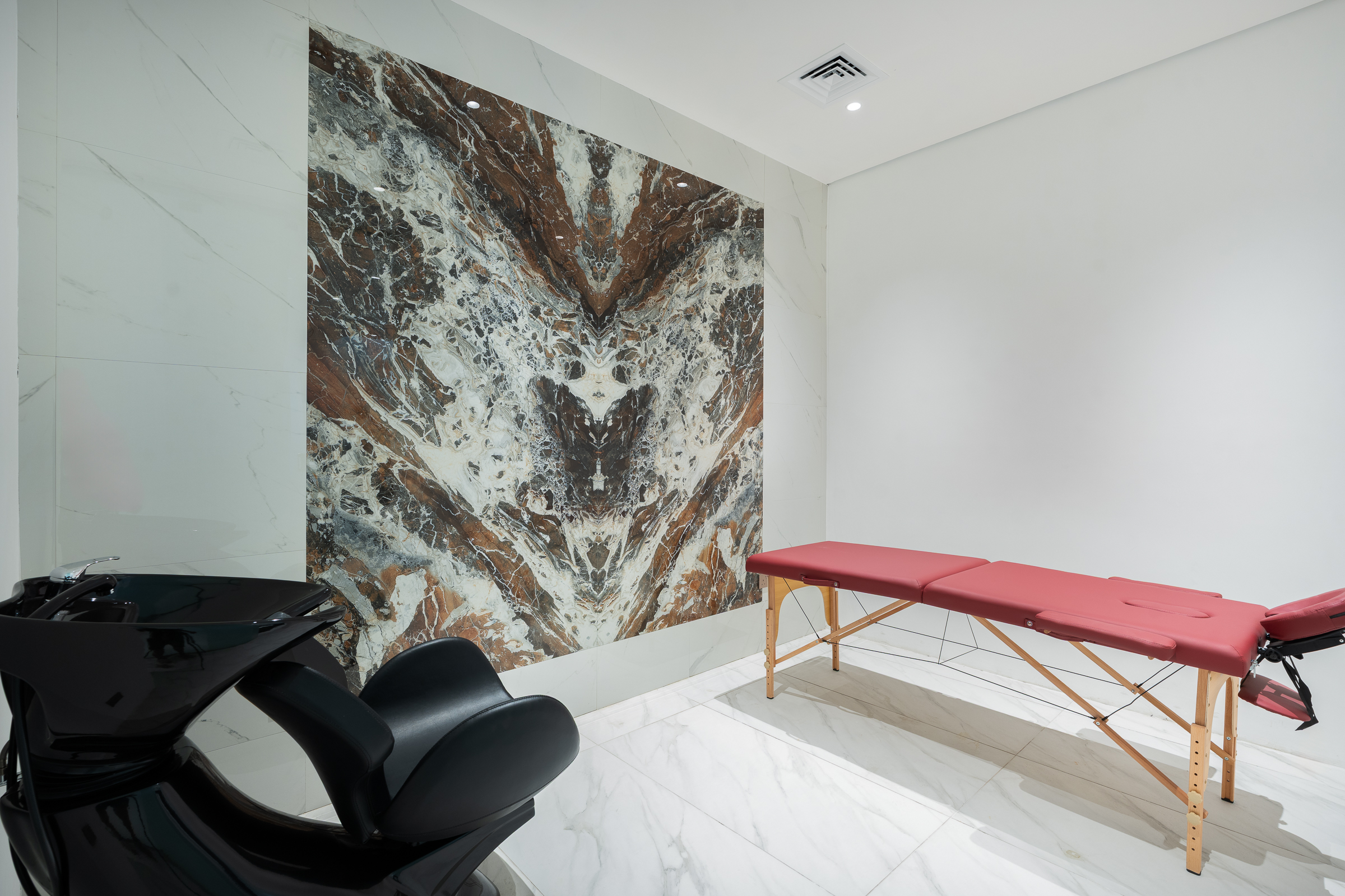 The exterior, finished in silver travertine and Limra limestone, sets the tone for interiors crafted from the finest materials. Calacatta, Onyx and Patagonia marble flow throughout, accented by subtle metallic touches, while Roberto Cavalli wall coverings enrich the main living spaces and Spanish chandeliers introduce understated grandeur.