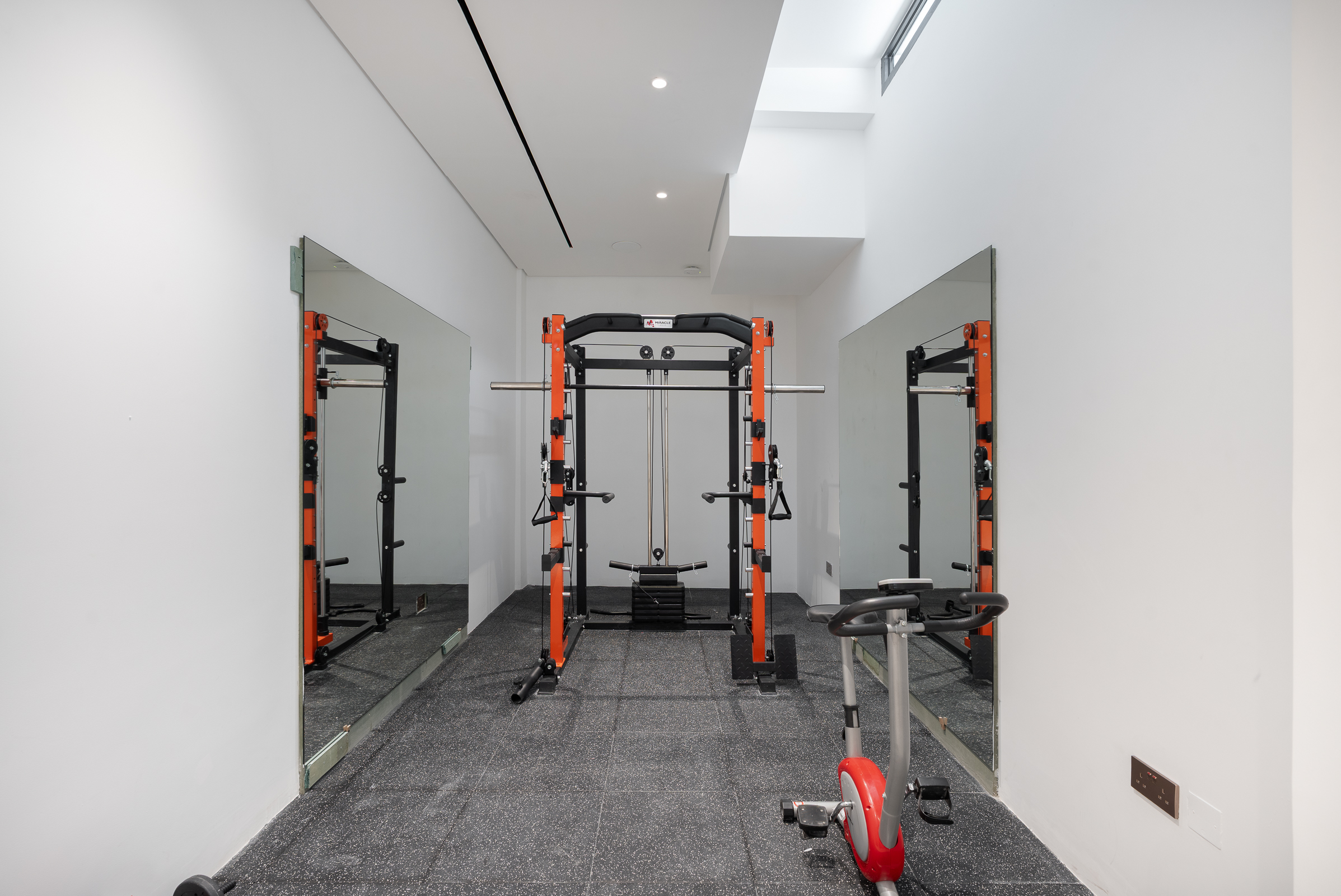 The basement is designed as a leisure retreat, complete with a golf simulator, gym, massage room and private hair salon, alongside a five-car garage with a car lift. At the top of the home, a spacious lounge and bar create a penthouse-style setting that extends onto an outdoor terrace. Smart home automation and integrated indoor-outdoor speakers enhance modern living, with all four levels seamlessly linked by a glass lift and dumbwaiter.