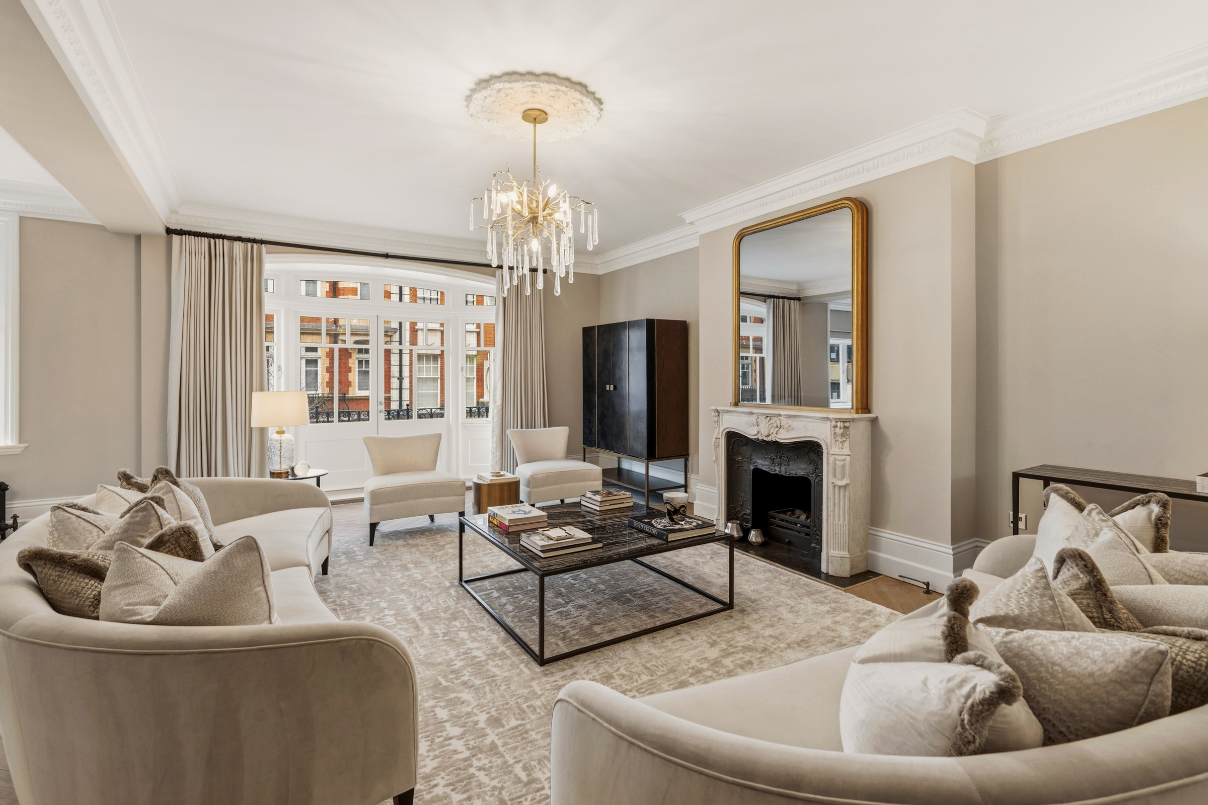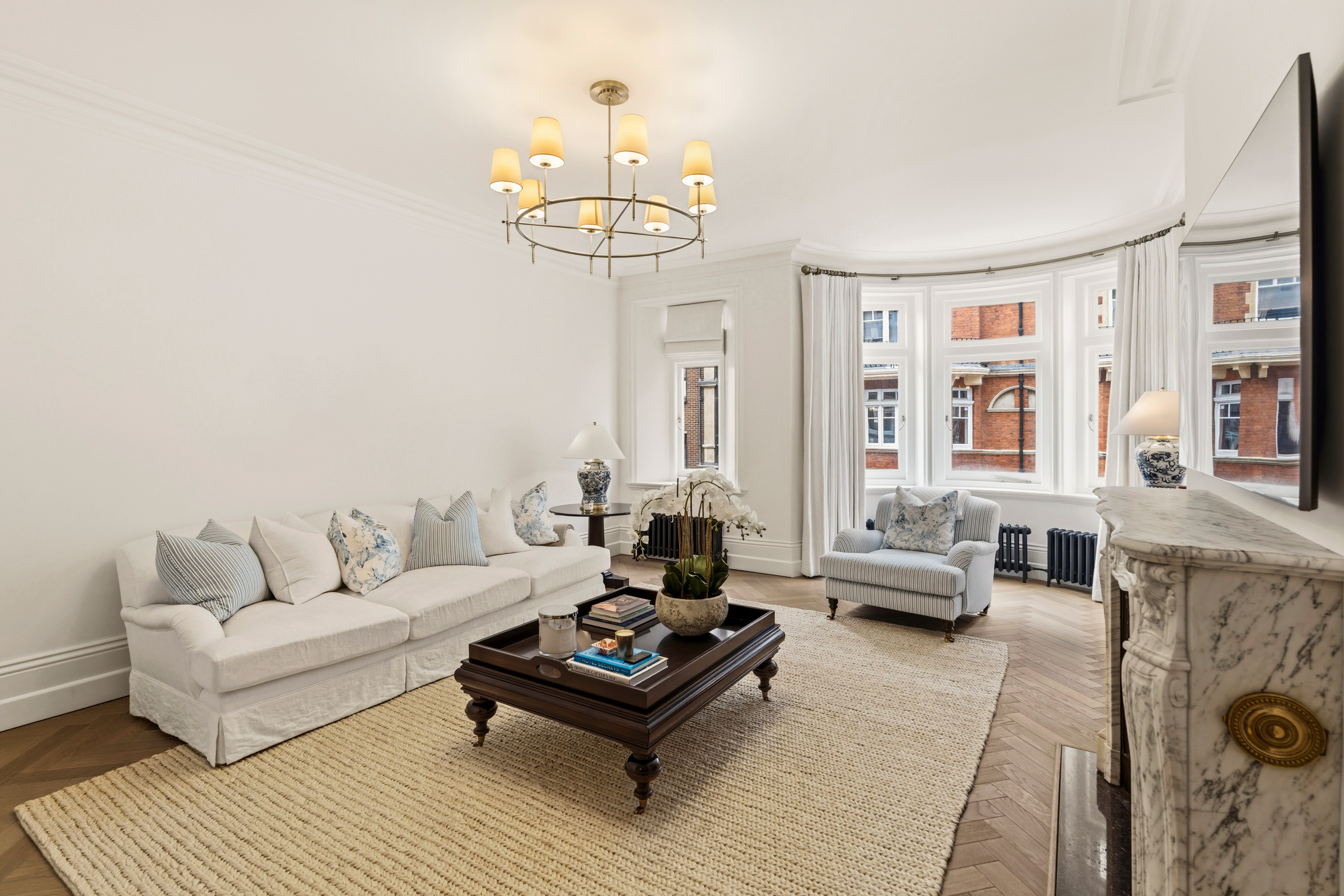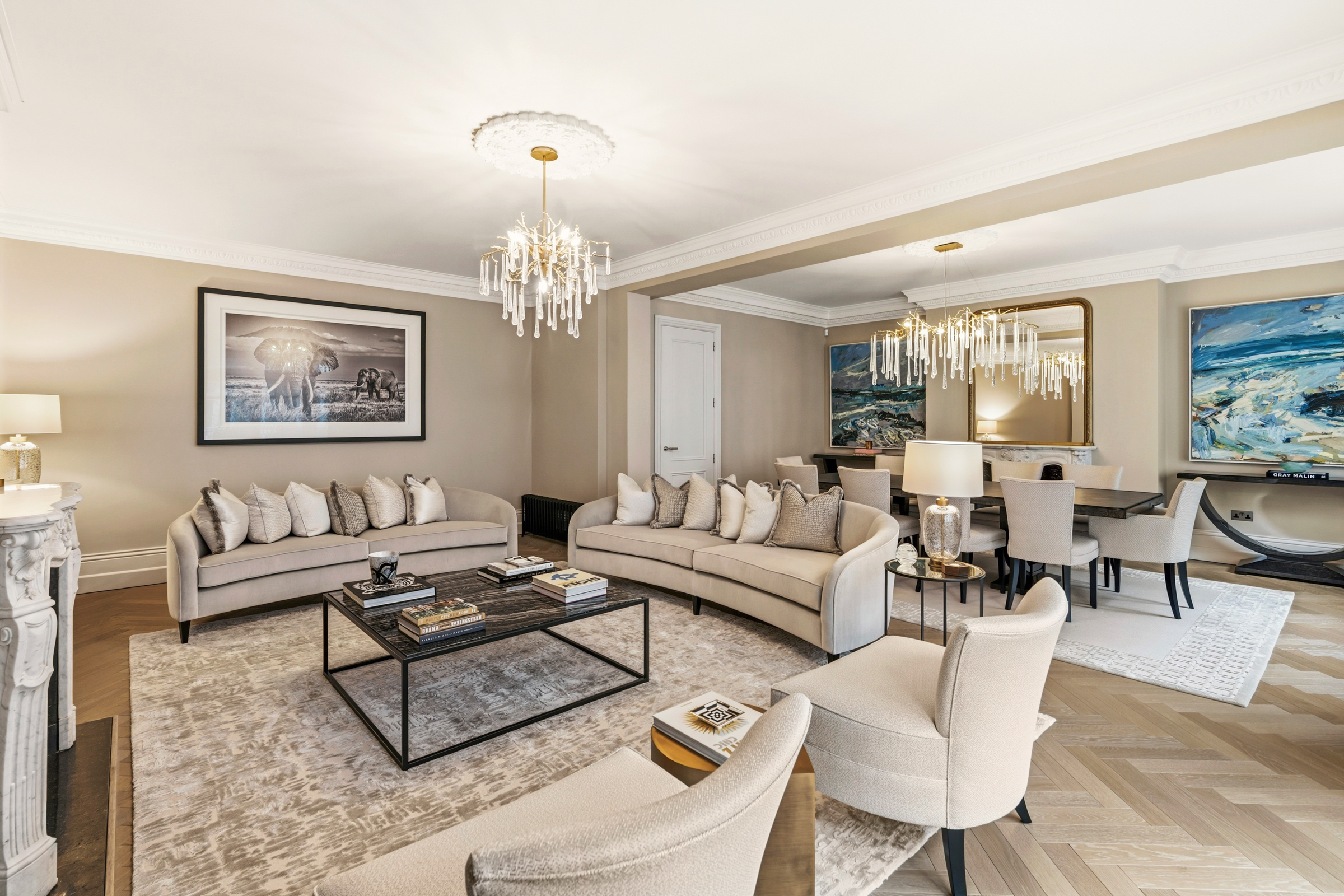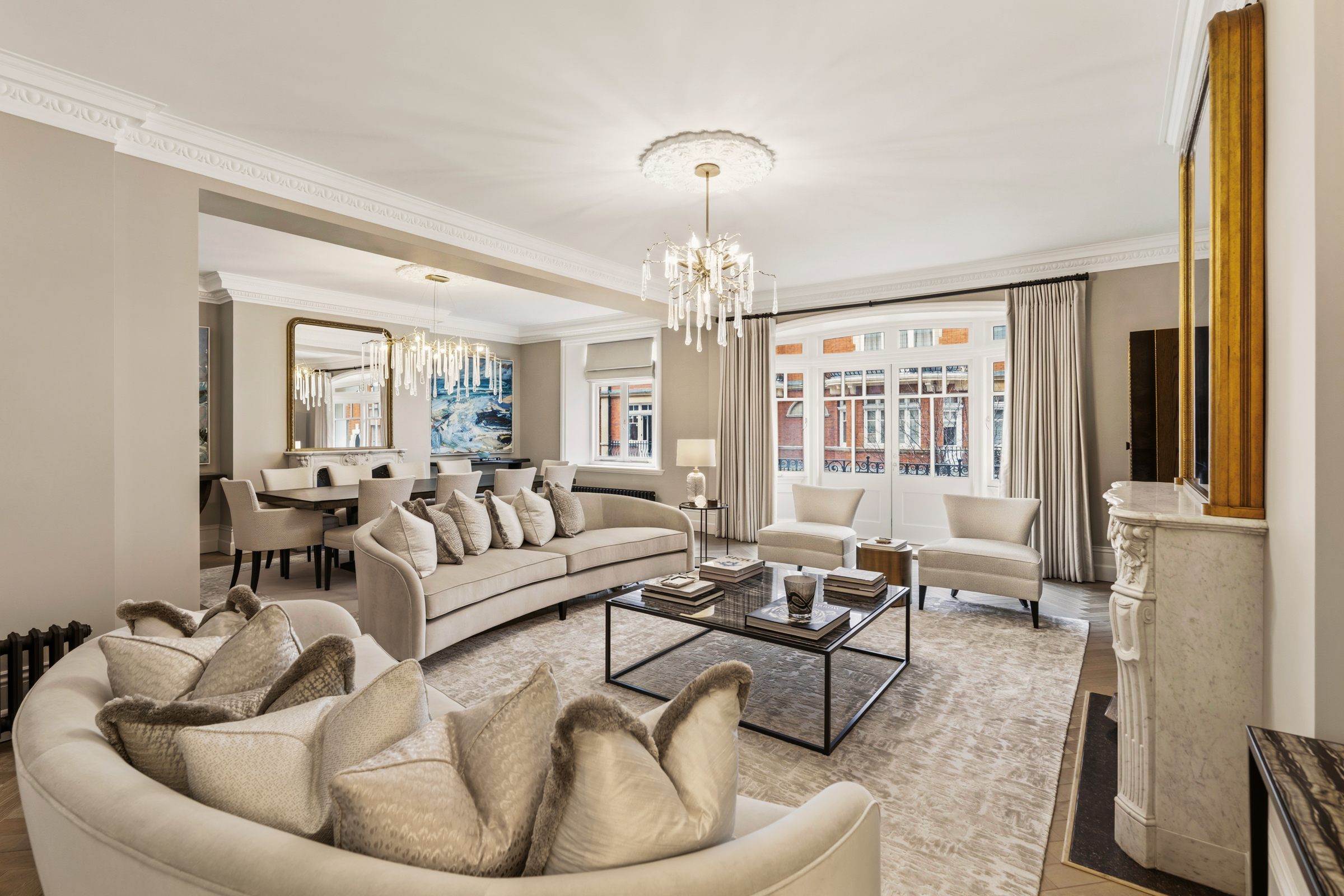 The layout is particularly well balanced for both entertaining and everyday life. At the front of the apartment, a magnificent reception room extends across the curve of the building, its wide bay window drawing in natural light and opening onto a private balcony. The room connects to a generous dining room, creating a suite of reception spaces that can be used formally or informally. A second reception room sits beyond, offering a more intimate sitting room or television room.
