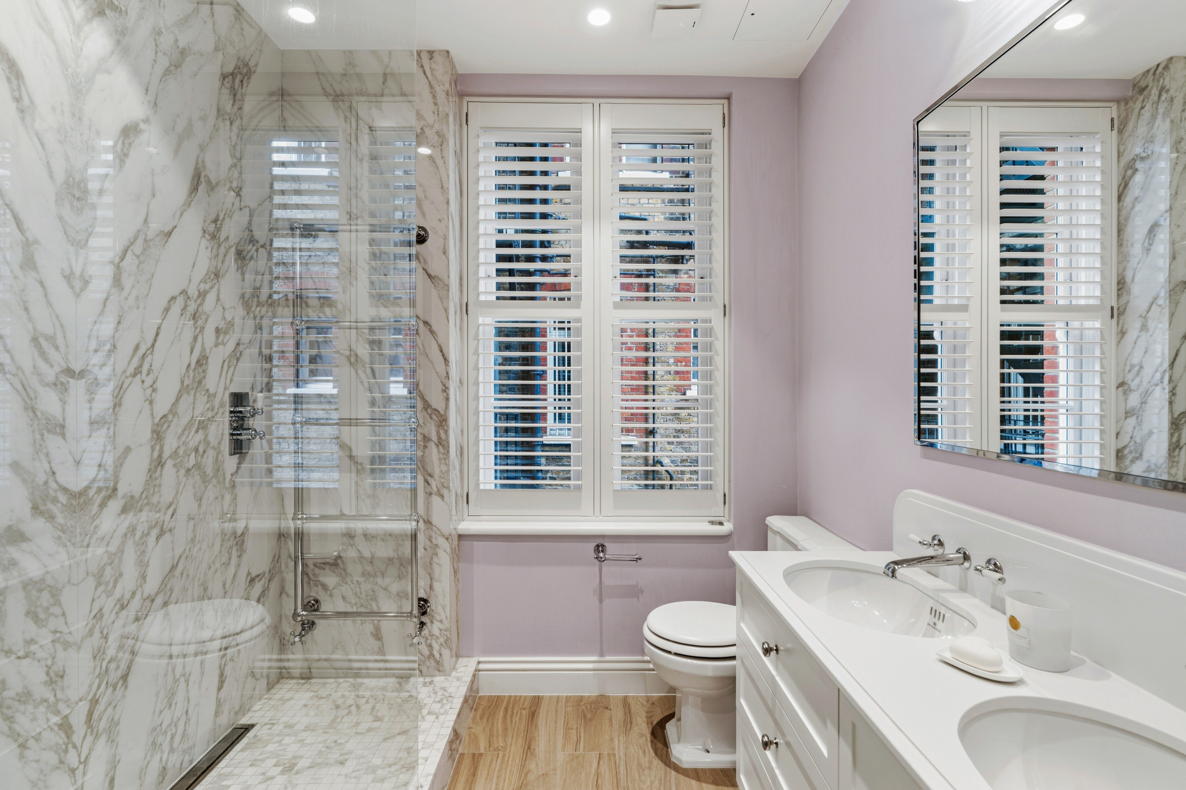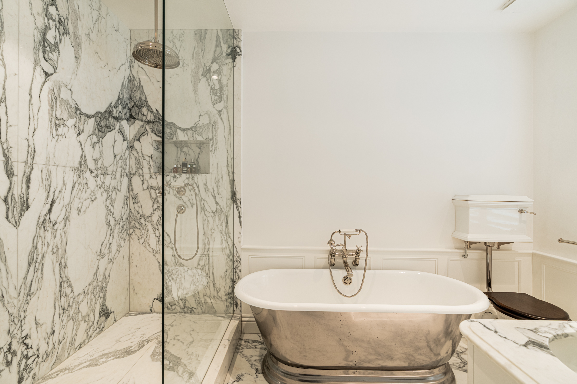 The sleeping accommodation is arranged along the other side of the apartment. The principal bedroom occupies a striking corner position with a large bay window and extensive built-in wardrobes, served by an ensuite bathroom with freestanding bath and separate marble-lined shower. Two further double bedrooms are well proportioned and share a beautifully finished family bathroom, while a fourth room currently configured as a study could easily serve as an additional bedroom if required.