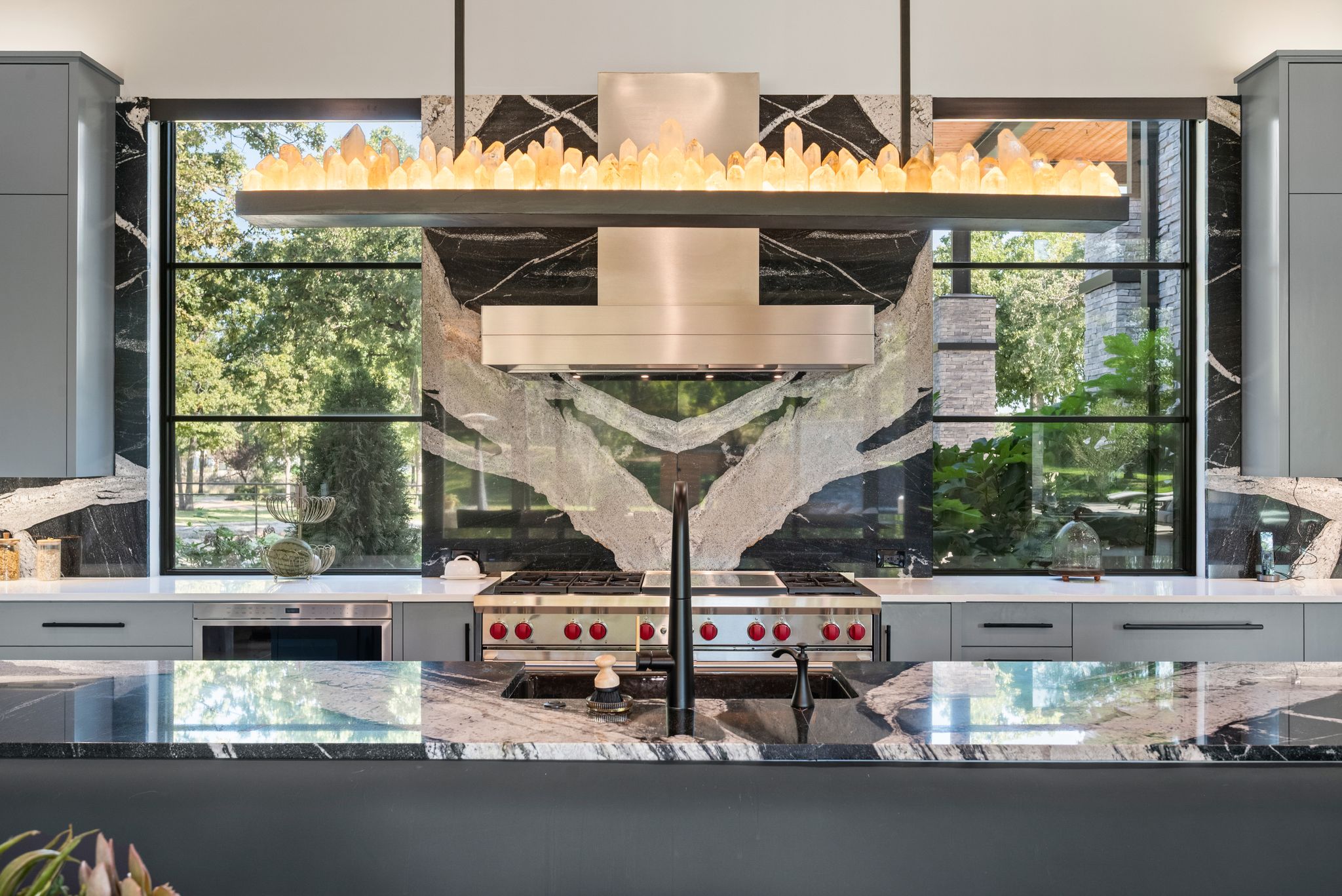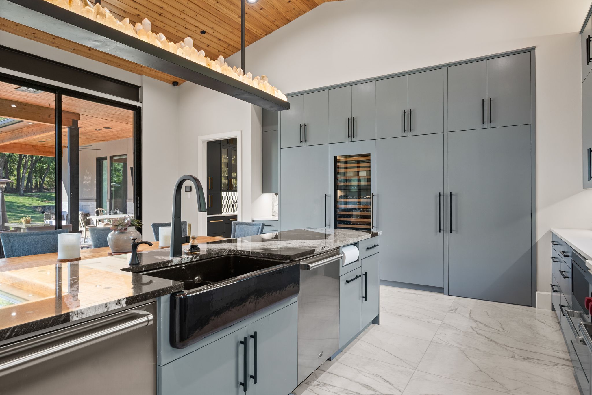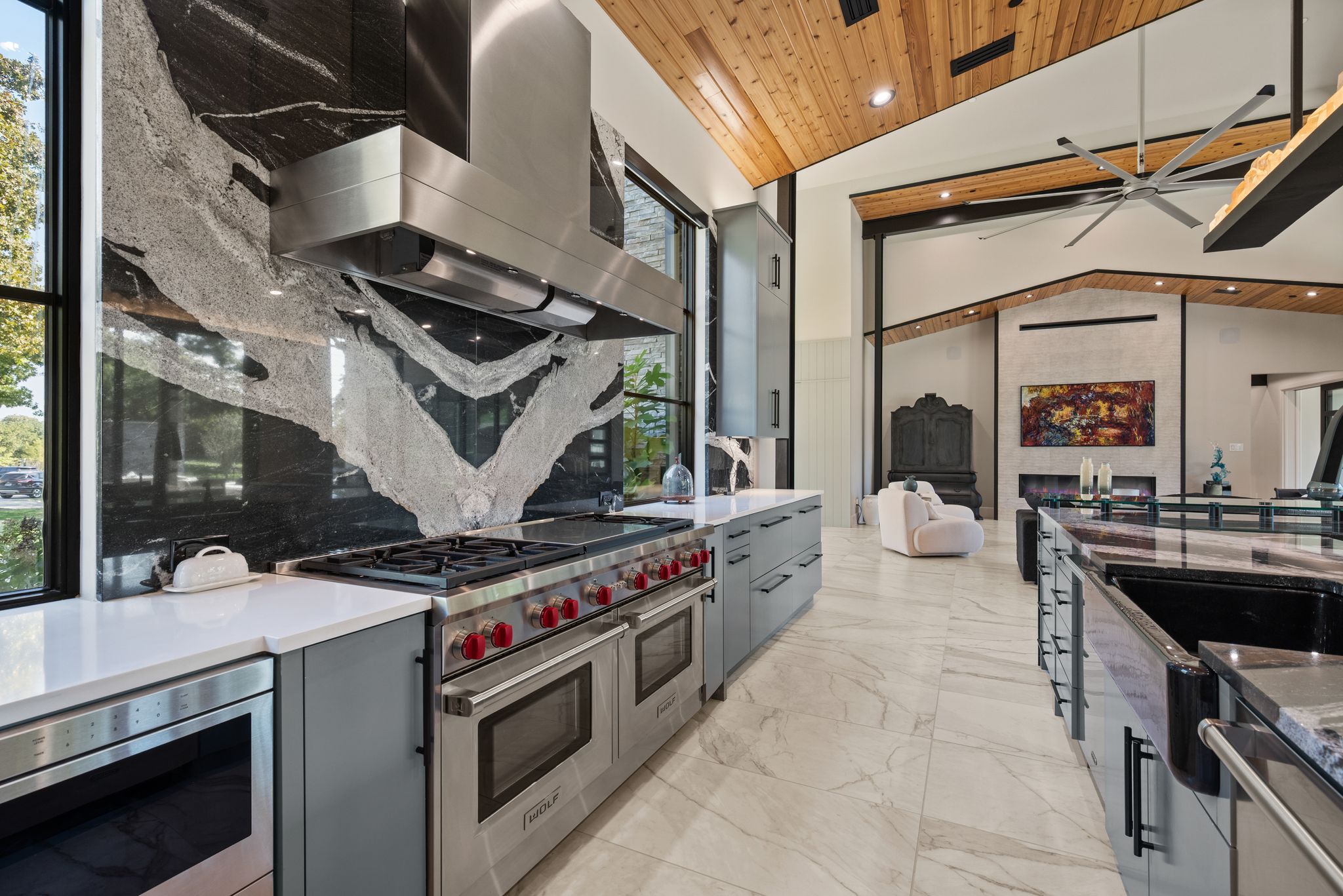 Priced to encourage strong interest. Experience modern luxury on 2 private acres in the prestigious Hat Creek Estates of Bartonville, Texas. This single story architectural masterpiece blends sleek contemporary design with warm natural elements, offering an inviting yet sophisticated retreat behind a gated entrance and circle driveway that leads to a grand entryway. Inside, dramatic ceilings, cedar-paneled accents, and expansive walls of glass create a seamless connection between indoor and outdoor living. The open-concept layout showcases a stone fireplace in the living room and a chef-inspired kitchen featuring a dramatic natural stone island, built-in wine cooler, dual dishwashers, hidden butler’s pantry, Sub-Zero refrigerators, Wolf gas range, and wet bar. Accordion glass doors open to the backyard oasis, where resort-style amenities include a sparkling pool, cascading water features, and multiple lounge and dining areas for gatherings. A game room opens directly to the patio area, while the nearby media room offers an ideal space for movie nights or game-day viewing. The luxurious primary suite is a private sanctuary with his-and-her walk-in closets, a spa-like bathroom featuring dual shower heads, separate vanities and an exercise room off the primary bath, with the laundry room conveniently connected to the walk-in closet. Car enthusiasts and adventurers alike will appreciate the impressive 8-car garage with a Tesla charging station and dedicated RV-boat parking. The detached 1,755-square-foot guest house—located off the RV garage—includes 2 bedrooms, 2 bathrooms, walk-in closets, its own living and dining area, and a full kitchen, perfect for extended family or guests. Every detail of this home exudes sophistication and comfort, from designer finishes throughout to its thoughtful layout designed for seamless living and entertaining. With its refined craftsmanship, privacy, & resort-style amenities, this estate represents the pinnacle of Bartonville luxury living.