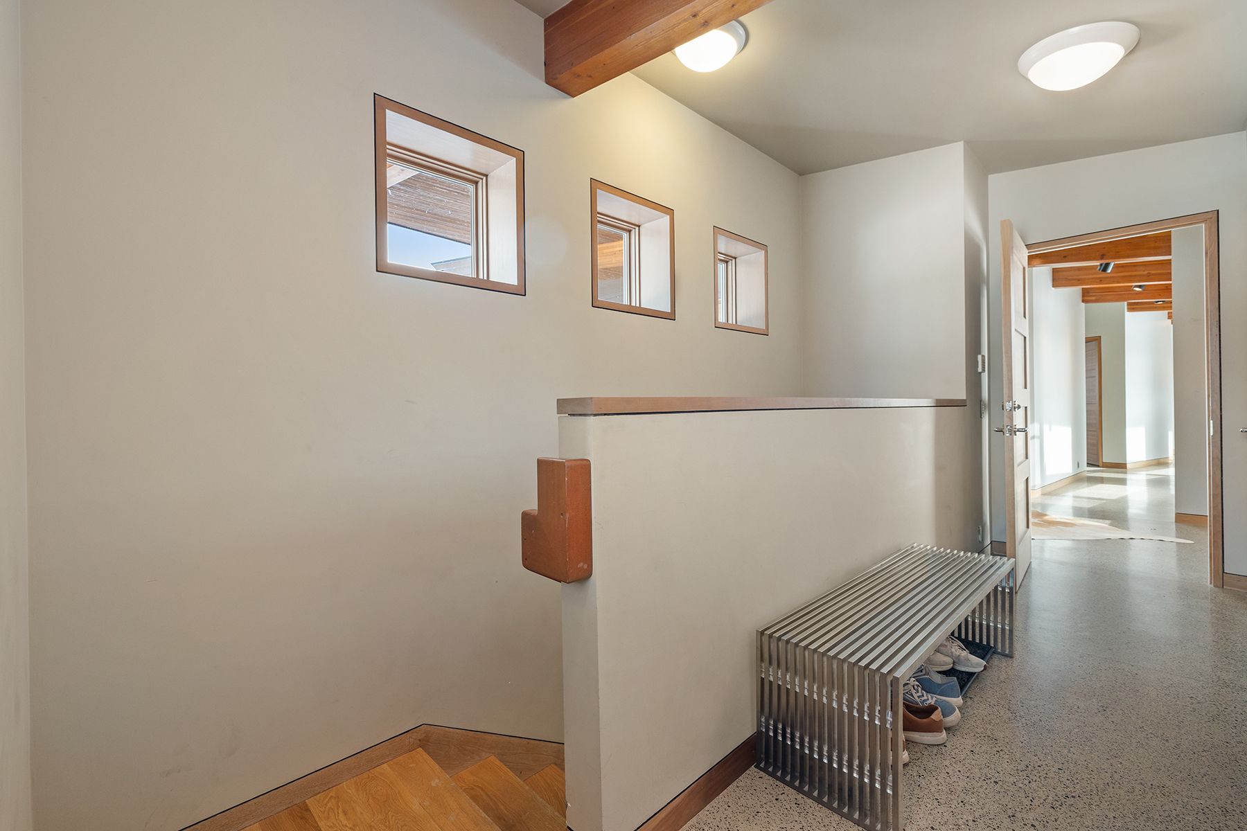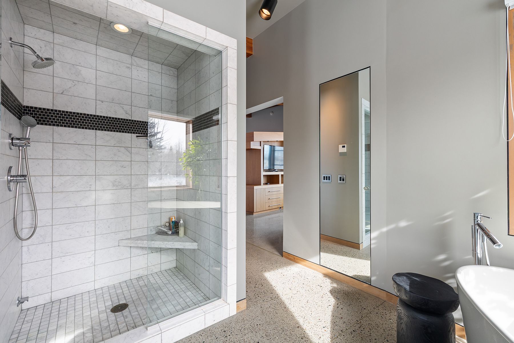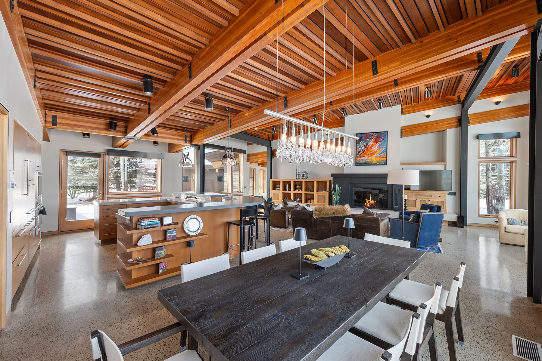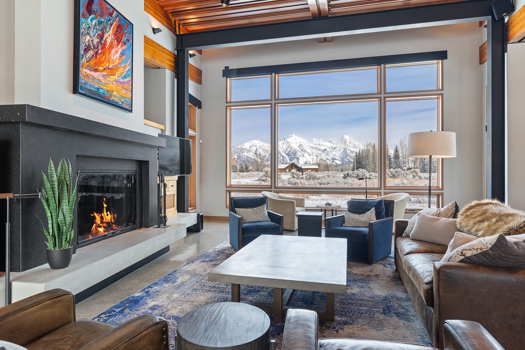 Designed to engage the mountainscape at every turn, this four-bedroom, four-bathroom residence is carefully positioned to capture commanding Grand Teton views and welcome natural light through expansive south-facing glass. The great room, kitchen, and dining area unfold in an open arrangement that supports both daily living and relaxed entertaining. Wood ceilings, polished concrete floors, and stone surfaces create a material palette that feels both grounded and refined, while custom cherry cabinetry and built-ins lend warmth throughout. Thoughtfully designed for efficiency as well as beauty, the LEED-certified home incorporates a ground-source heat pump, evacuated-tube solar hot water panels for domestic use, photovoltaic panels, and an energy recovery ventilation system.