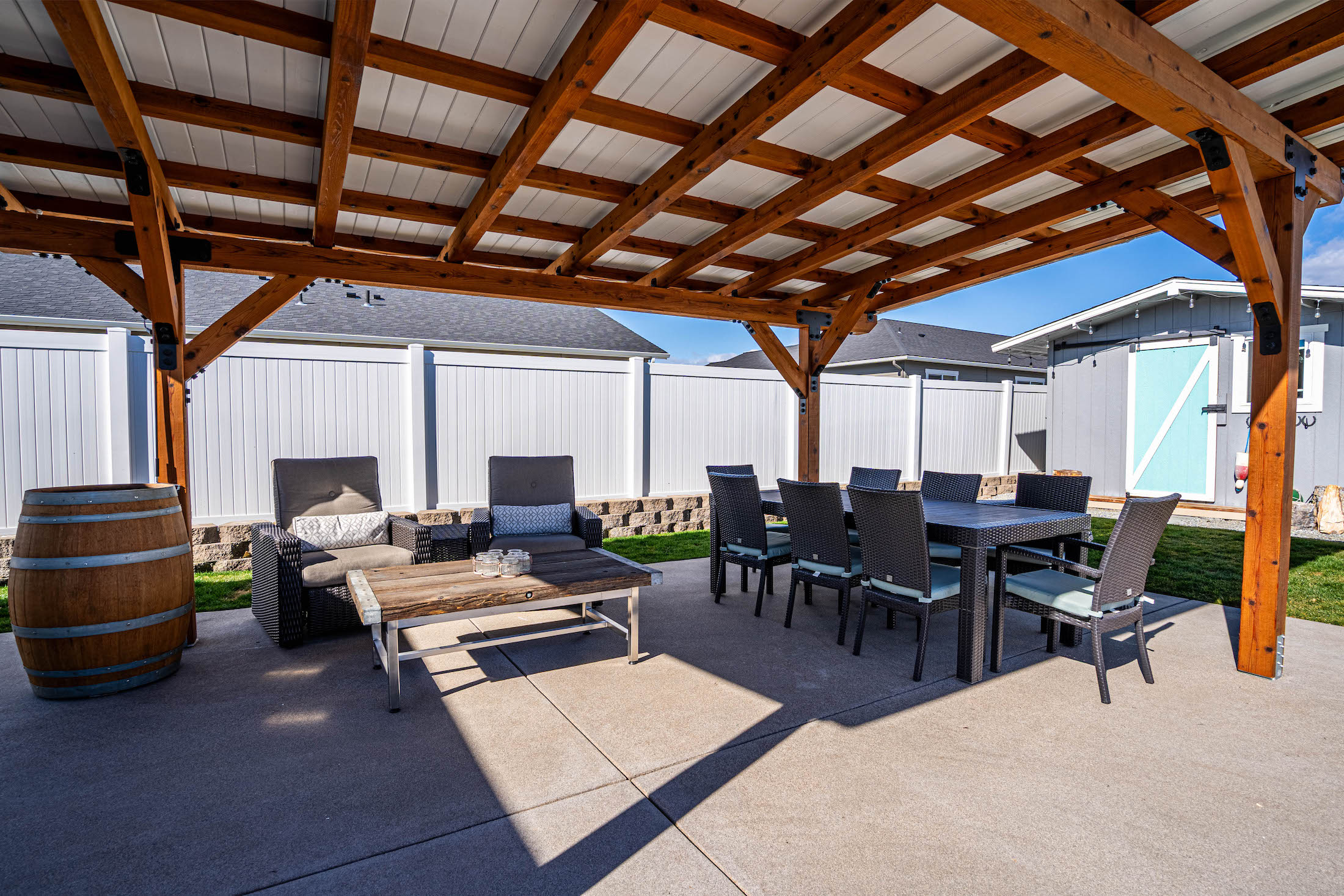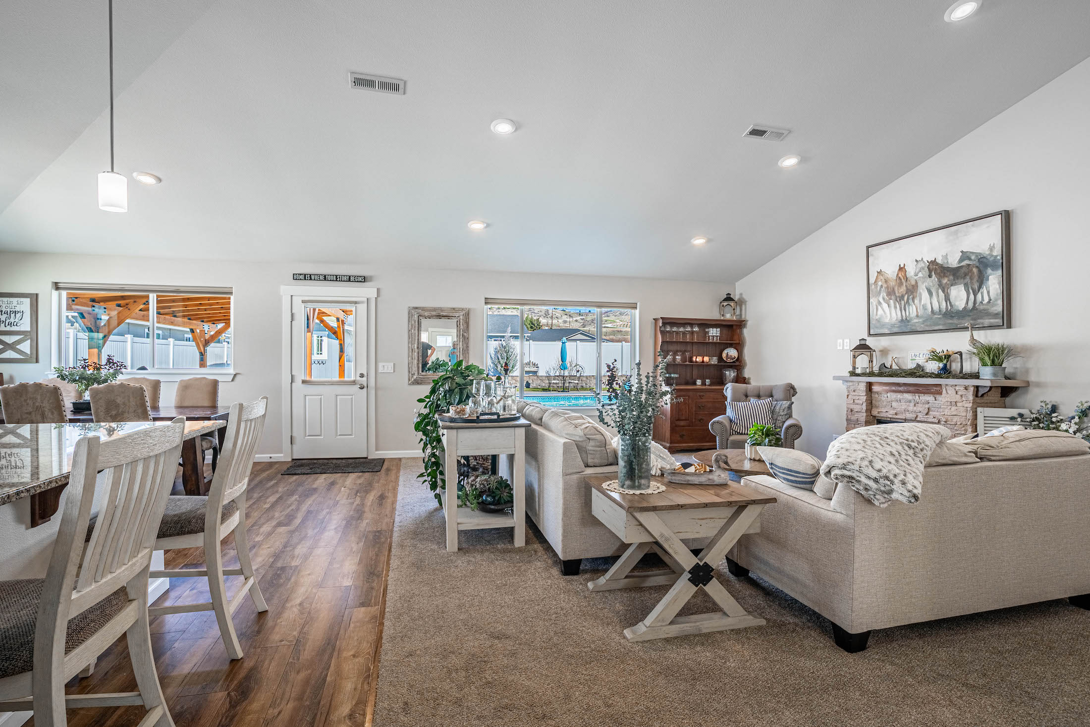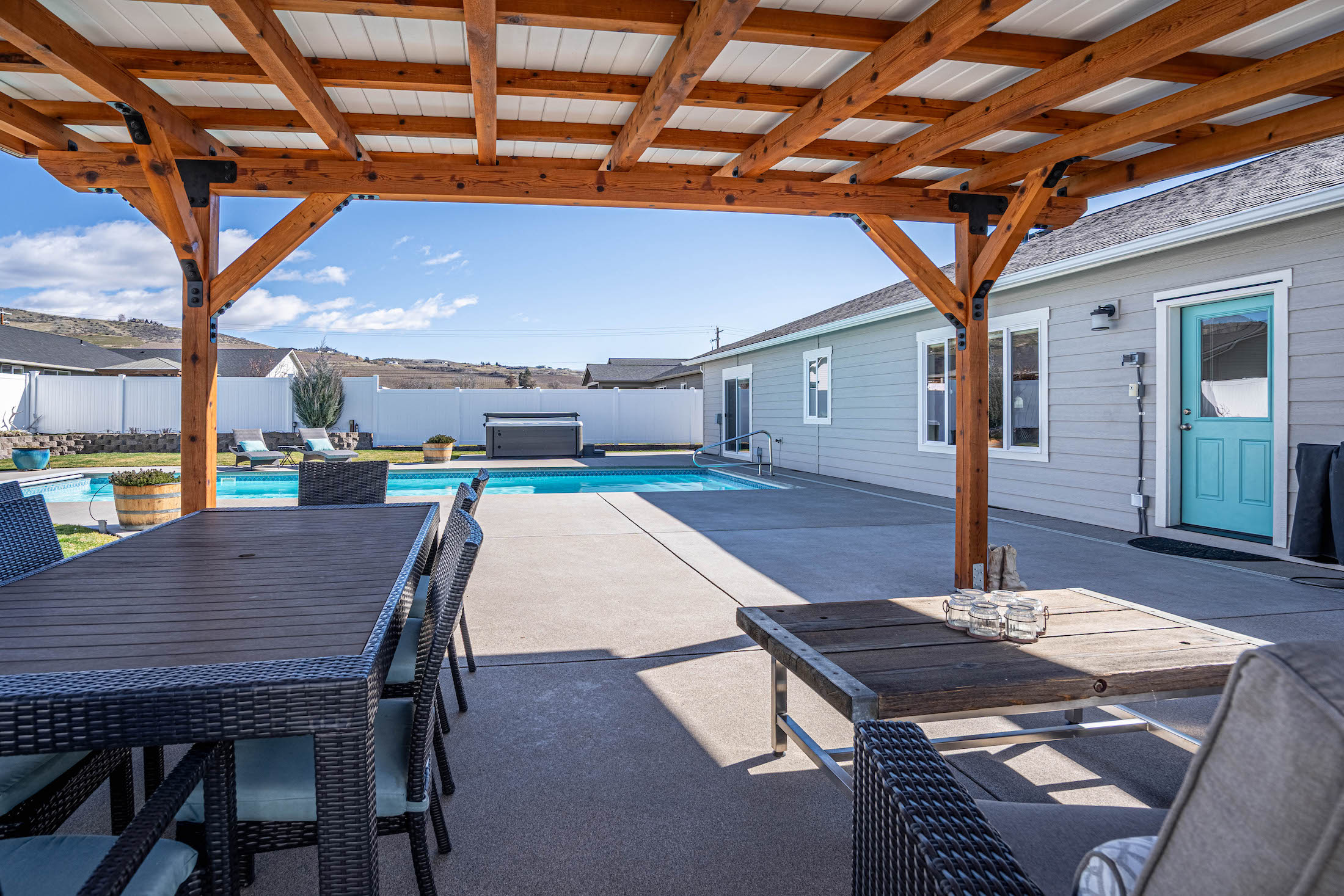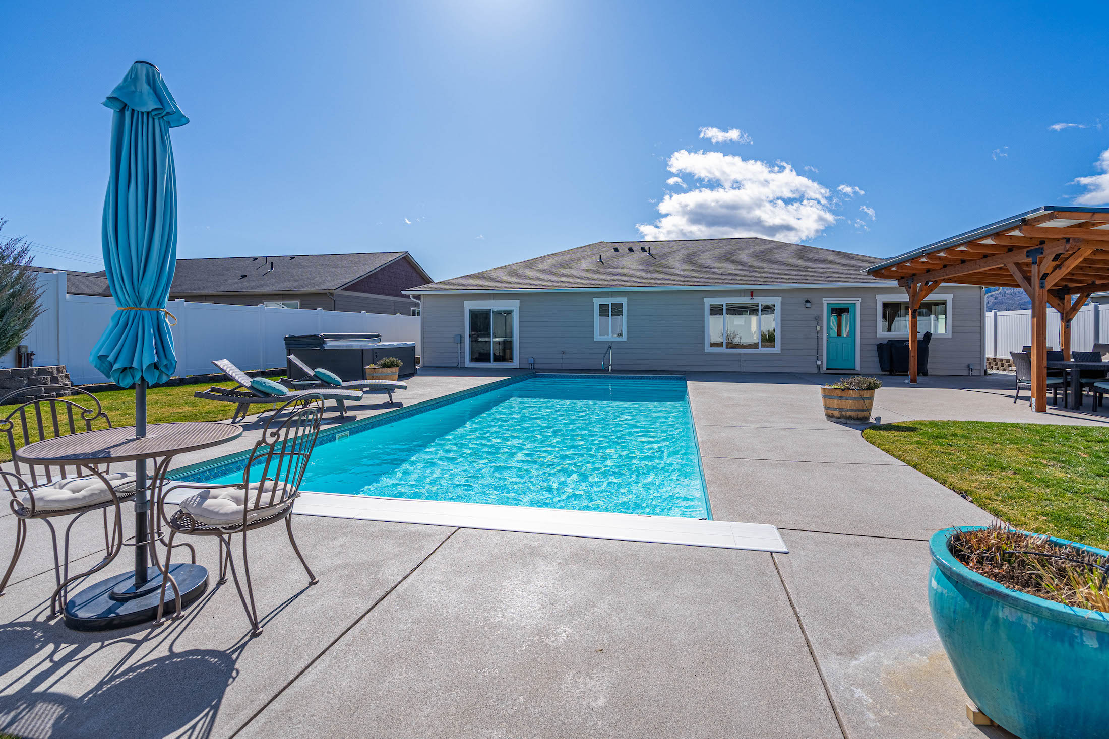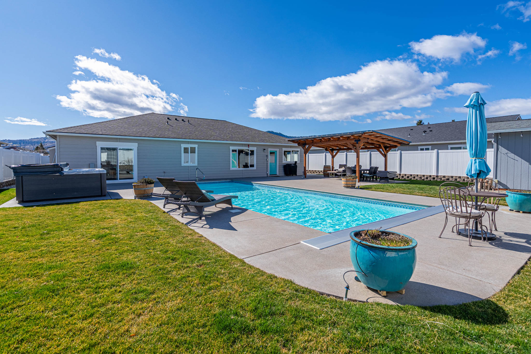 Beautifully maintained single-level Craftsman built in 2019 featuring one of the most impressive backyard retreats in Manson. Designed for indoor-outdoor living, this property offers a true resort-style setting with an amazing heated and cooled 16x40 in-ground pool, relaxing spa, expansive concrete patio with a sand finish, and a custom timber pergola ideal for shaded outdoor dining and entertaining. Inside, the open-concept floor plan showcases quality finishes throughout including quartz countertops, soft-close cabinetry, black cafe appliances, and a spacious eat-in kitchen centered around an oversized island perfect for gatherings. The main living area flows seamlessly to the backyard creating an inviting space for entertaining year-round. The primary suite offers a peaceful retreat with a generous walk-in closet and a beautifully appointed five-piece bath featuring a soaking tub and custom tile shower and its own private access to the back yard spa area. The fully landscaped and fenced backyard provides privacy while remaining low maintenance with an automatic sprinkler system and matching garden shed. Additional highlights include a two-car garage and dedicated boat trailer parking. Located in the desirable Manzanita Court neighborhood on Bennett Road just moments from the Manson waterfront, public beach, boat launch, wineries, and restaurants, this home offers the very best of the Lake Chelan lifestyle.