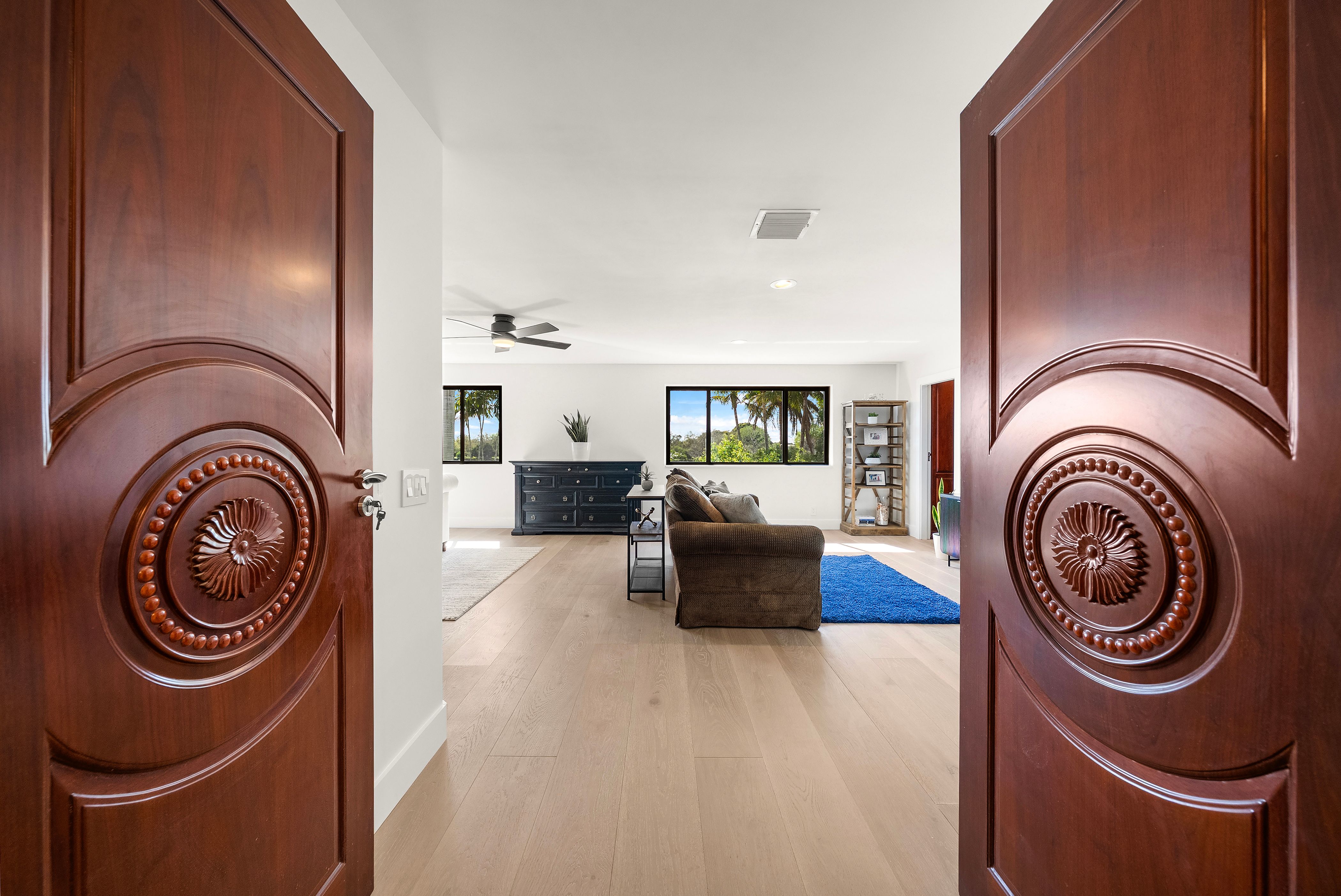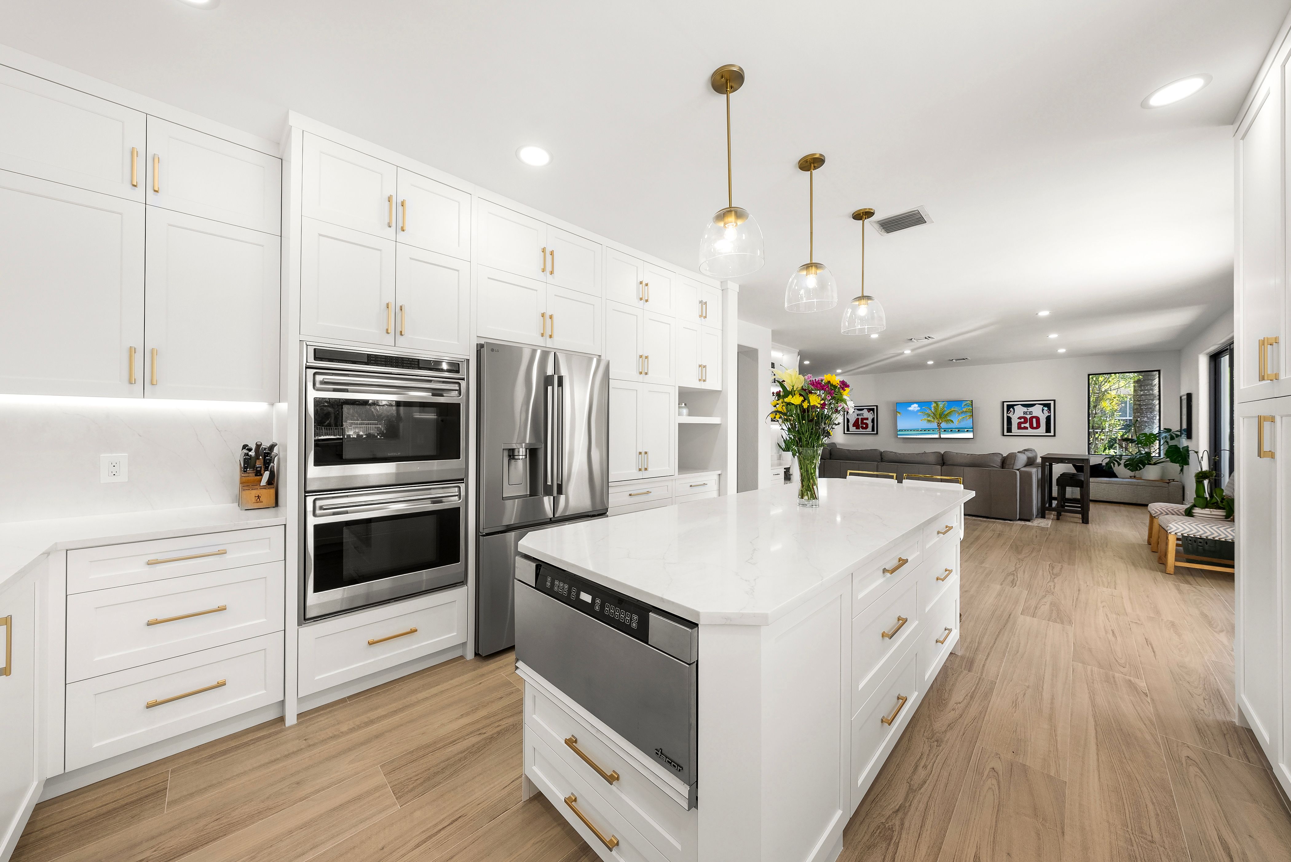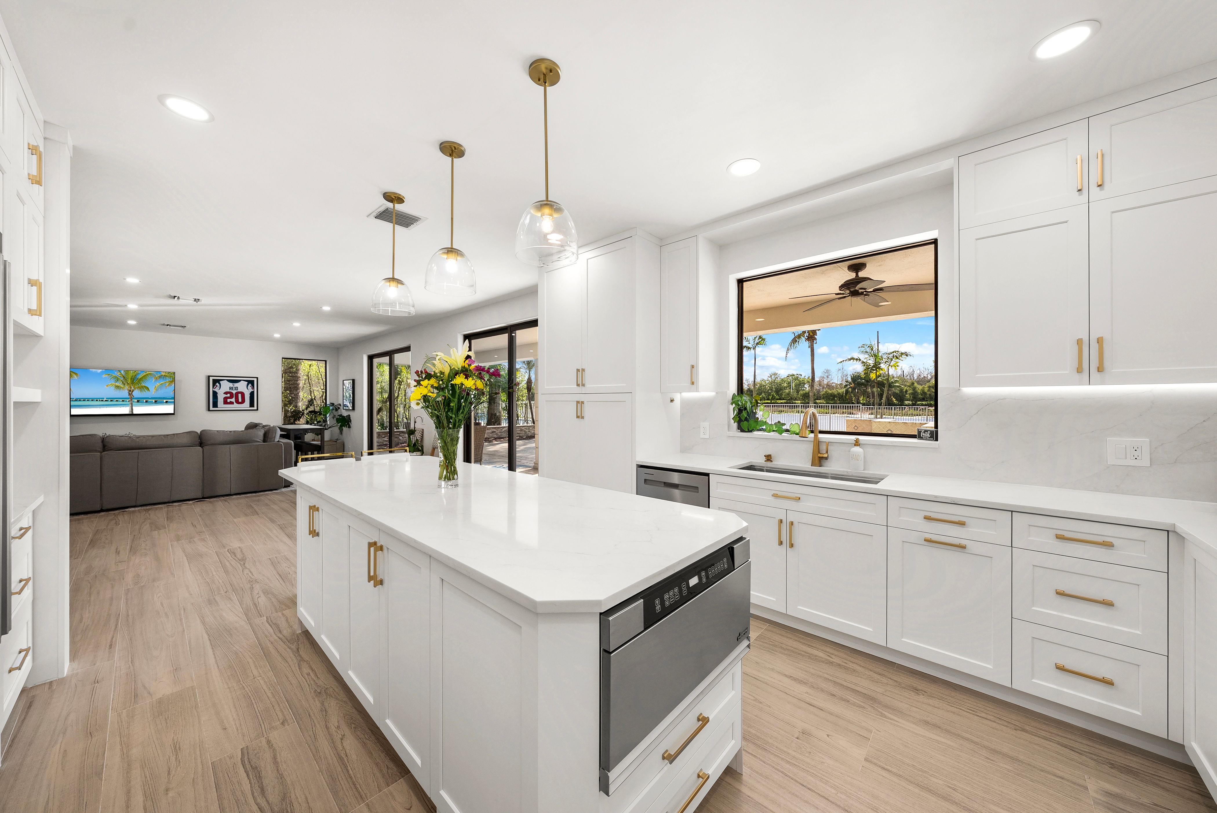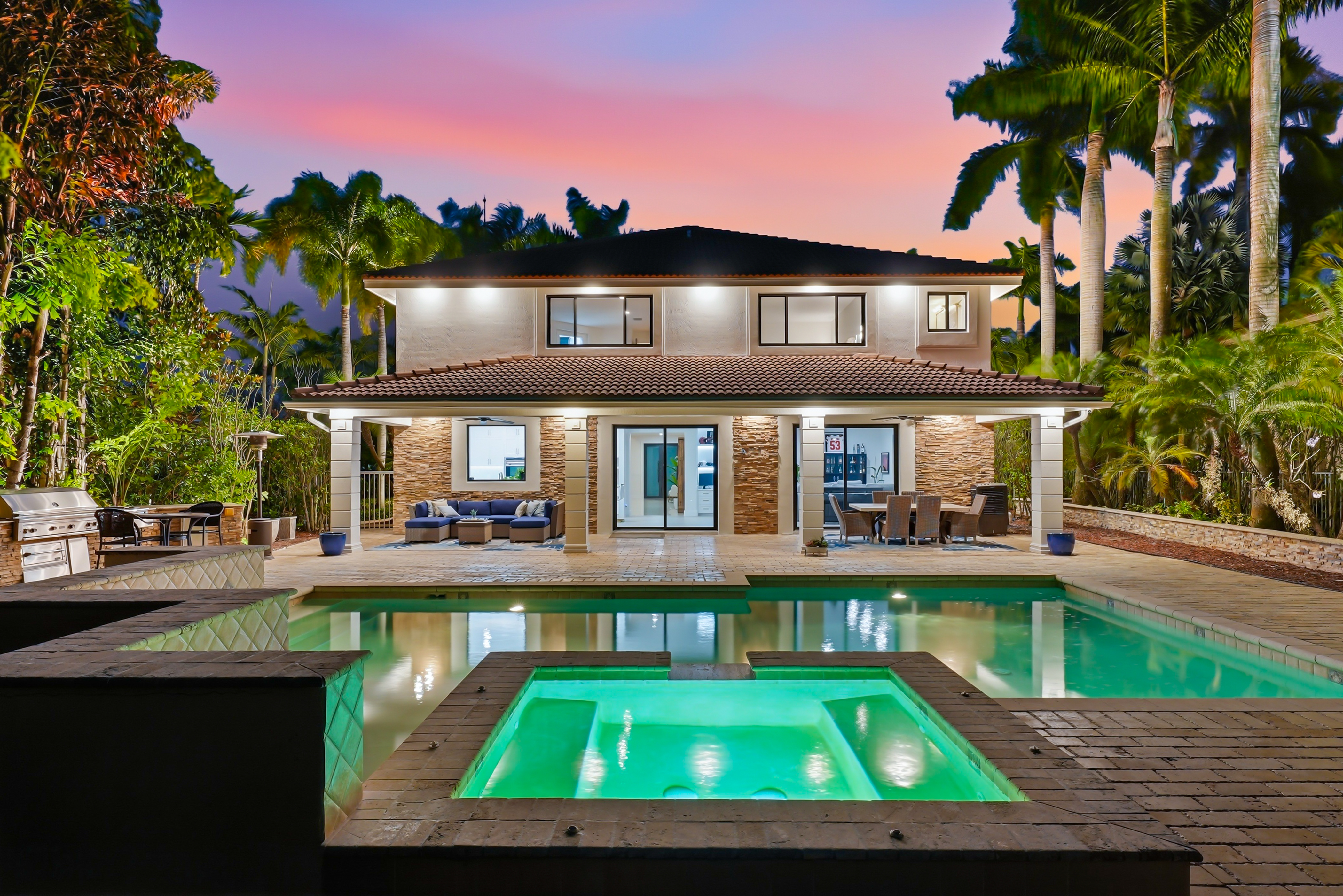 Luxury meets legacy at this entirely transformed 4-bed, 4-bath residence with a story as compelling as its design. Originally crafted by an NFL player, the property was recently elevated by a Miami Dolphins coach, who spent nine months thoughtfully upgrading each space to reflect modern luxury and effortless comfort. Plans changed, and now their dream home becomes your opportunity. Located in the prestigious gated Weston Hills community, this home sits on an expansive corner lot, where you are immediately greeted by a private courtyard and elegant circular driveway that set the tone for what’s inside. The home features new impact windows throughout, fresh paint and new flooring to create a clean, contemporary feel. The heart of the home is a stunning high-end kitchen with a dramatic 9-foot island, premium stainless-steel appliances, and a layout ideal for entertaining and everyday living. Each of the four full baths have been transformed into spa-like retreats designed for relaxation and luxury. High impact sliding glass doors frame breathtaking lake views as you step outdoors to enjoy a private backyard oasis with an oversized pool and covered patio area with a summer kitchen, perfect for entertaining or unwinding in style. New exterior and landscape lighting further enhance the refined yet welcoming atmosphere. Every upgrade carefully chosen. Move-in ready. Move fast—this gem is waiting for you!