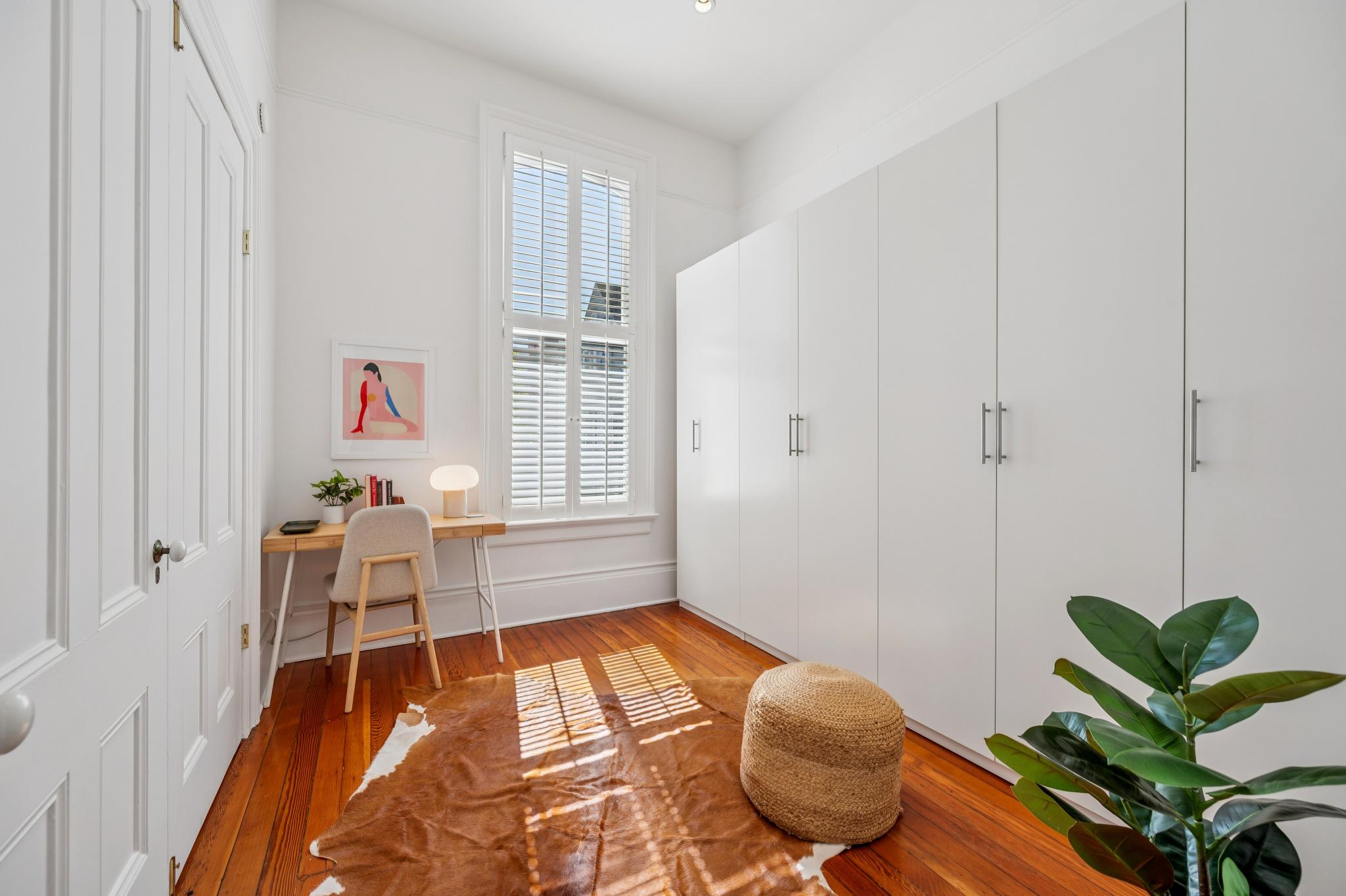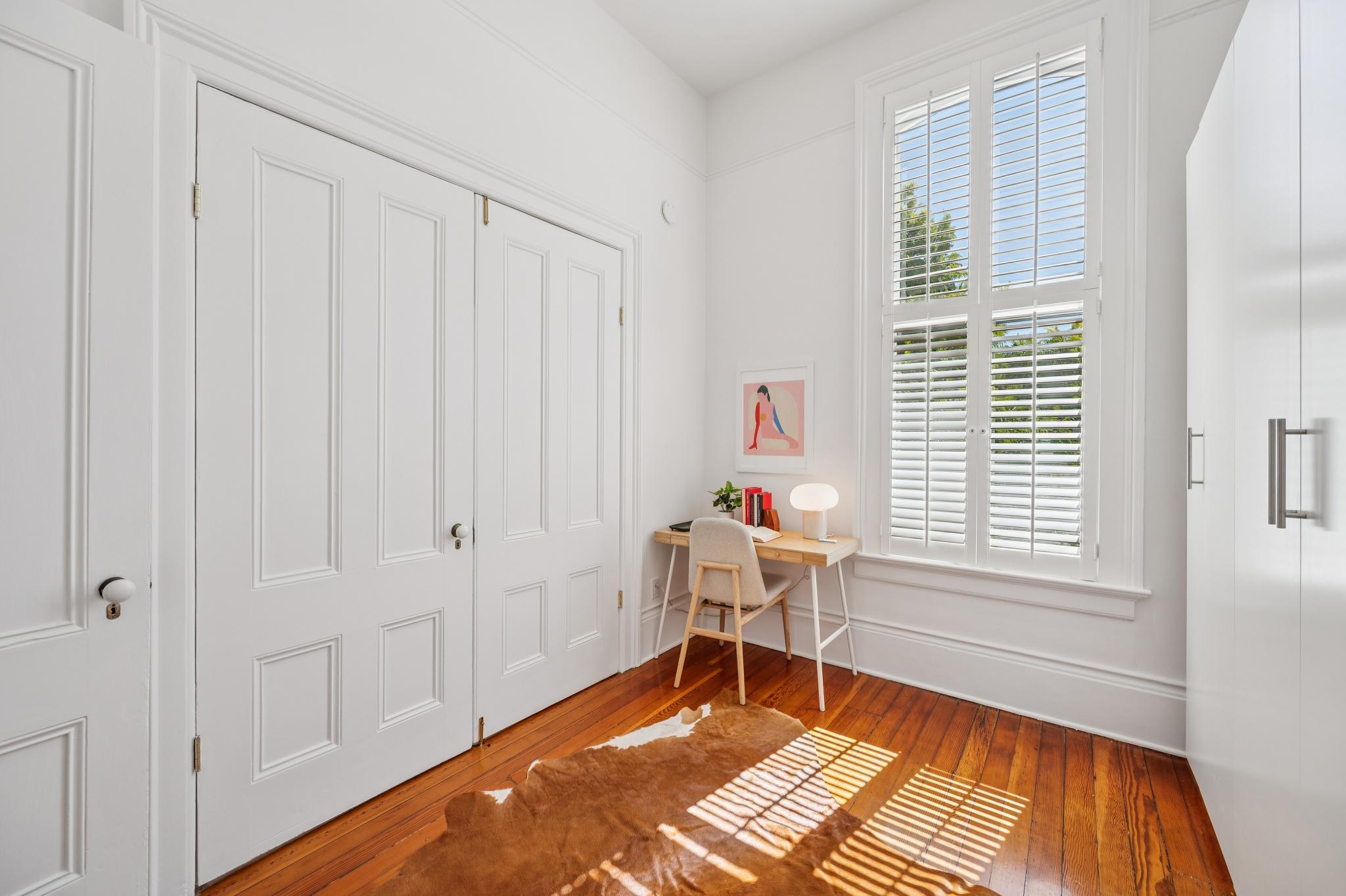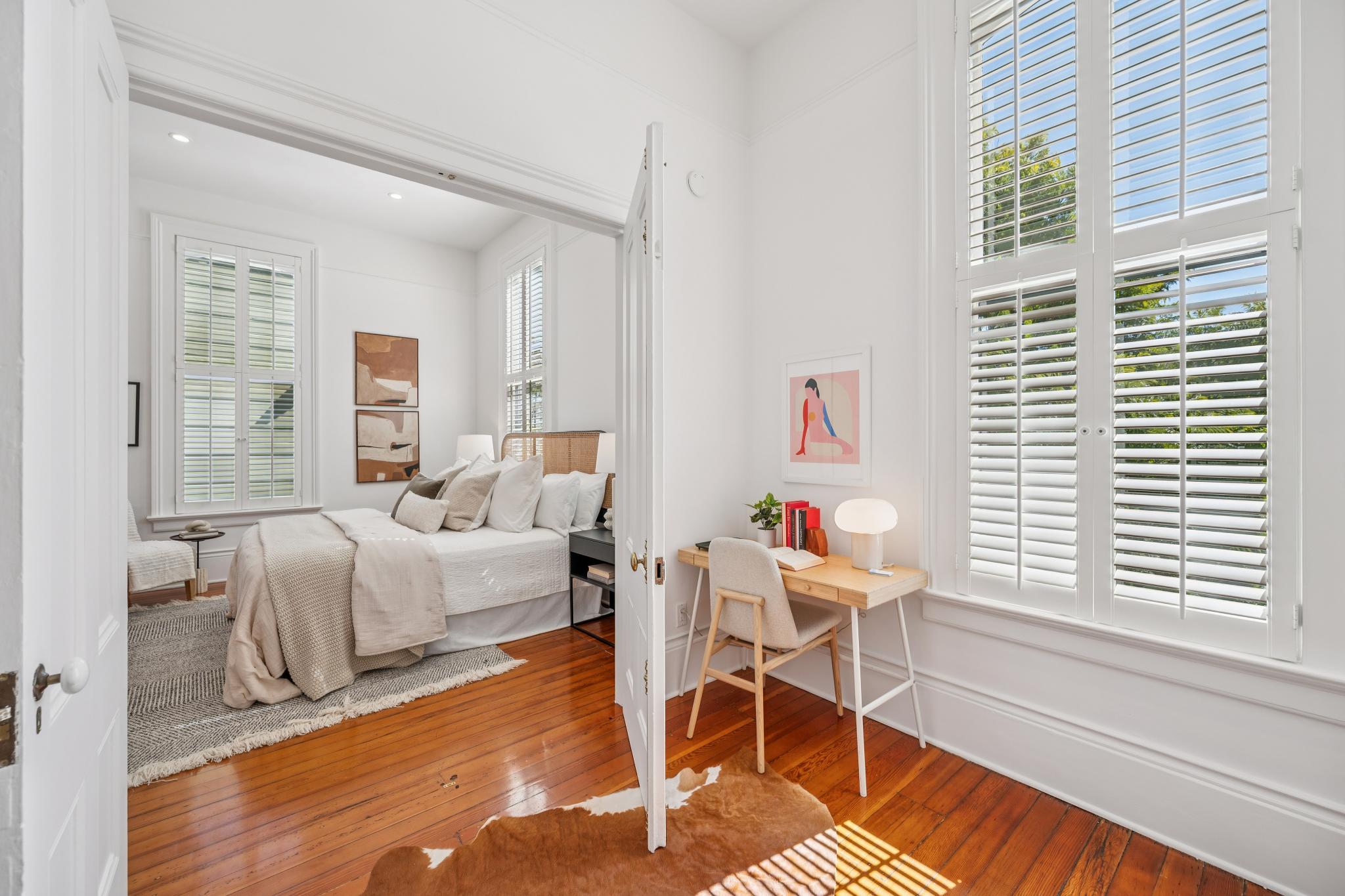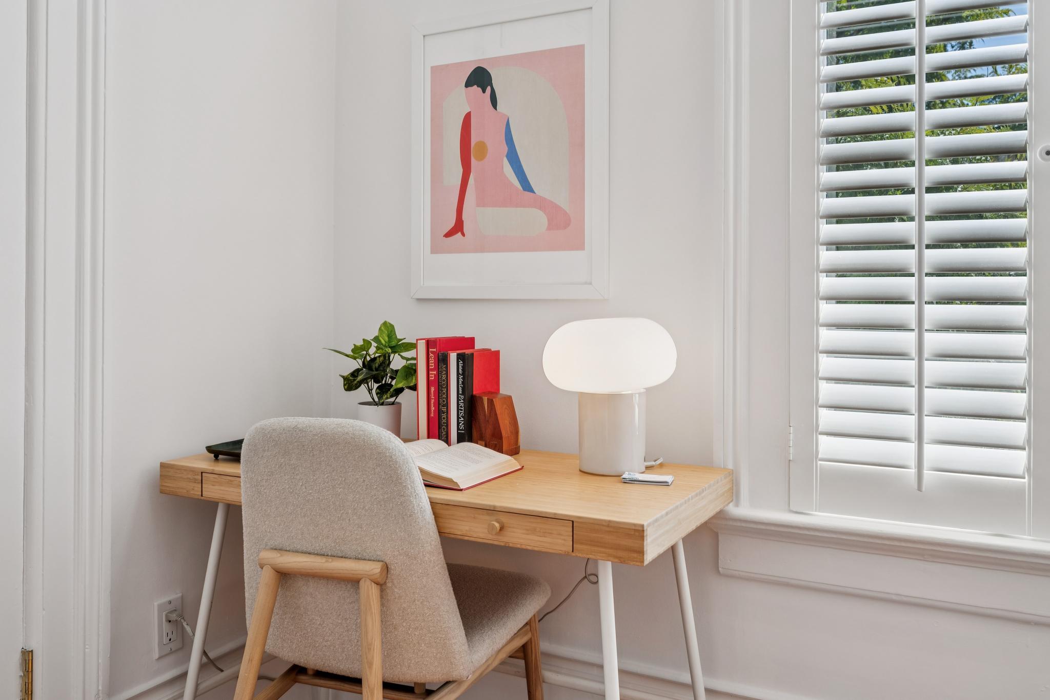 The living room and bedrooms retain their vintage charm with soaring 10+ ft ceilings and detailed molding, giving the home an uplifting sense of scale. The versatile primary suite features abundant closets and opens seamlessly through classic doors to a flexible office or dressing room. Lighting throughout the home has been stylishly updated with recessed lights and Lutron dimmers.