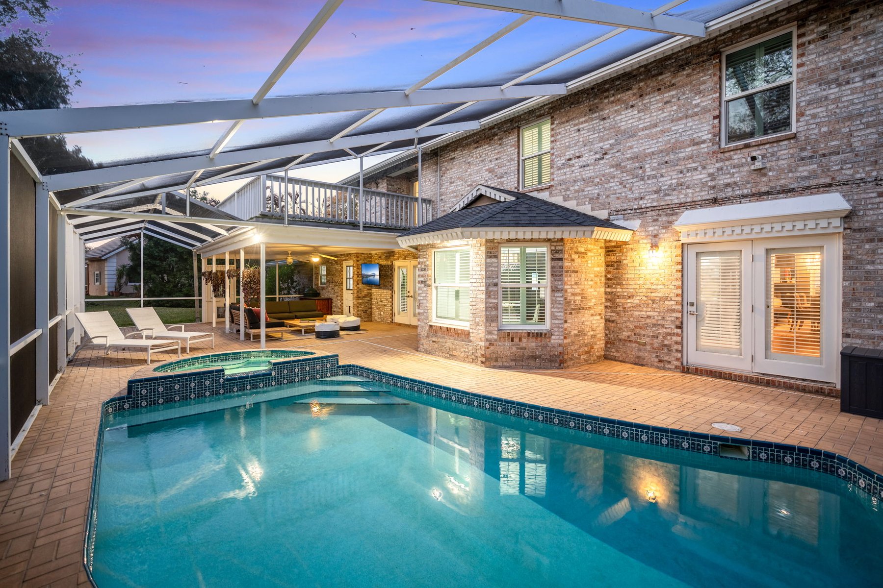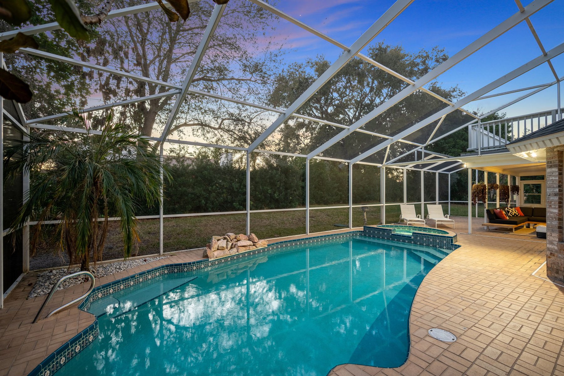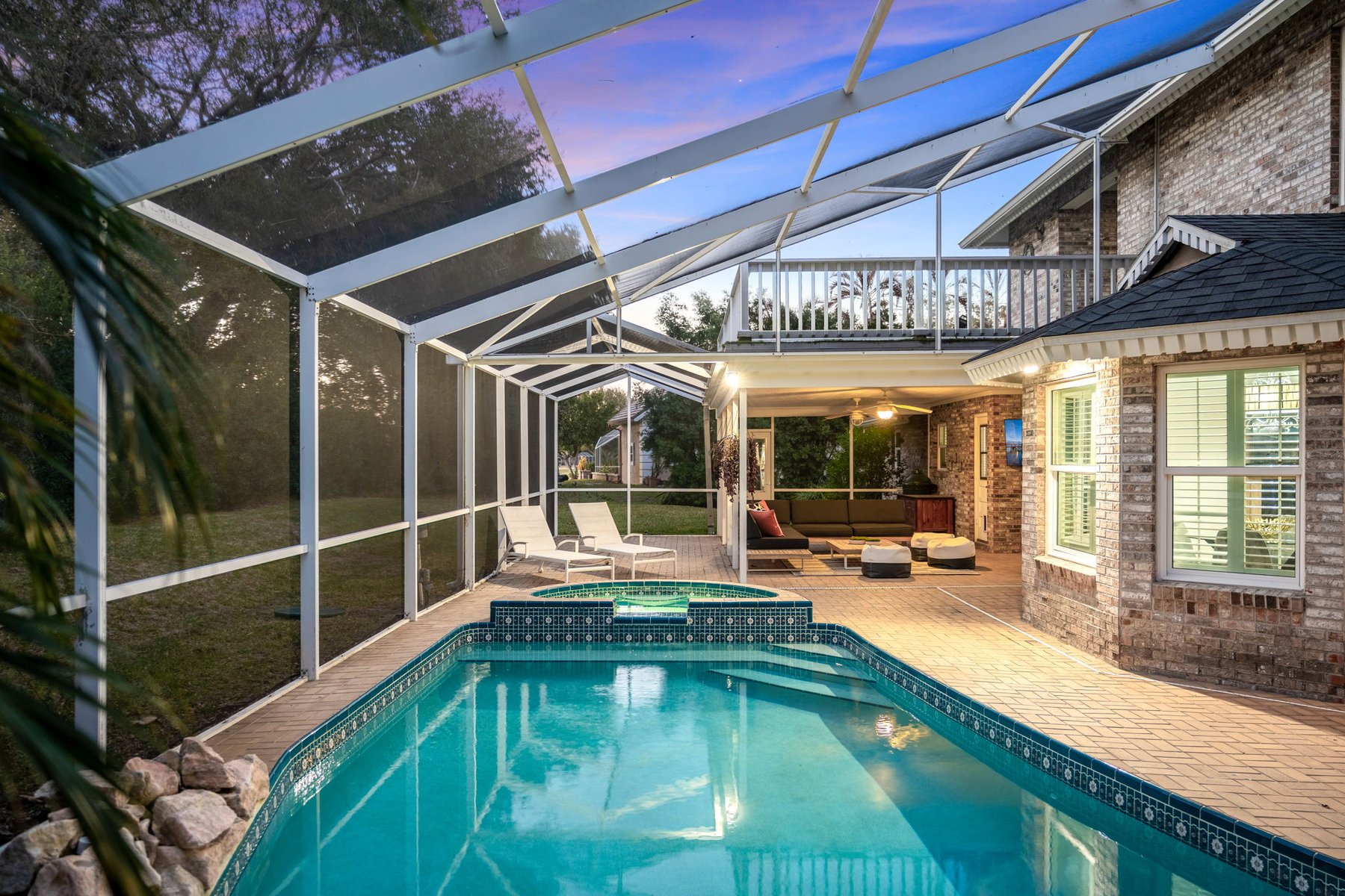 Located on a quiet cul-de-sac in Woodbridge at Suntree, this two-story brick French Provincial home sits directly adjacent to the 18th hole of Suntree Country Club. Offering 3,487 square feet, 5 bedrooms, and 5 full baths, the home blends timeless architecture with extensive 2022 updates throughout.Designed with family living and entertaining in mind, the home features hardwood floors, a wood-burning fireplace, and multiple gathering spaces that flow seamlessly to the expansive covered lanai and screened pool with gas-heated spa. The fully modernized kitchen showcases marble countertops, double wall ovens, an induction cooktop, butler's pantry, and an impressive entertainment extension complete with a 200-bottle wine refrigerator and keg fridge.Upstairs, the primary suite offers four custom closets and direct access to a private rooftop deck with panoramic views. Two additional upstairs suites provide flexibility for growing families or multigenerational living, while a first-floor guest bedroom adds convenience.Major improvements include hurricane impact windows and doors (2022), dual-zone HVAC, foam-insulated attic spaces, a 2015 roof with wind mitigation upgrades, and new professional landscaping (2024).Located within Woodbridge's signature covered bridge community and minutes from parks, shopping, and major commuter routes. Approximately 10 minutes to the beach, 15 minutes to Melbourne Orlando International Airport, and about 45 minutes to Orlando International Airport, this is a true family home in one of Suntree's most desirable neighborhoods.