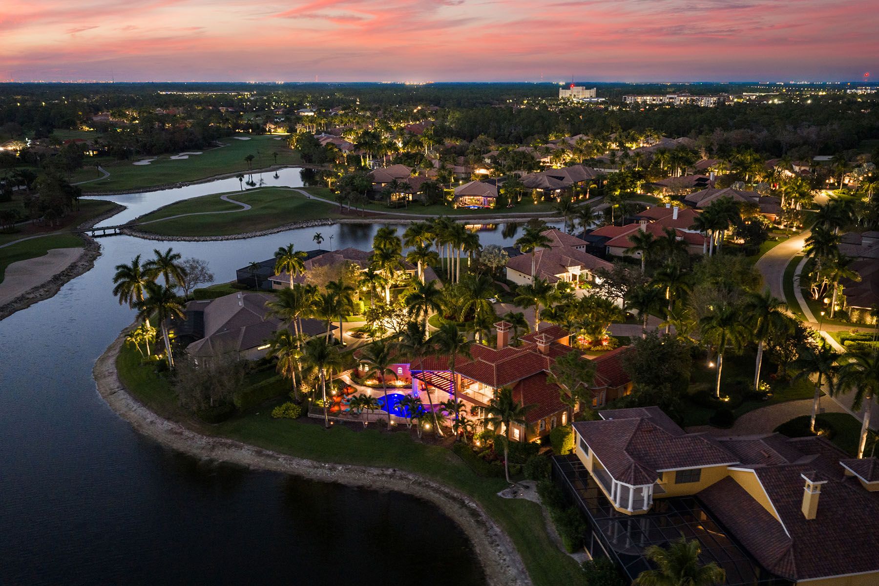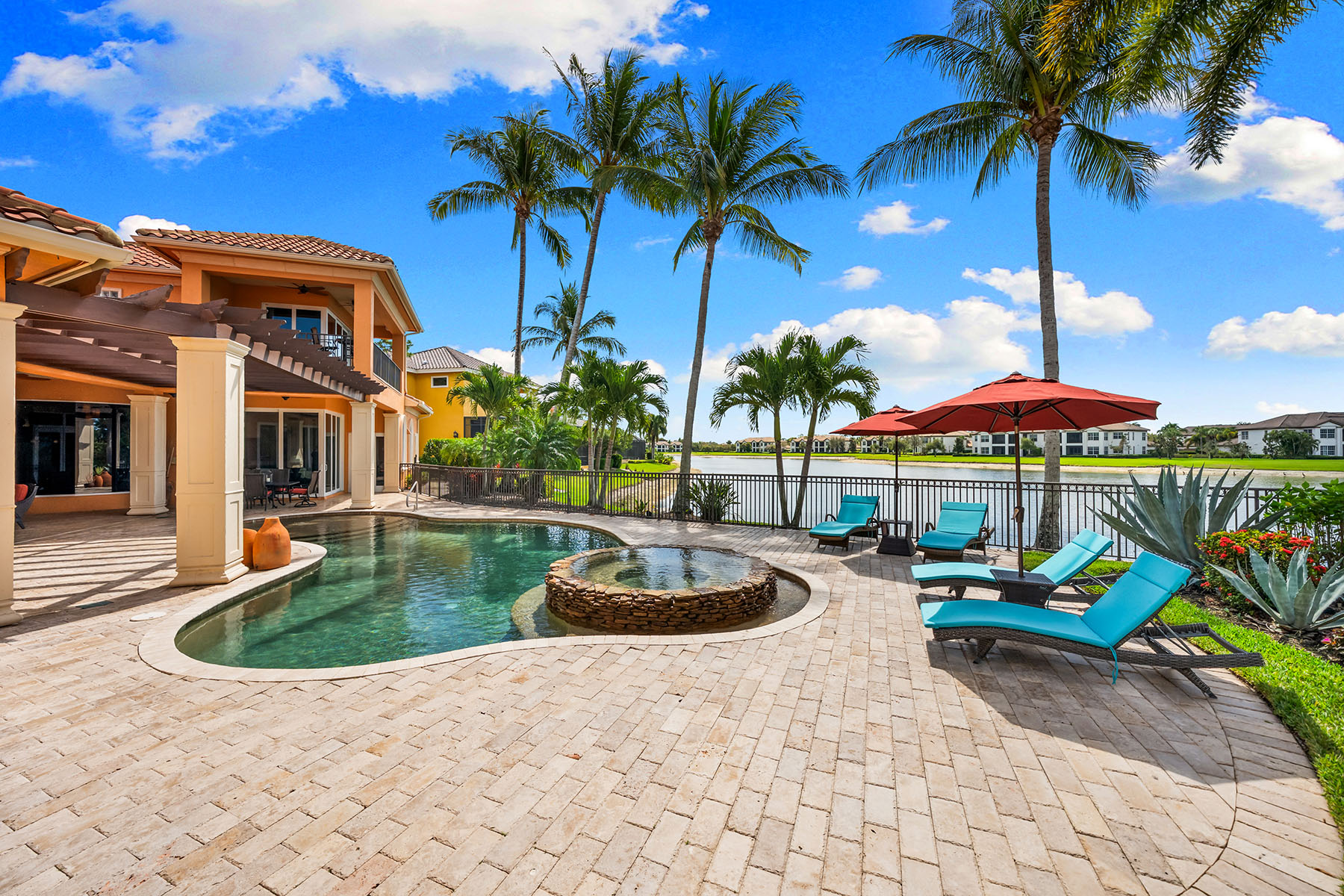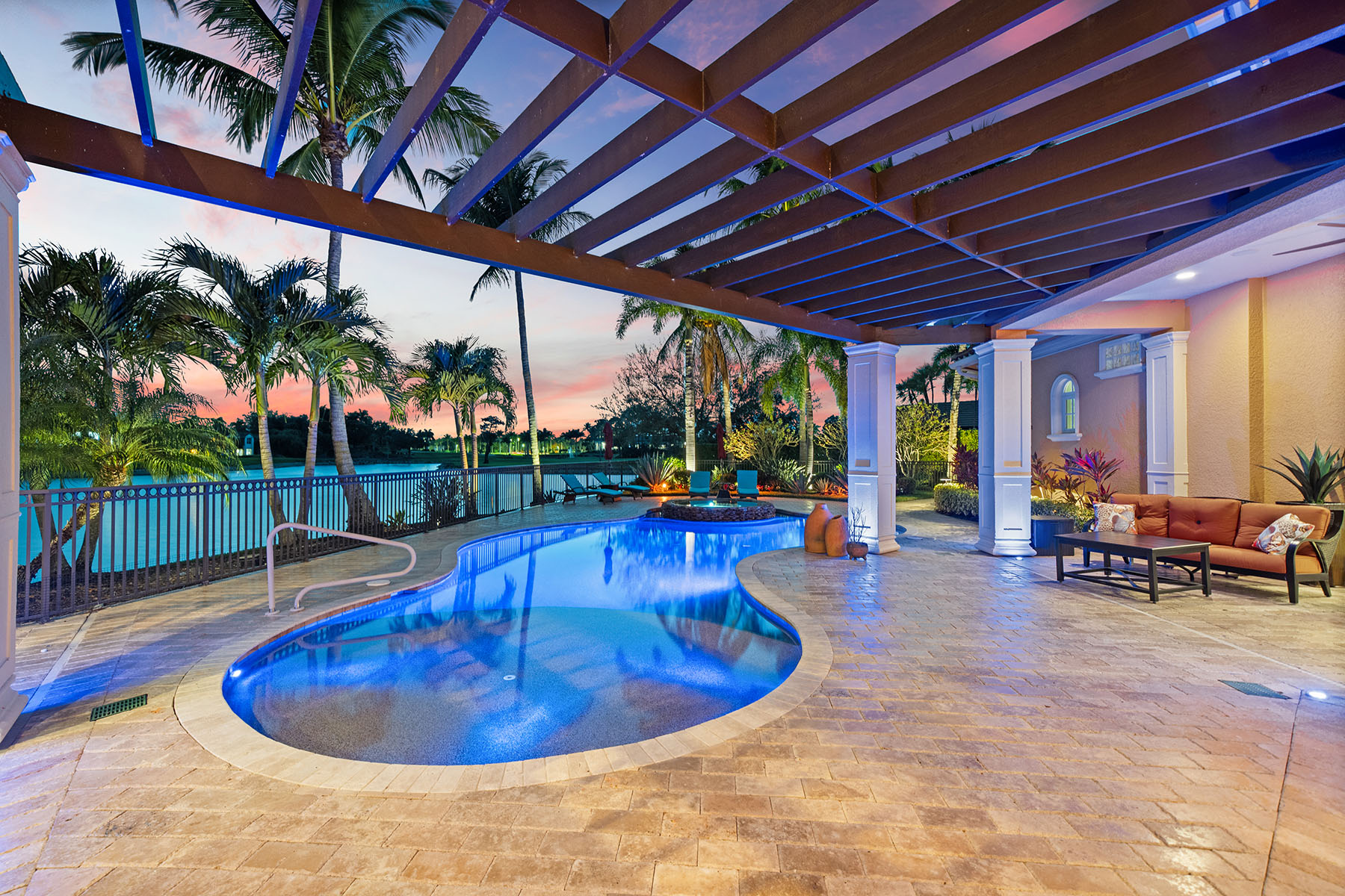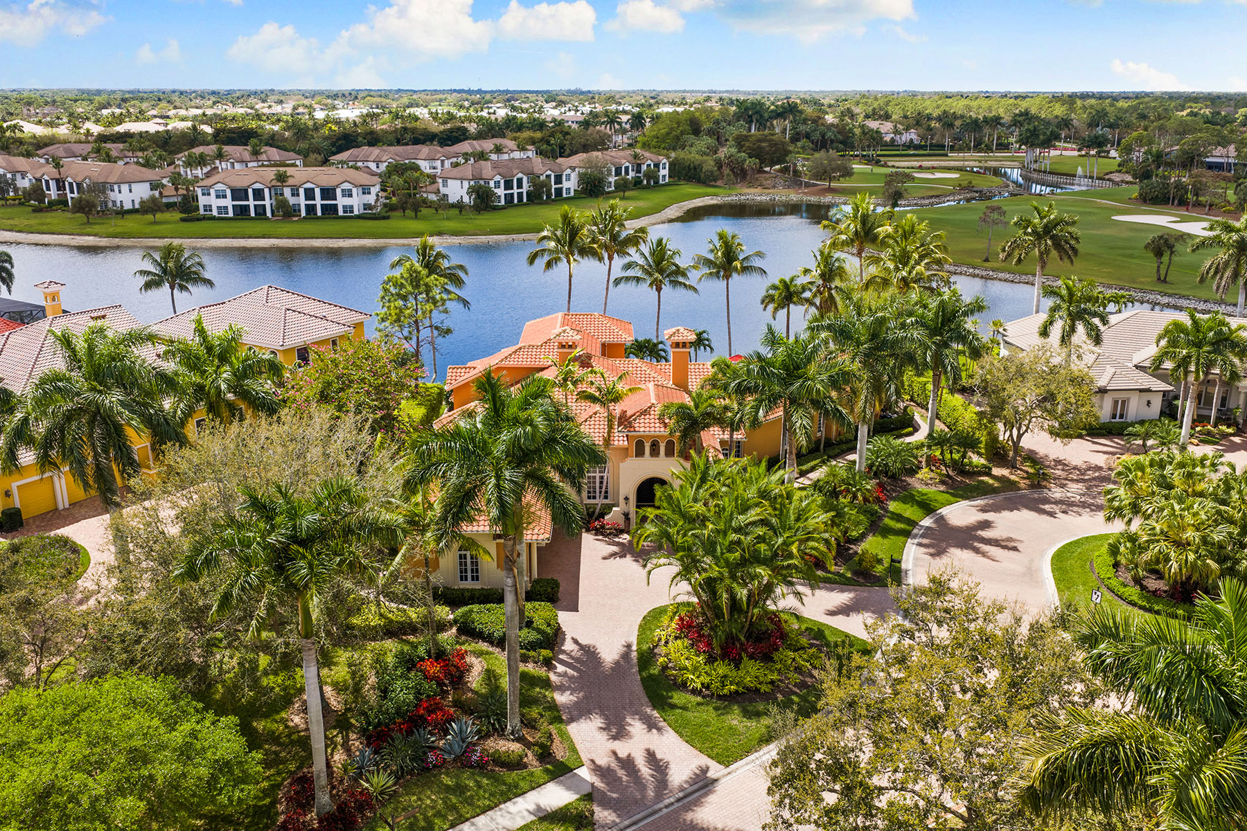 On a quiet cul-de-sac in The Classics Plantation Estates at Lely Resort, this custom-built turnkey-furnished residence is on an oversized homesite with more than 140 feet of lake frontage and southwest exposure overlooking long water views and the 18th hole of the Classics Golf Club. The residence offers approximately 5,080 square feet of air-conditioned living space with four bedrooms plus a den and four-and-one-half baths. Each bedroom features an en-suite bath, creating privacy and comfort for residents and guests. Interior finishes include oak and bamboo flooring, tray ceilings, double and triple crown molding, custom millwork, solid core doors, plantation shutters, impact-rated windows and doors and custom cabinetry throughout. Designed for everyday living and entertaining, the kitchen is equipped with professional-grade appliances, a central island, granite countertops, walk-in pantry, breakfast bar, warming drawer, wine cooler and three dishwashers. A fully equipped outdoor summer kitchen with built-in grill extends the entertaining space to an enclosed lanai. The primary suite offers two large walk-in closets with custom organization systems and a spacious bath with soaking tub, dual vanities and a walk-in shower with multiple shower heads. Outdoor living spans the length of the home and includes a custom-designed heated pool and spa with travertine decking, an open-air pergola and expansive covered seating areas that capture panoramic lake and golf course vistas. Additional features include three updated air conditioners, a walk-in laundry room, two whole-home water filtration systems, a circle drive leading into an oversized three-car garage and a roof installed in 2019. Residents of Lely Resort enjoy access to premier amenities, including three championship golf courses and The Players Club and Spa, which offers resort-style pools, spa services, tennis, pickleball, bocce, fitness facilities and multiple dining venues. The community is just minutes from downtown Naples, Marco Island and Gulf beaches.