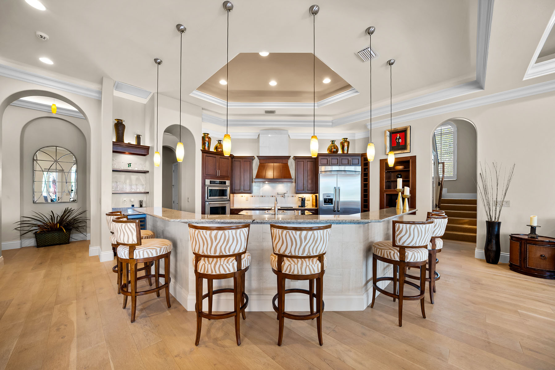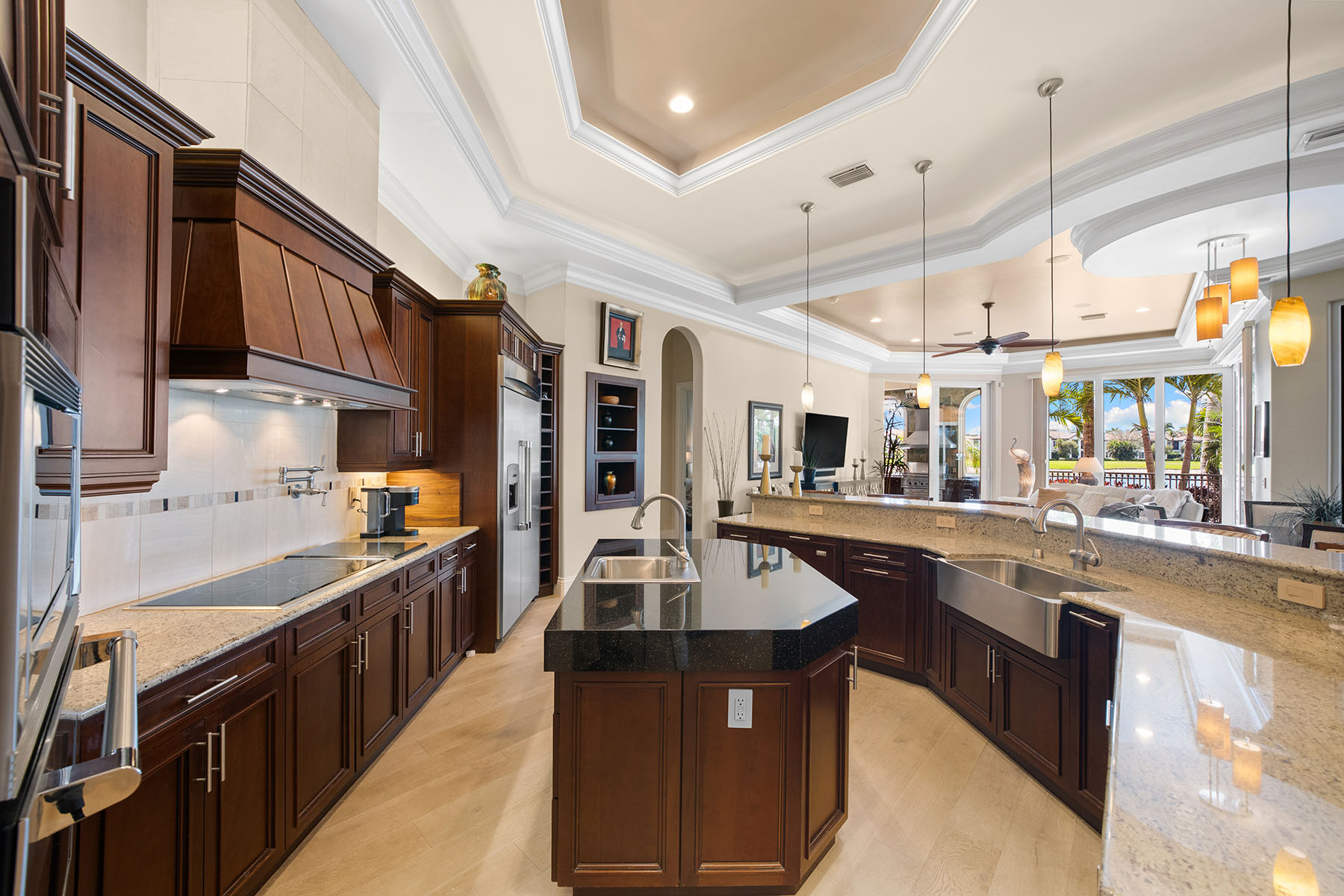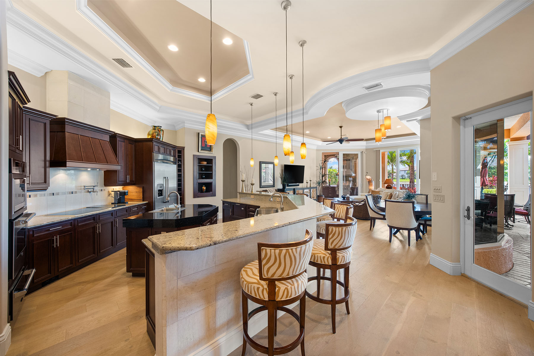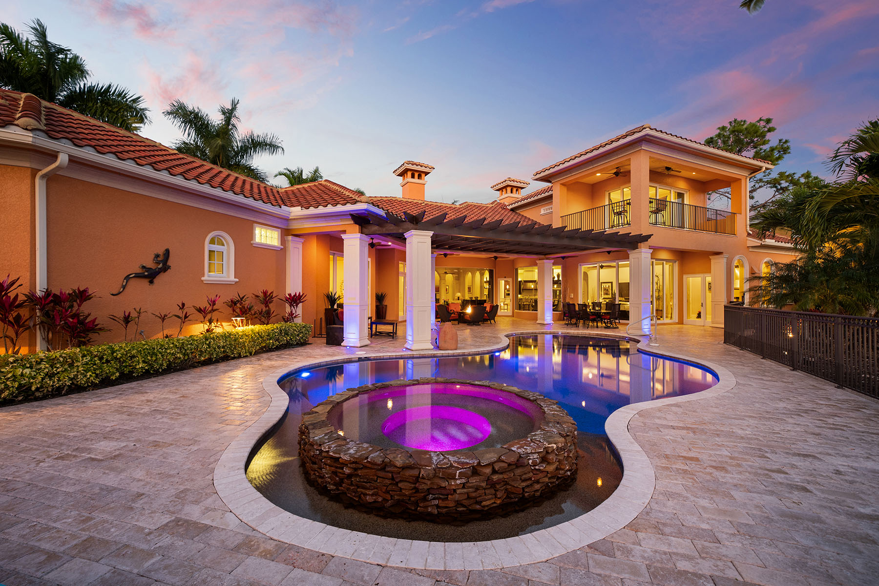 On a quiet cul-de-sac in The Classics Plantation Estates at Lely Resort, this custom-built turnkey-furnished residence is on an oversized homesite with more than 140 feet of lake frontage and southwest exposure overlooking long water views and the 18th hole of the Classics Golf Club. The residence offers approximately 5,080 square feet of air-conditioned living space with four bedrooms plus a den and four-and-one-half baths. Each bedroom features an en-suite bath, creating privacy and comfort for residents and guests. Interior finishes include oak and bamboo flooring, tray ceilings, double and triple crown molding, custom millwork, solid core doors, plantation shutters, impact-rated windows and doors and custom cabinetry throughout. Designed for everyday living and entertaining, the kitchen is equipped with professional-grade appliances, a central island, granite countertops, walk-in pantry, breakfast bar, warming drawer, wine cooler and three dishwashers. A fully equipped outdoor summer kitchen with built-in grill extends the entertaining space to an enclosed lanai. The primary suite offers two large walk-in closets with custom organization systems and a spacious bath with soaking tub, dual vanities and a walk-in shower with multiple shower heads. Outdoor living spans the length of the home and includes a custom-designed heated pool and spa with travertine decking, an open-air pergola and expansive covered seating areas that capture panoramic lake and golf course vistas. Additional features include three updated air conditioners, a walk-in laundry room, two whole-home water filtration systems, a circle drive leading into an oversized three-car garage and a roof installed in 2019. Residents of Lely Resort enjoy access to premier amenities, including three championship golf courses and The Players Club and Spa, which offers resort-style pools, spa services, tennis, pickleball, bocce, fitness facilities and multiple dining venues. The community is just minutes from downtown Naples, Marco Island and Gulf beaches.