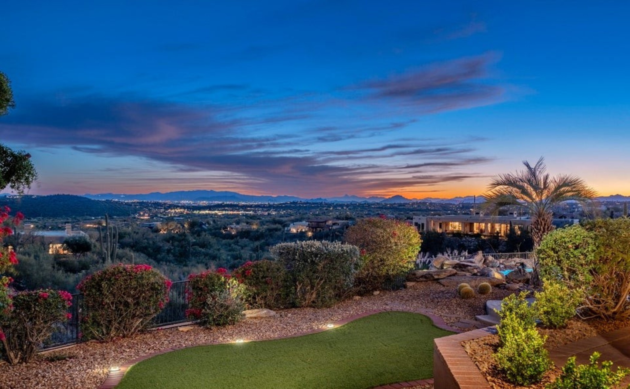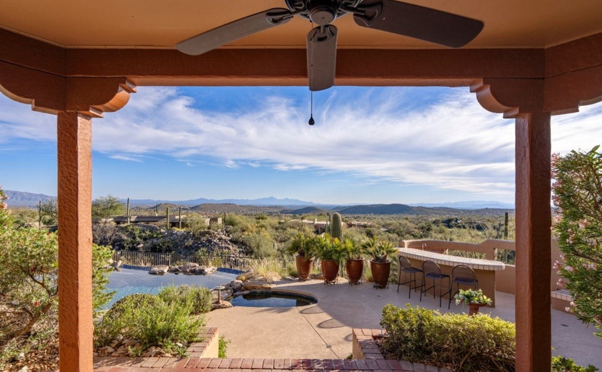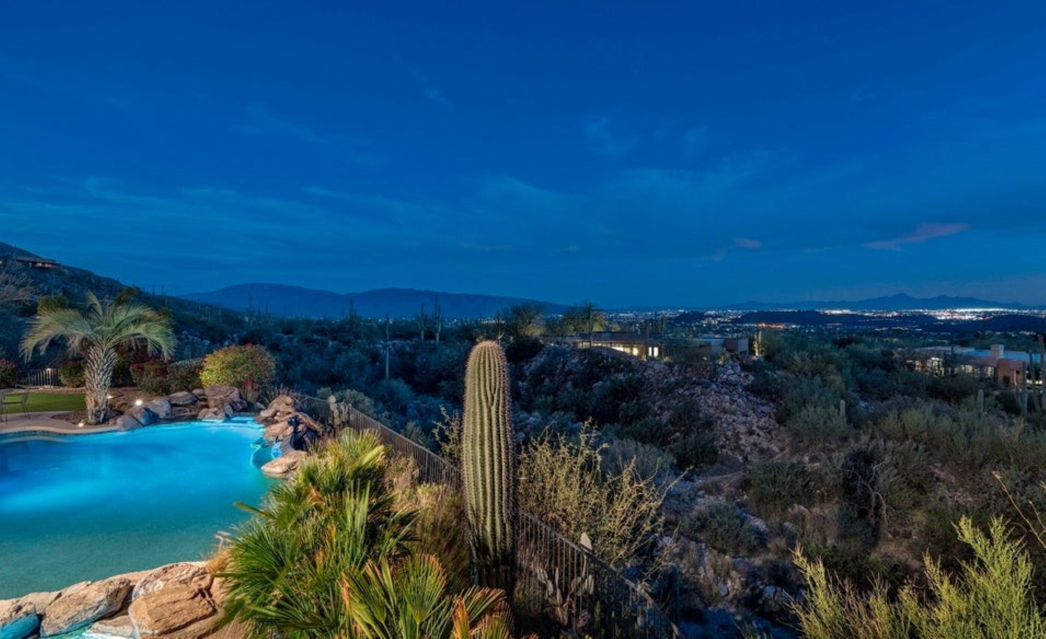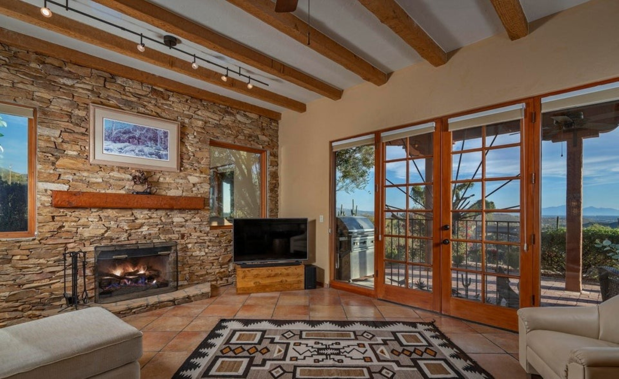 For those who value views and privacy above all, this custom home in gated Canyon View Estates delivers. Set on an elevated 1.38-acre homesite--one of only three on the street with a north/south exposure--at approximately 2,700 feet above sea level, this Catalina Foothills residence captures truly spectacular views of the city, mountains, Tucson's iconic sunsets, & the Ventana Canyon golf course. Canyon View Estates is located in the highly sought-after Catalina Foothills School District #16 and is within walking distance of Canyon View Elementary & Esperero Canyon Middle School. This location provides a remarkable combination of natural beauty, views, privacy, and proximity to Tucson's finest amenities. A circular driveway laid with one-of-a-kind native stone leads to a charming, gated courtyard with lush landscaping and a tranquil water feature. Upon entry, a dramatic wall of windows frames a stunning elevated view overlooking the city, creating an unforgettable first impression.The home features a desirable split-bedroom floor plan with four bedrooms, three bathrooms, and a den/office, offering comfortable separation between the owner's suite and the guest bedrooms. Throughout the home, warm architectural details--including stacked stone accents, wood-beamed ceilings, skylights, custom wood doors, wood-encased windows, and four fireplaces--create an atmosphere that exudes warmth, charm, and quality. The remodeled kitchen is positioned to capture views and features granite counters, a butcher-block center island beneath a large skylight, two sinks, stainless steel appliances, custom cabinetry to the ceiling with lit glass-front display cabinets, a custom copper hood vent, and a built-in breakfast bar. A bright breakfast nook just off the kitchen provides the perfect setting for casual dining with a view. The kitchen opens seamlessly to the family room, where a stacked-stone fireplace creates a warm focal point and french doors provide direct access to the backyard. Living spaces are designed for both everyday living and entertaining. The living room includes a wet bar with custom cabinetry and a generous dining area ideal for large gatherings. The spacious owner's suite enjoys mountain views, a gas fireplace, a skylight above the bed for star-filled nights, and a private covered patio with spectacular city, mountain, and sunset views. The owner's bathroom features wood-look tile flooring, dual vanities, a jetted soaking tub with a corner window framing remarkable views, a separate shower, and a large walk-in closet with custom built-ins.A separate bedroom wing includes three additional bedrooms and two bathrooms, including a remodeled Jack-and-Jill bath with dual sinks and a custom tile shower.The resort-style backyard features a PebbleTec pool and spa, water feature, expansive covered patio, artificial turf, and lush landscaping throughout. From its elevated vantage point, the outdoor living spaces enjoy sensational city, mountain, and sunset views. Designed for both everyday enjoyment and entertaining, the backyard includes a built-in bar area near the wood-burning outdoor fireplace--perfect for gatherings large and small.The additional land provides a natural privacy buffer and potential future expansion. The adjacent seasonal creek also enhances the sense of space and privacy.Additional highlights include custom wrought iron screen doors throughout, an oversized three-car garage with epoxy floors, built-in cabinetry and workshop area, a laundry room with sink and storage, and HVAC replaced in 2024 with smart thermostats.Ideally located just minutes from Sabino Canyon Recreation Area, Canyon Ranch Wellness Resort, Ventana Canyon Country Club, and everyday conveniences, including Whole Foods, Bashas', restaurants, cafés, and shops. Canyon View Elementary and Esperero Canyon Middle School are within walking distance.
