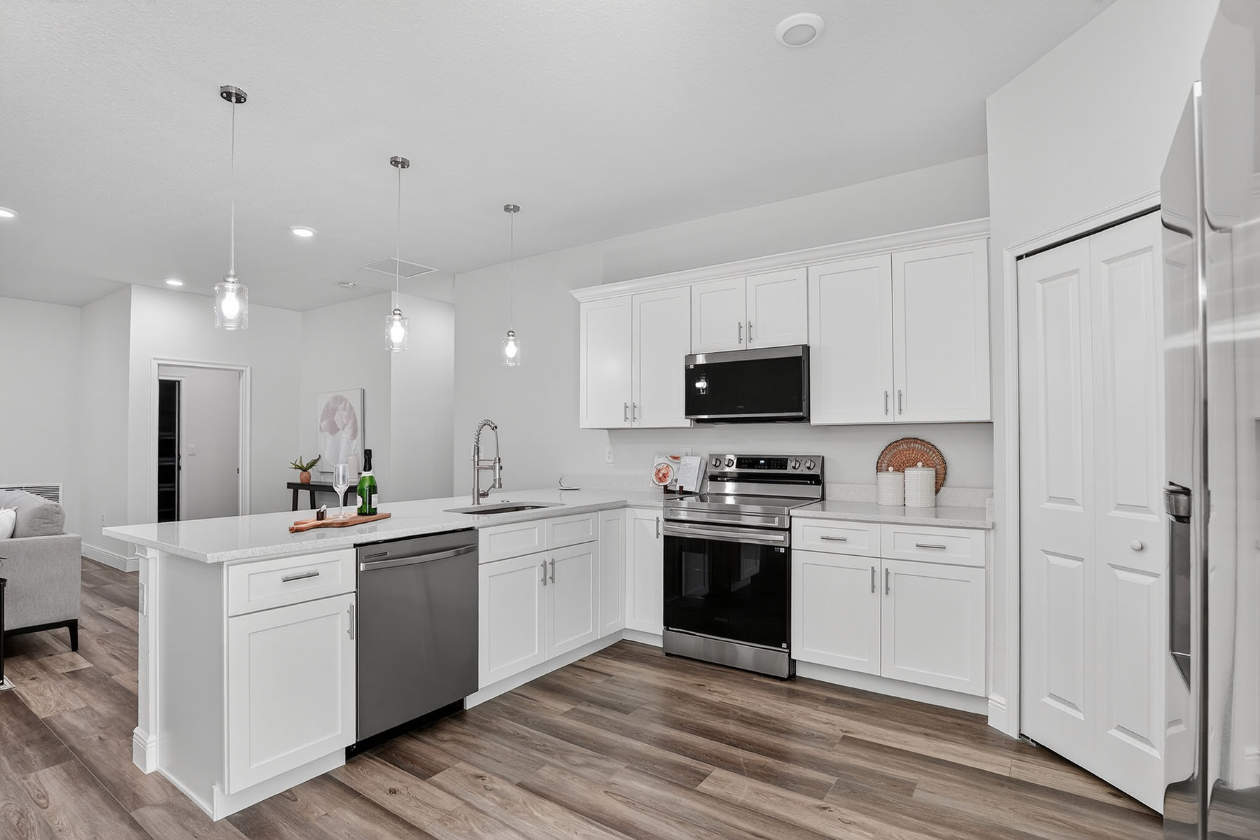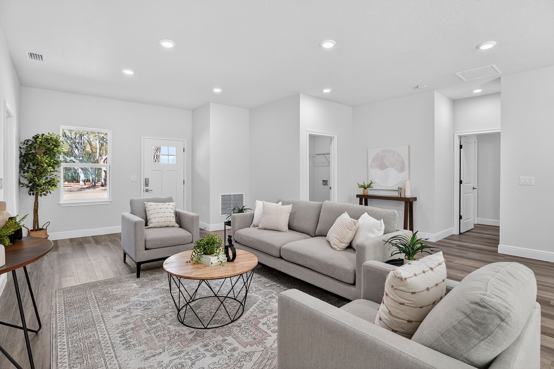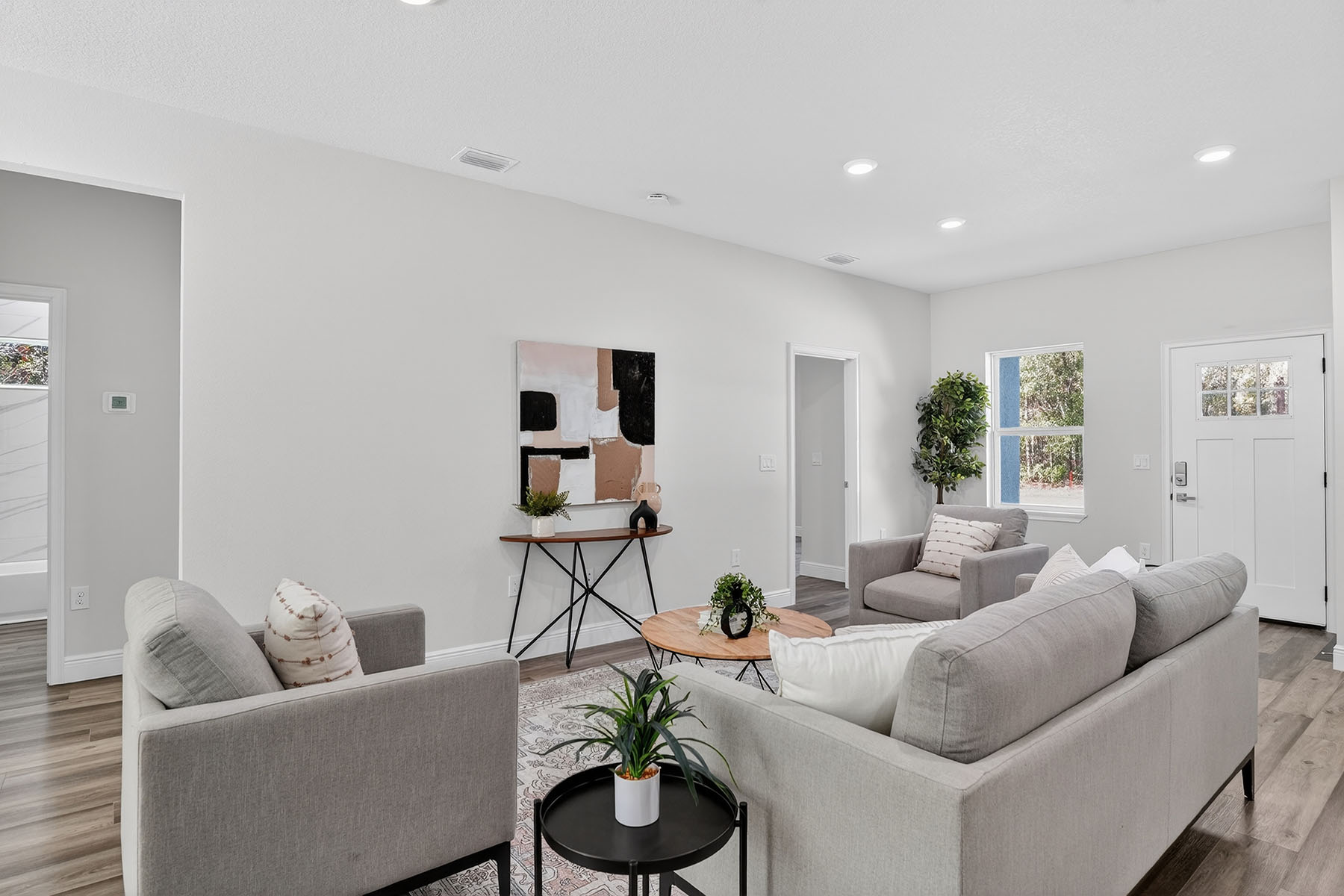 Modern new construction four-bedroom, two-bath home on a 0.23-acre lot in a quiet area of Dunnellon. This home offers an open-concept layout with a contemporary kitchen featuring white quartz countertops, shaker cabinetry, stainless steel appliances, and a spacious island ideal for everyday living and entertaining. The split-bedroom floor plan provides additional privacy, while the primary suite includes a walk-in closet and a beautifully finished bathroom with a quartz vanity and a tiled shower/tub combination, creating a clean and modern feel. Built with durable concrete block and stucco construction, the property also features a two-car garage and a large backyard with a patio, ideal for outdoor enjoyment. Conveniently near Rainbow Springs State Park, KP Hole Park and the Rainbow River.