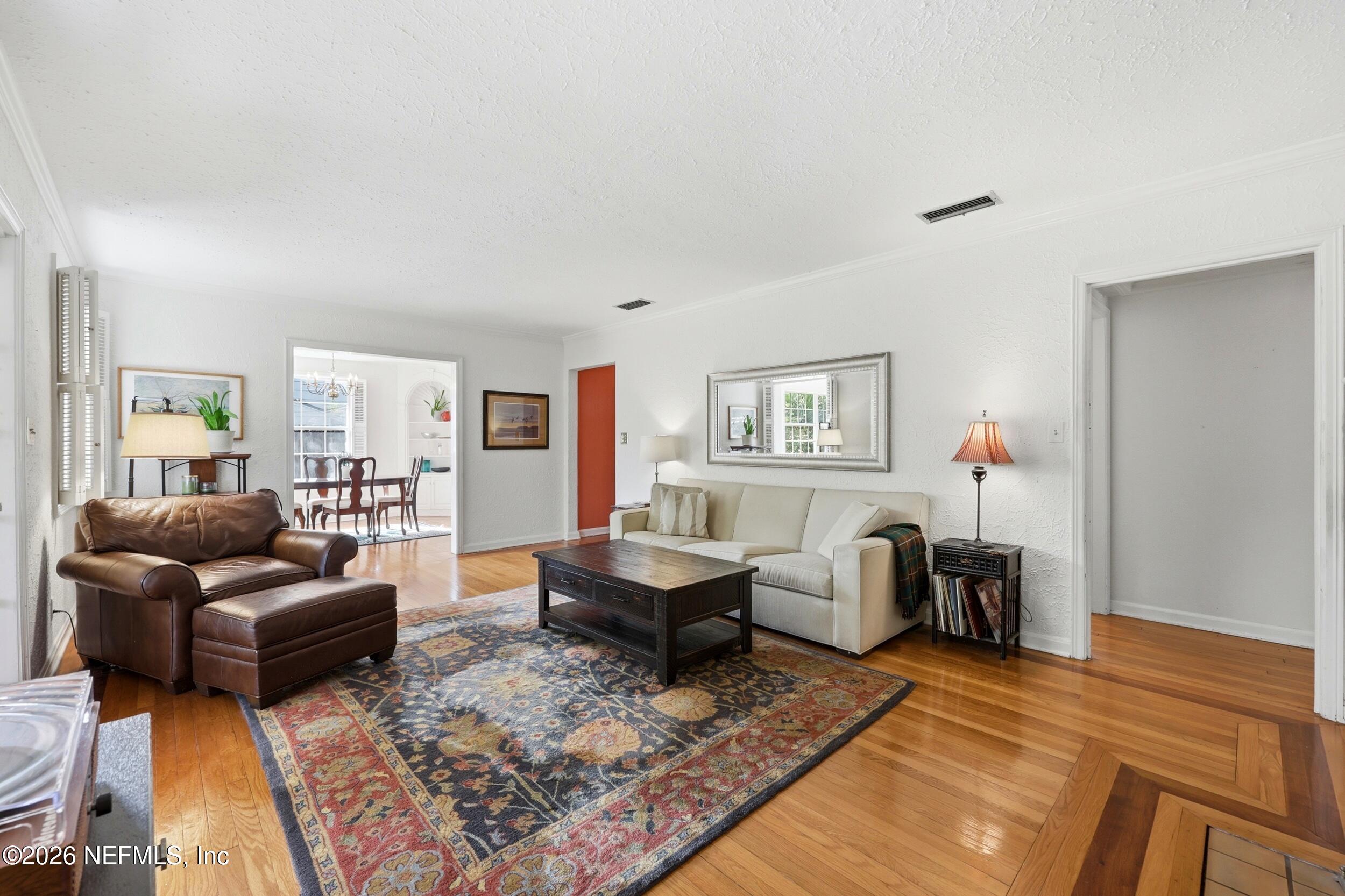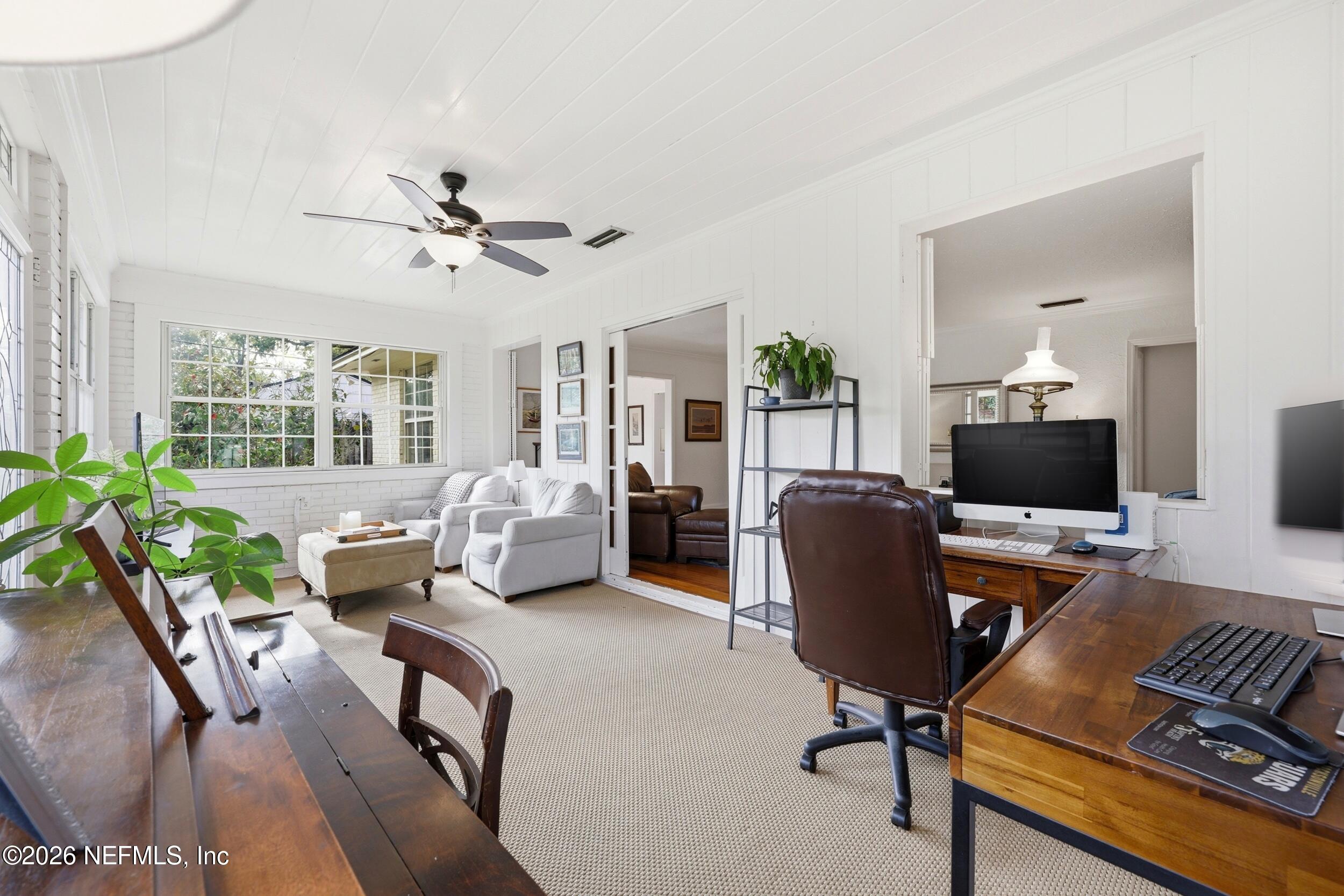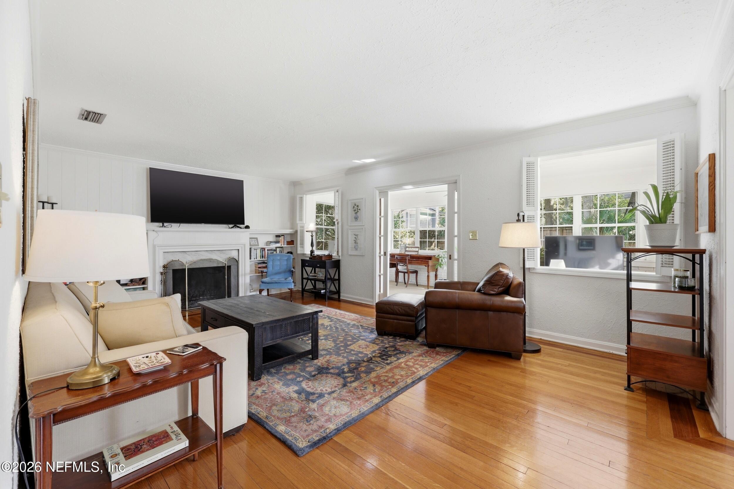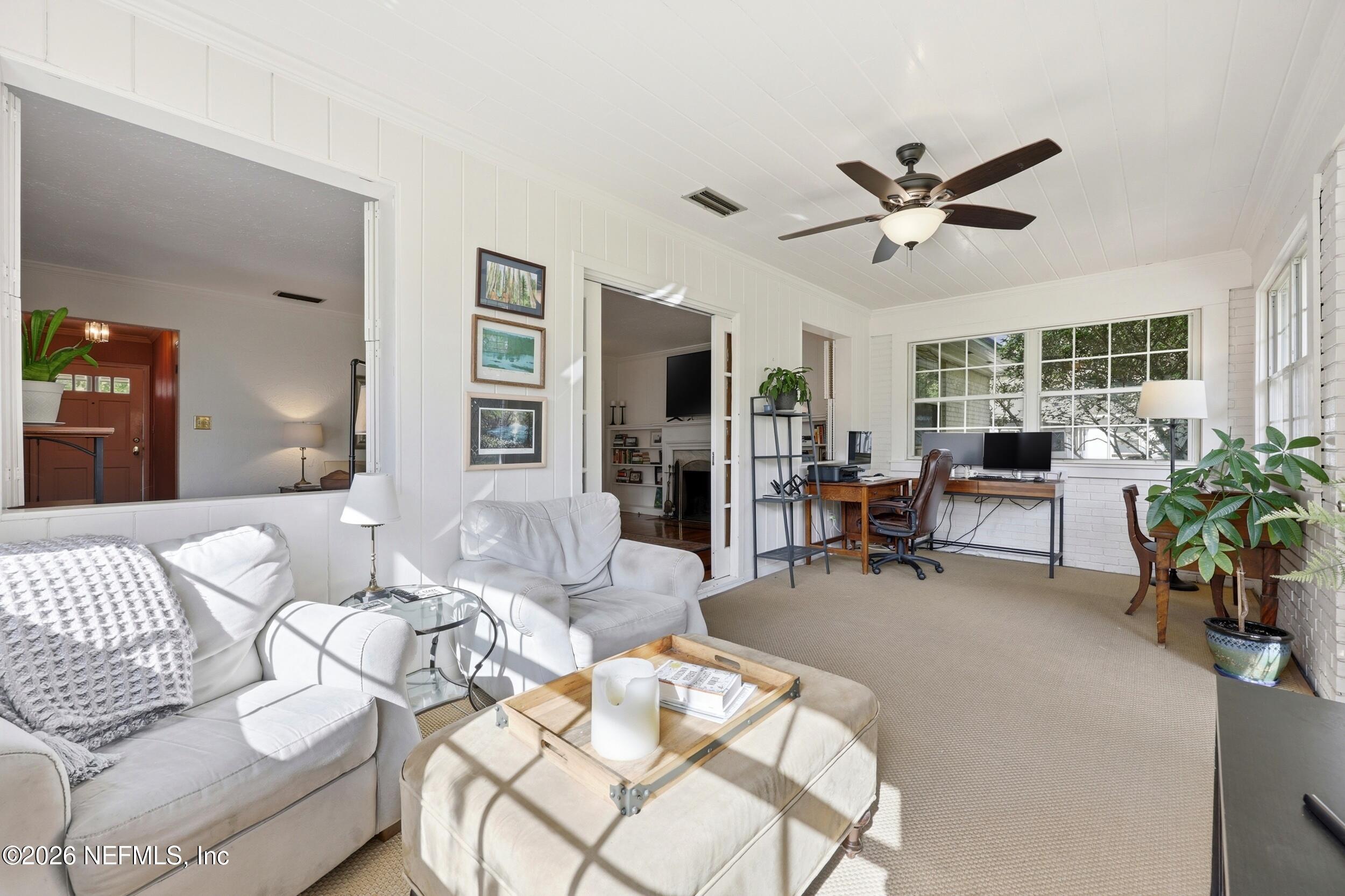 Nestled in the heart of Ortega Terrace, this one-story painted brick home blends classic character with comfortable living. Offering 1,808 sq ft, this 3-bedroom, 2-bath home is ready for new owners. A welcoming foyer opens to a spacious living room with a cozy fireplace, perfect for gathering and entertaining. The formal dining room showcases originally built-in corner cabinets. The inviting den overlooks the private backyard and provides direct outdoor access, creating an ideal space for relaxing or hosting guests. Beautiful oak flooring runs throughout the home. A convenient breezeway connects the house to a one-car garage with additional storage. Perfect for a buyer who is looking to put their own touches on the home.