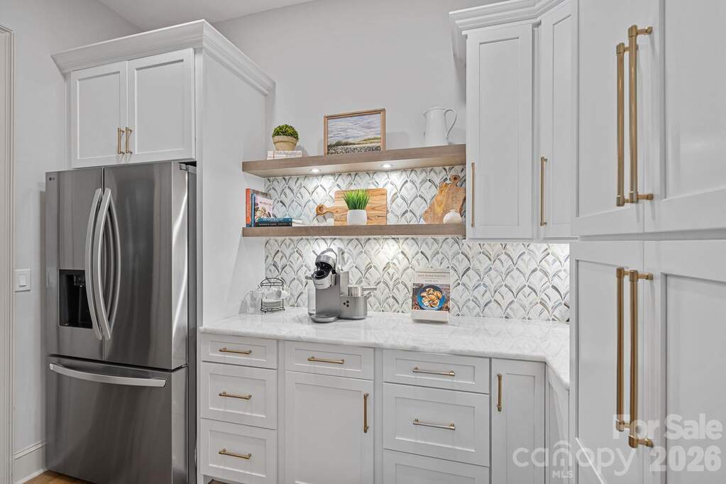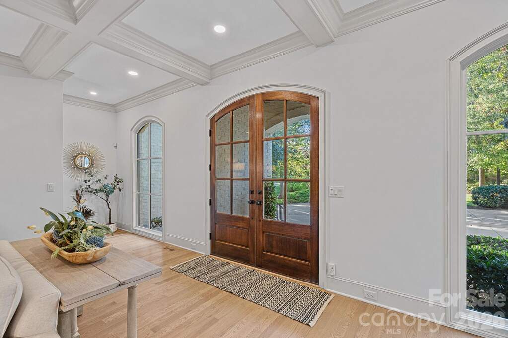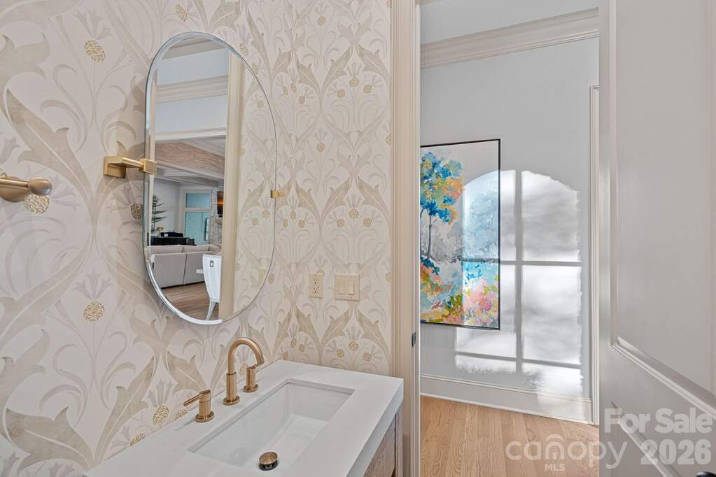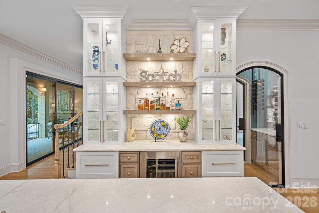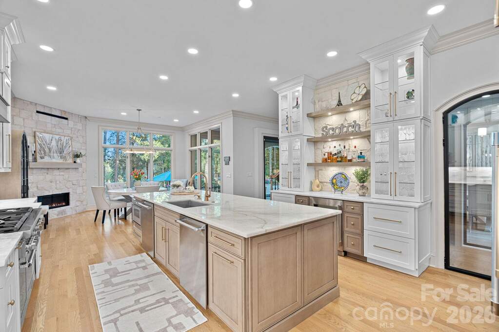 Completely reimagined through a comprehensive interior renovation, this luxury residence reflects an exceptional level of finish and thoughtful design throughout. From the fixtures and lighting to the tile, cabinetry, and architectural details, every space has been carefully updated with no detail overlooked. Set on 1.52 acres overlooking the 8th green of Trump National Golf Club Charlotte, the home blends refined style with exceptional livability. The chef's kitchen serves as the centerpiece with custom cabinetry, premium appliances, a 12-foot island, two dishwashers, and a scullery featuring pantry storage, coffee bar, and second refrigerator. Just off the kitchen, the breakfast room offers added flexibility and may also serve as a keeping room. A custom bar with lit shelving and a pass-through temperature-controlled wine room adds another layer of thoughtful design. Designed for both everyday living and entertaining, the main level includes coffered ceilings in the family room, arched windows, elevated lighting, and custom Andersen bifold doors that open to the outdoor living spaces. The main-level primary suite is a private retreat with a renovated bath featuring heated floors and a professionally designed closet with built-in linen storage and washer and dryer. A heated and cooled 3-car garage adds comfort and function. Upstairs, a spacious flex room was designed for a future suite or private retreat, with plumbing in place for a bath. The upper level also includes a recreation room with built-in bar, second-level office, and secondary laundry room. Outdoor living is equally well considered with a saltwater pool and spa, built-in grill area, covered patio with retractable screens, and see-through fireplace. The setting offers a high level of privacy along the 8th green, with the cart path positioned on the far side of the green and a subtle winter long-range view of Lake Norman. Completing the lifestyle, the boat slip is within walking distance, and the amenities of Trump National Golf Club are just a short walk away.