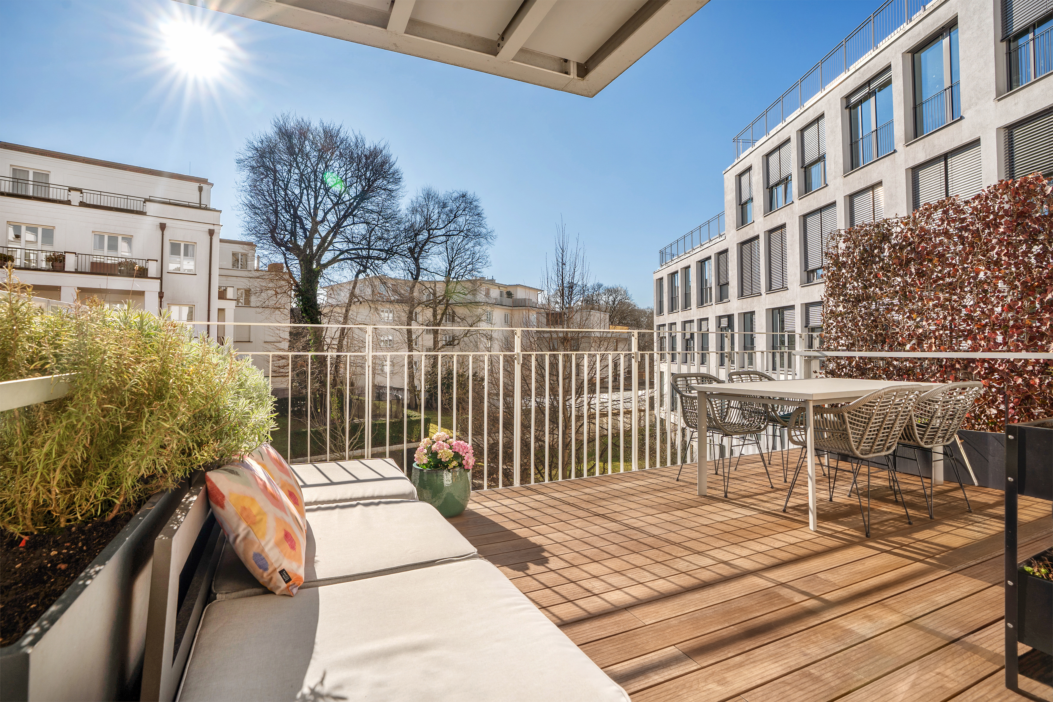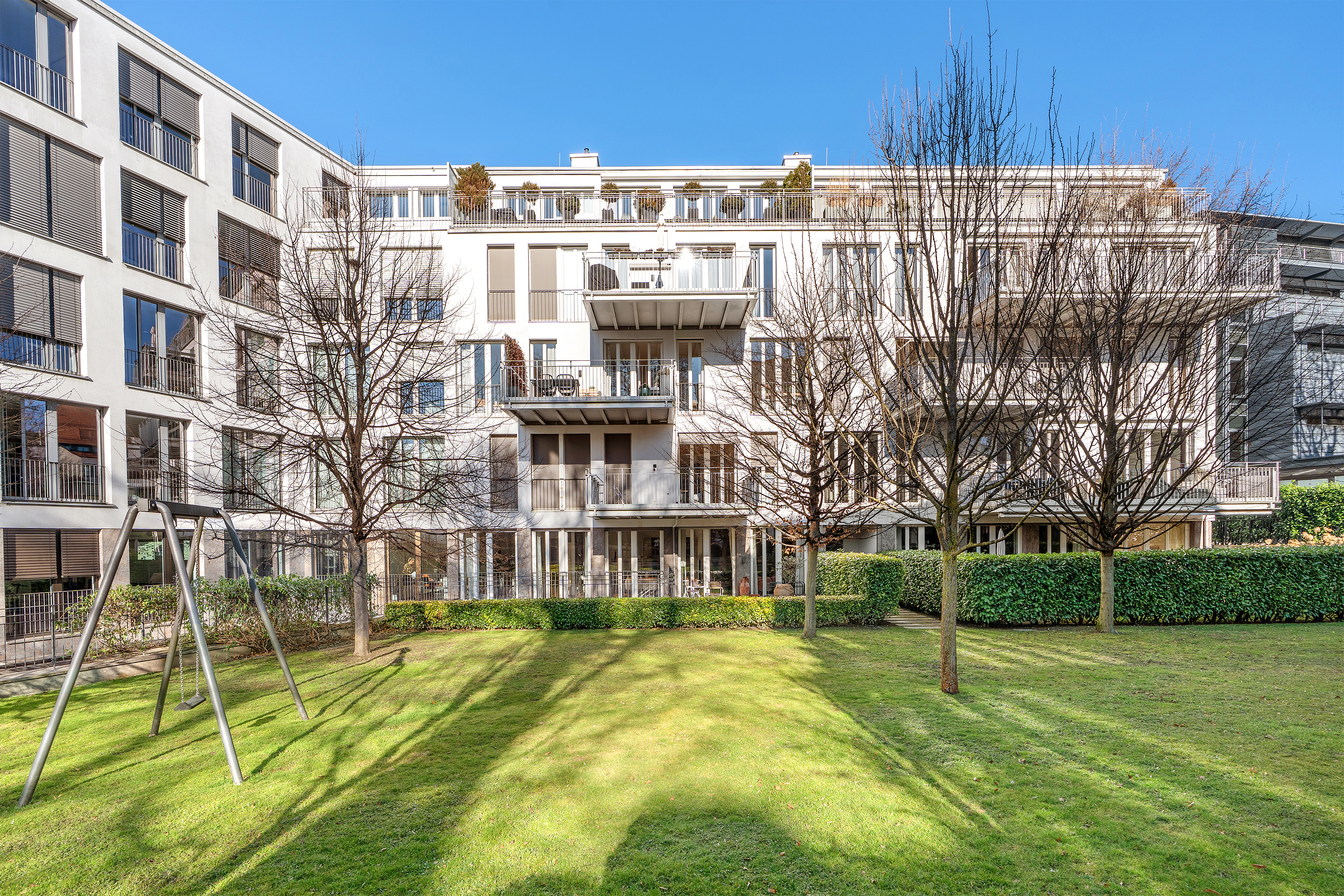 This high-class apartment is situated in one of Munich's finest locations, at the transition from Altbogenhausen to Herzogpark. It is located on the 2nd floor and is part of the premium urban quarter "Montgelas Park", which was completed in 2013. The "Stadthaus Törring", designed by Steidle Architekten, impresses with its aesthetic modern architecture and generously glazed façades.The perfectly structured room concept offers a living area with adjoining kitchen, a master area with bedroom, dressing room and en-suite bathroom as well as a further room with flexible usage options and an en-suite bathroom on approx. 176 m². There is also a guest WC and a utility room. The fittings, including a bulthaup kitchen, natural stone bathrooms, custom-made fixtures and fireplace, are characterized by exquisite, coordinated materials, excellent workmanship and high design standards. Impressive room heights of over 3.00 meters and large glass fronts emphasize the airy feeling of space. Two balcony terraces open up wonderful open spaces. A gym and a sauna area are available to residents in the basement. The apartment includes a storage room and an underground parking space. Convenient and threshold-free access to the apartment is provided by an elevator.In addition to the exquisite furnishings and the enchanting communal garden, the irretrievable and at the same time quiet top location in the heart of Altbogenhausen is particularly noteworthy. The Isar river, Prinzregentenstrasse and the city center are just a few minutes' walk or bike ride away - a perfect symbiosis of nature and culture.
