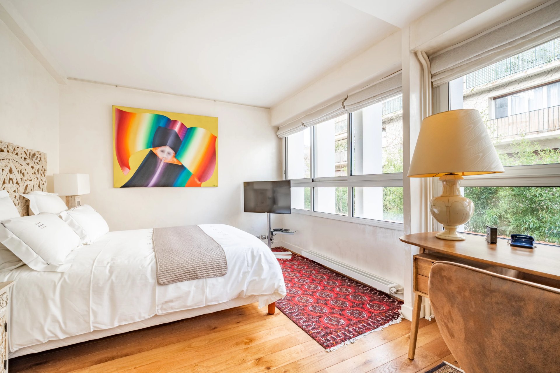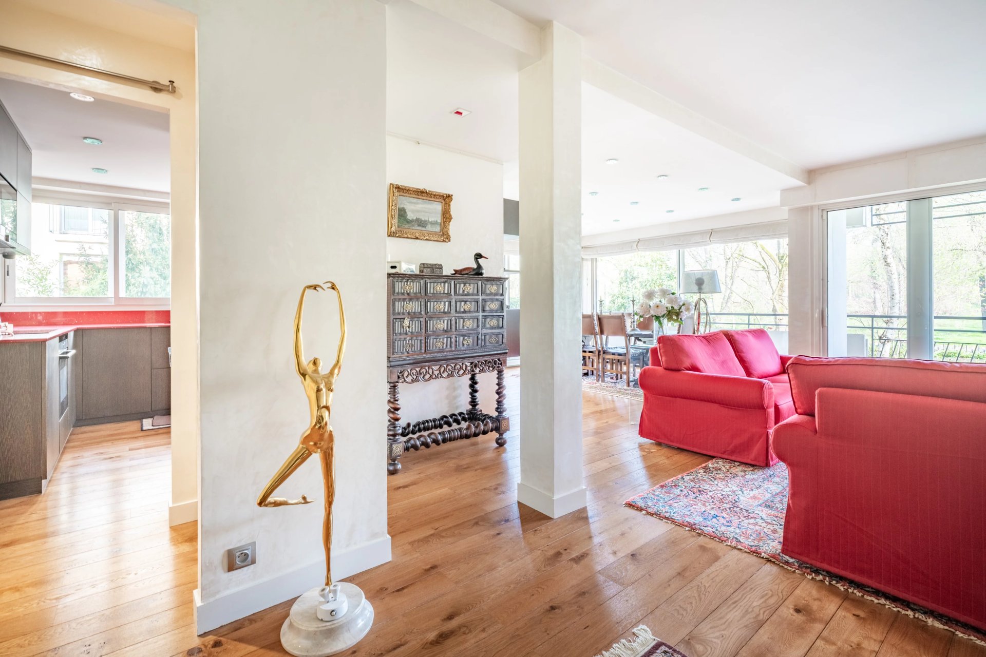 This bright and peaceful apartment in perfect condition is on the 1st floor of a mid 20th century building with a lift facing the Bois de Boulogne and near the shops and transport networks. 100.55 sqm of living space as defined by the Carrez Law includes an entry with fitted storage space, a double living/reception room opening onto a balcony enjoying an open view, a spacious open-plan kitchen, two bedrooms (one opening onto a balcony), a shower room/wc and a separate wc.