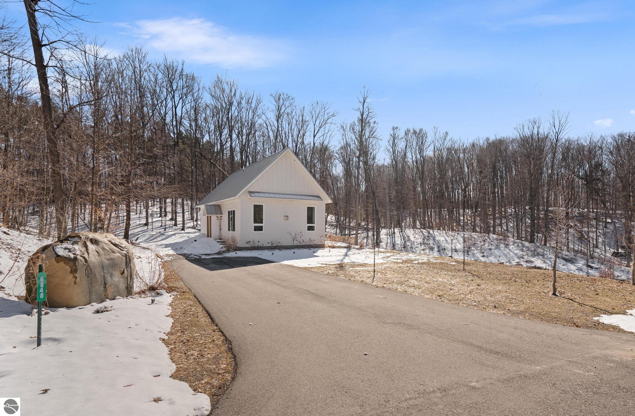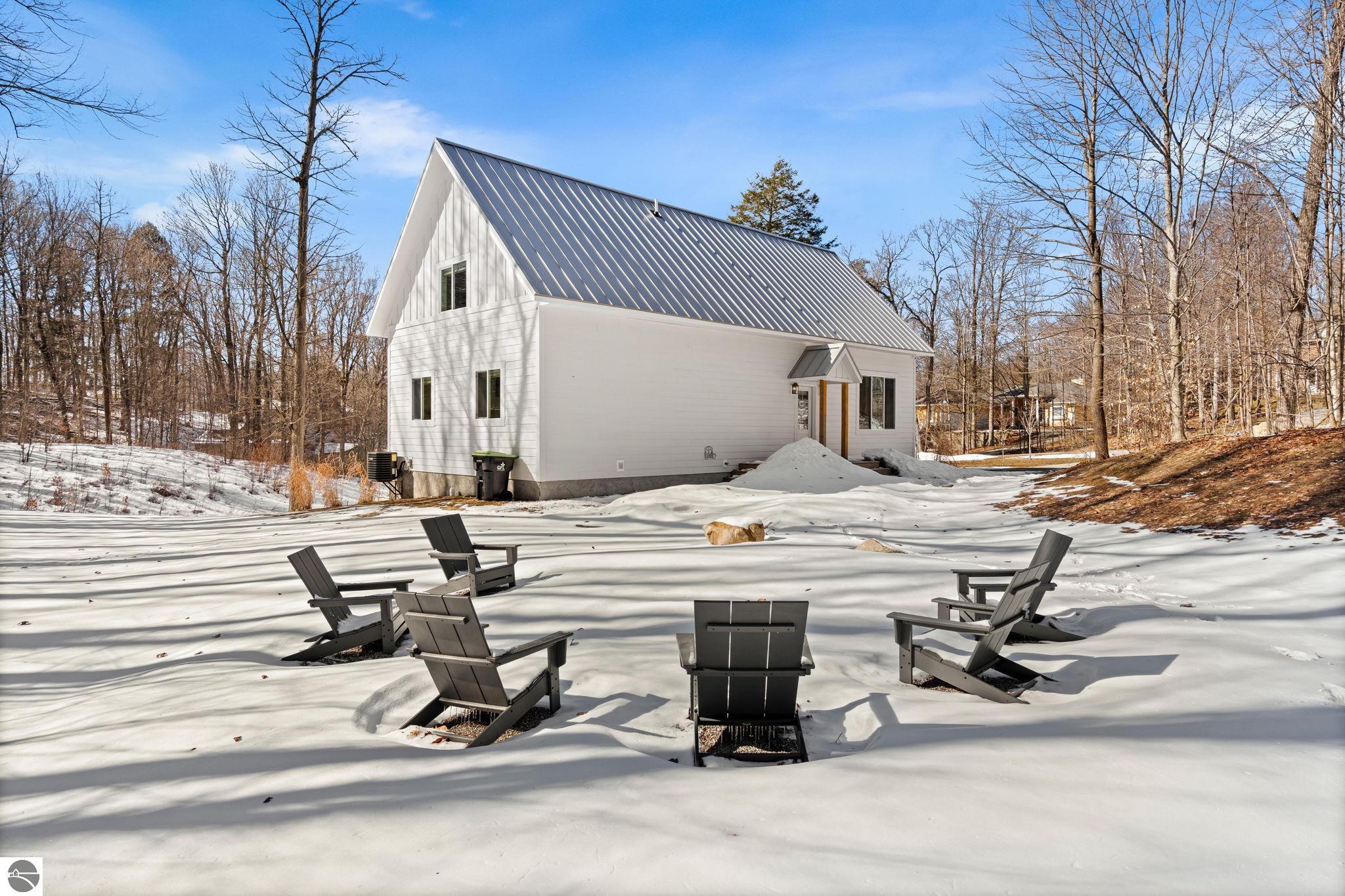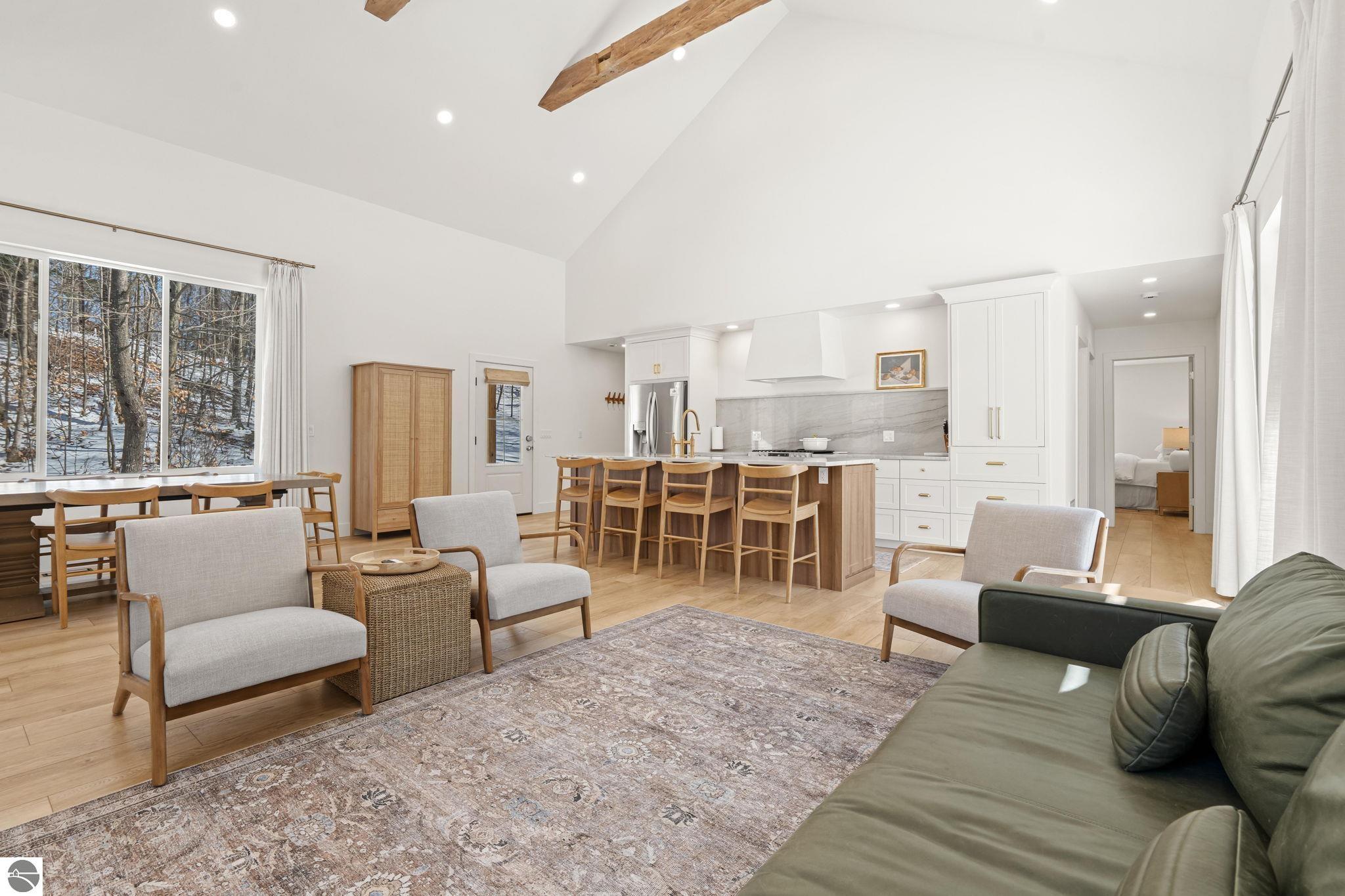 Tucked into a quiet wooded setting near the shores of South Lake Leelanau, this beautifully crafted four bedroom, three bath home, offers more than 3,100 square feet of thoughtfully designed living space where natural materials and modern finishes come together. The main living area features soaring vaulted ceilings and striking reclaimed white pine beams dating back to the 1800s, creating a warm architectural centerpiece full of character and history. The kitchen showcases stunning Mykonos quartzite countertops and an open layout ideal for gathering and entertaining. The fully finished walkout lower level expands the living space with a second patio and additional room for guests, recreation, or relaxed evenings at home. Multiple outdoor areas provide peaceful spaces to enjoy the surrounding woods and Northern Michigan landscape. Set on an expansive 1.81 acre parcel made up of four separate lots, the property offers excellent long term flexibility. A future owner may choose to retain the additional lots for privacy or explore the potential to sell or develop them in the future. Built in 2025 with a high efficiency building envelope that includes spider insulation and natural gas service, delivering exceptional energy performance and low utility costs year round. Durable Hardie Board siding and quality craftsmanship provide lasting value and low maintenance ownership. Just a short walk from South Lake Leelanau, owners have the option to join the nearby Timberlee beach club, while the public launch at Paradise Cove makes it easy to spend the day on the water. The location offers a peaceful retreat while remaining conveniently positioned between Traverse City and the waterfront towns of Leland, Suttons Bay, and Glen Arbor. The home is being sold completely furnished and turnkey, allowing the next owner to step in and immediately begin enjoying everything Northern Michigan has to offer.