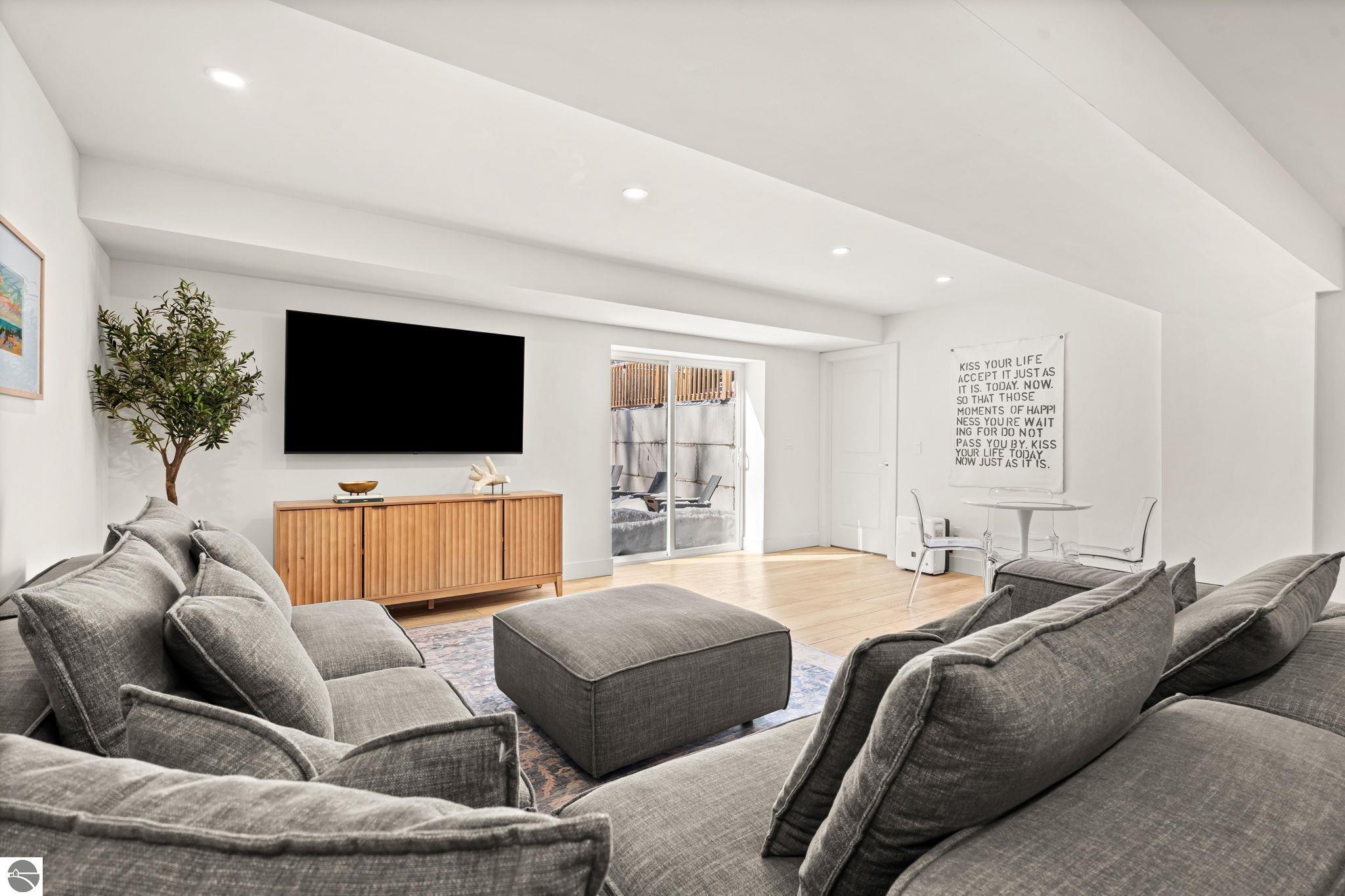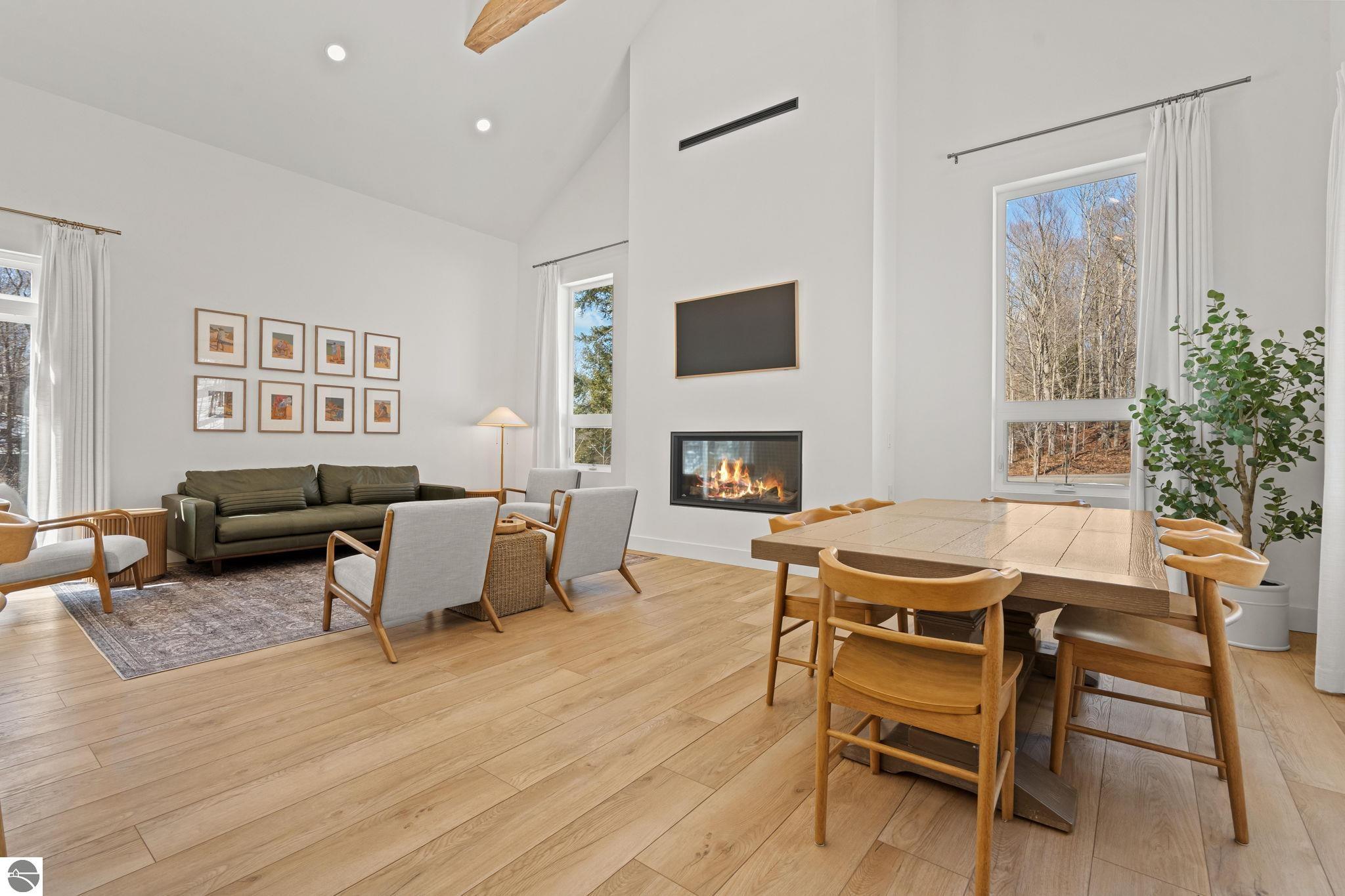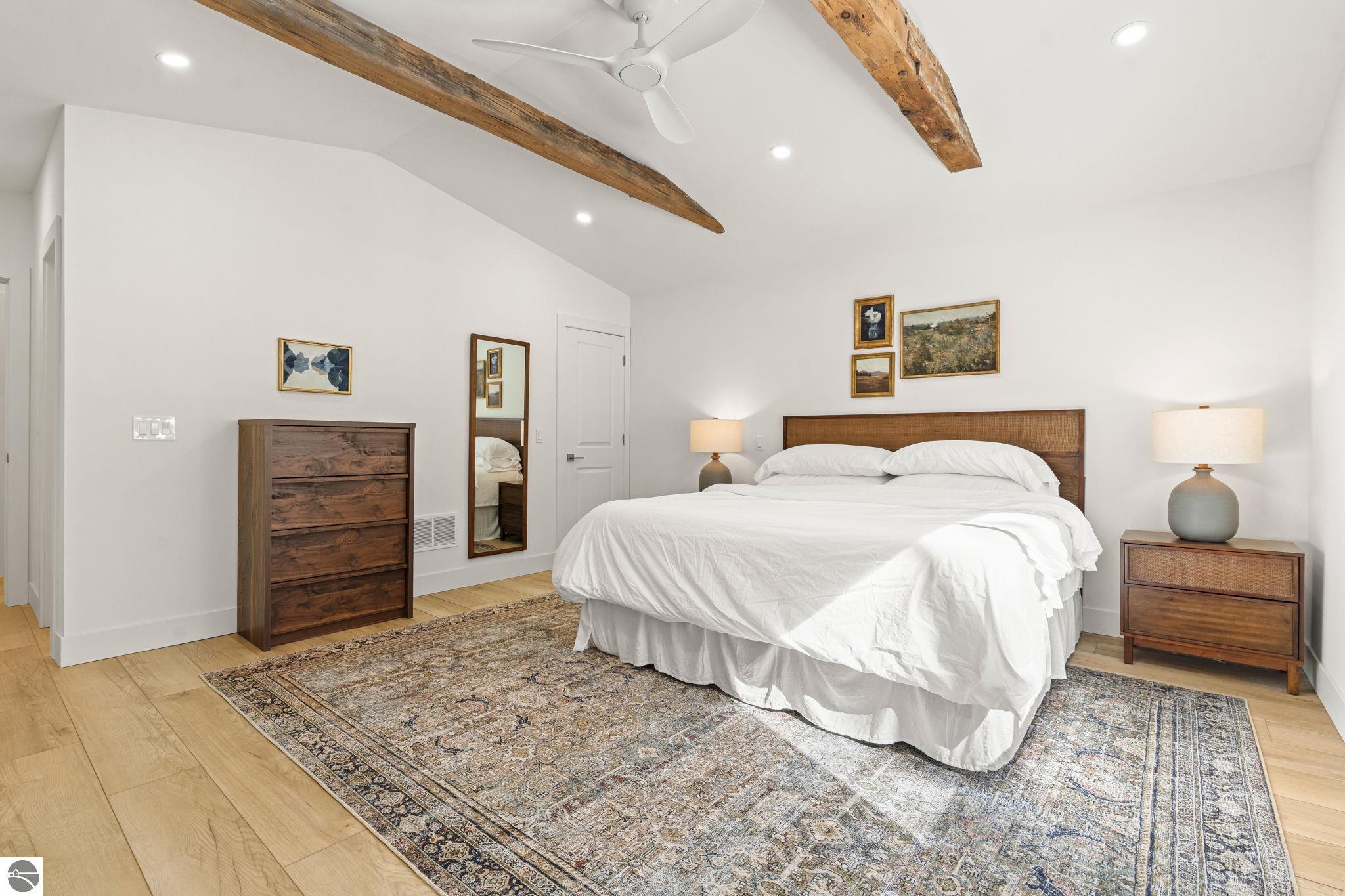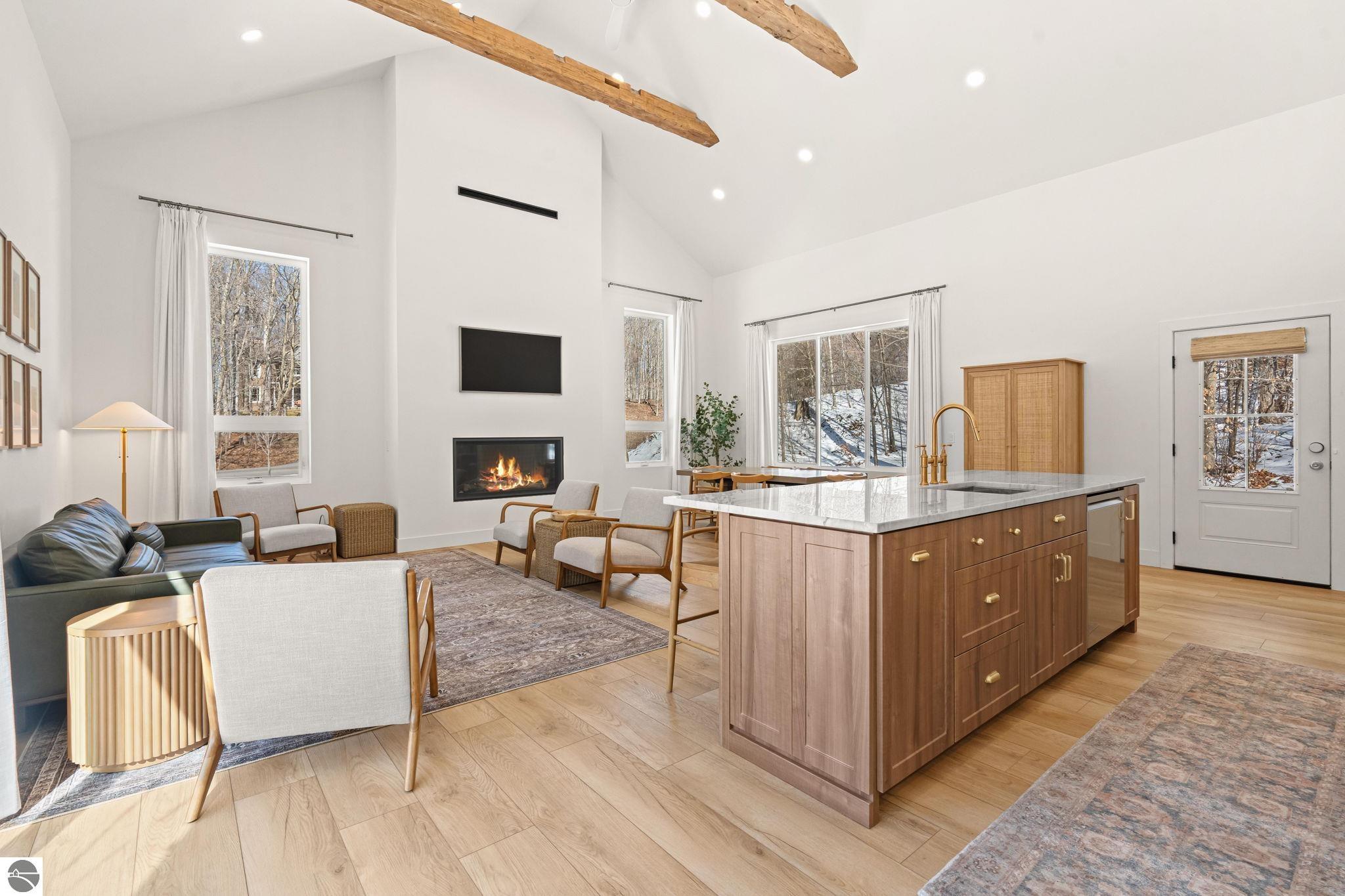 Tucked into a quiet wooded setting near the shores of South Lake Leelanau, this beautifully crafted four bedroom, three bath home, offers more than 3,100 square feet of thoughtfully designed living space where natural materials and modern finishes come together. The main living area features soaring vaulted ceilings and striking reclaimed white pine beams dating back to the 1800s, creating a warm architectural centerpiece full of character and history. The kitchen showcases stunning Mykonos quartzite countertops and an open layout ideal for gathering and entertaining. The fully finished walkout lower level expands the living space with a second patio and additional room for guests, recreation, or relaxed evenings at home. Multiple outdoor areas provide peaceful spaces to enjoy the surrounding woods and Northern Michigan landscape. Set on an expansive 1.81 acre parcel made up of four separate lots, the property offers excellent long term flexibility. A future owner may choose to retain the additional lots for privacy or explore the potential to sell or develop them in the future. Built in 2025 with a high efficiency building envelope that includes spider insulation and natural gas service, delivering exceptional energy performance and low utility costs year round. Durable Hardie Board siding and quality craftsmanship provide lasting value and low maintenance ownership. Just a short walk from South Lake Leelanau, owners have the option to join the nearby Timberlee beach club, while the public launch at Paradise Cove makes it easy to spend the day on the water. The location offers a peaceful retreat while remaining conveniently positioned between Traverse City and the waterfront towns of Leland, Suttons Bay, and Glen Arbor. The home is being sold completely furnished and turnkey, allowing the next owner to step in and immediately begin enjoying everything Northern Michigan has to offer.