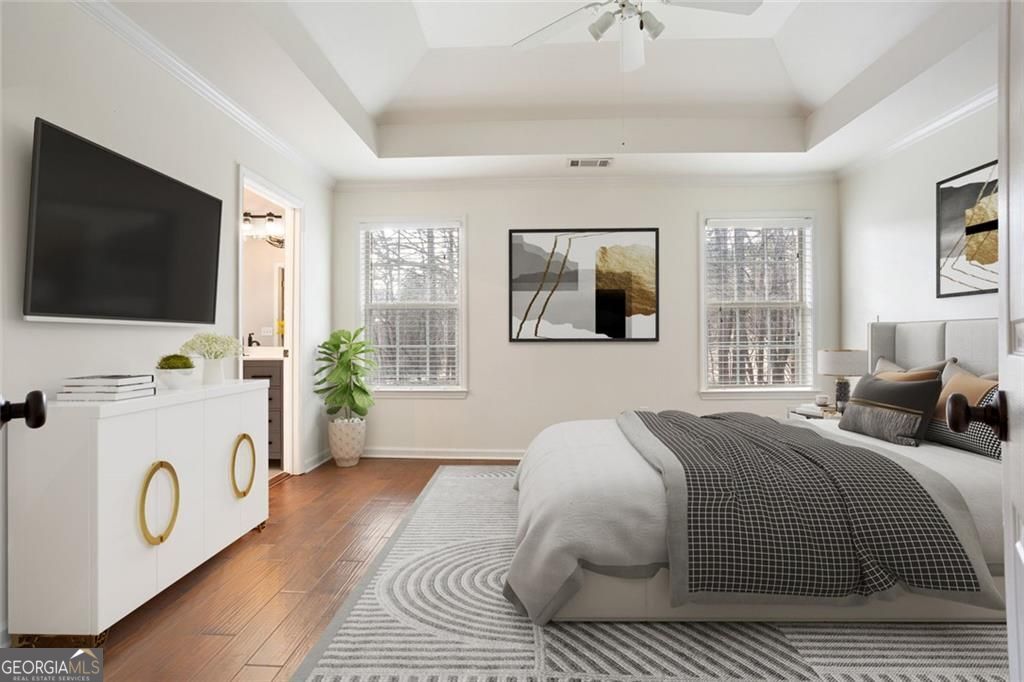 Beautifully maintained Smyrna home offering bright living spaces, flexible layout, and a location close to parks, trails, and Smyrna Market Village. The main level features a vaulted living room with plantation shutters and fireplace that opens to the kitchen and breakfast area. Kitchen includes granite countertops, stainless steel appliances, gas range, and space for a kitchen table, creating an easy flow for both everyday living and entertaining. The sunroom is a definite highlight of the home. With its own dedicated system for year round comfort, this space works perfectly as an additional living area, home office, or workout room. Upstairs, the spacious primary suite offers abundant natural light and an updated bathroom featuring a frameless glass shower, soaking tub, and huge walk in closet. Additional bedrooms provide excellent flexibility, including a large secondary room ideal for a bonus living space, home office, or playroom. Wide plank luxury flooring runs throughout the home with no carpet. The fenced backyard includes a patio and manageable grassy area for outdoor enjoyment. Convenient Smyrna location near Rhyne Park and the Silver Comet Trail, with Smyrna Market Village just three miles away. Zoned for King Springs Elementary, Griffin Middle, and Campbell High. Roof replaced in 2020. HVAC replaced in 2023.