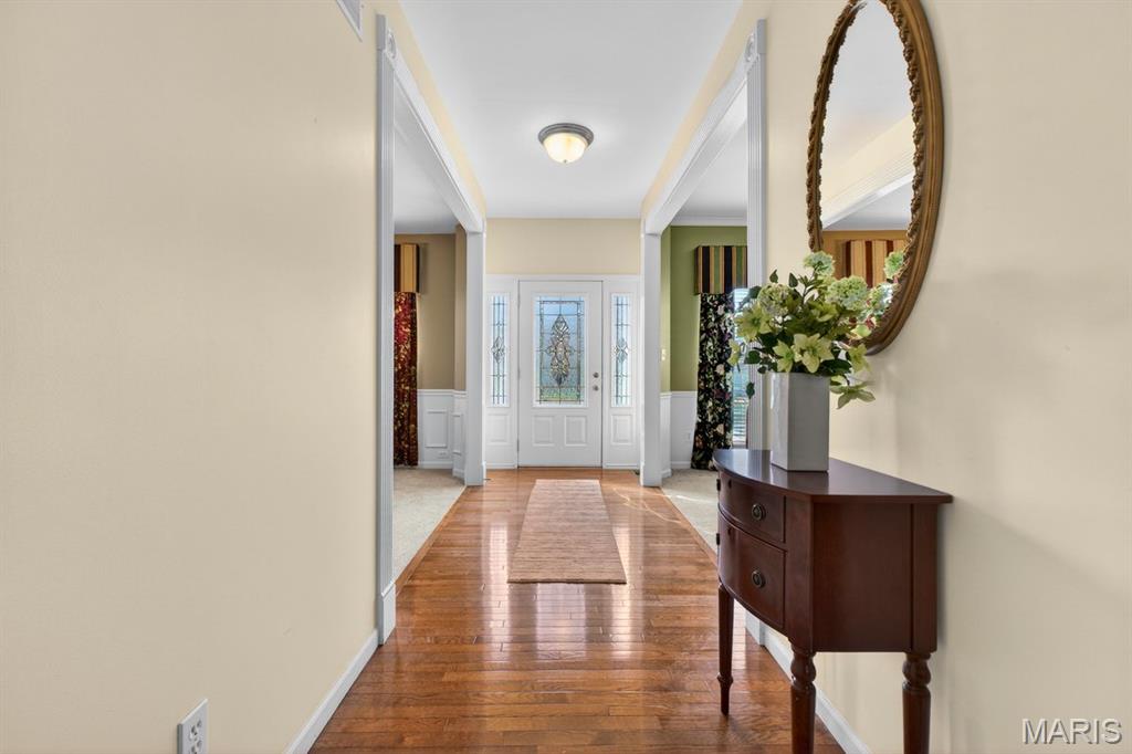 Welcome to 1548 Hunters Meadow Dr, a beautifully maintained 2-story home nestled in an established neighborhood in O'Fallon. With over 3,000 square feet of living space, this home offers the perfect blend of comfort, functionality, and timeless style. From the stately columned front porch to the spacious interior layout, every space feels inviting and thoughtfully designed. Inside, hardwood floors lead you through formal living and dining areas, while the family room features a warm brick fireplace with built-ins and large windows that bring in natural light and views of the wooded backyard. The kitchen offers generous cabinetry, a center island with seating, and an adjoining breakfast room that opens to the patio - making it easy to entertain or enjoy quiet mornings at home. Upstairs, the vaulted primary suite provides a relaxing retreat with a spacious bath, soaking tub, separate shower, and large vanity. Additional bedrooms offer flexibility for family, guests, or a home office. Situated on a lot that backs to trees, the backyard offers privacy and a peaceful setting, while the 3-car garage provides plenty of room for vehicles and storage. The full basement is oversized with additional space under the garage! A home with space to live, entertain, and grow - all in a desirable O'Fallon location. This isn't just square footage - it's a home that lives well. Siding, Roof and 2 furnaces are 1 year old. 2 AC compressors are 2 years old.