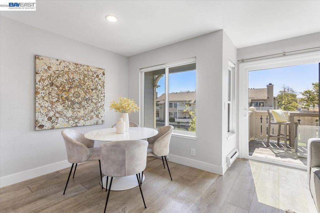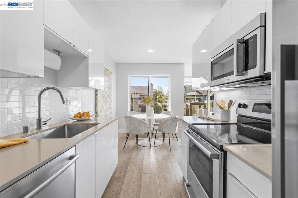 Wake up to tranquil water and tree views in this luxurious, upper-level condominium in The Shores at Marina Bay. This exquisitely renovated one-bedroom home features dual-paned windows, custom closet systems, a built-in media cabinet, a towel warmer in the bathroom, and a full-size washer and dryer. The light-filled living, dining, and kitchen areas showcase peaceful water views, creating a calm and inviting ambiance throughout. The elegant updated kitchen features quartz countertops and high-end stainless-steel appliances, combining style and functionality. Step outside to the private balcony overlooking lush landscaping and a picturesque lagoon - perfect for morning coffee, relaxed al fresco dining, and sunsets. Enjoy the surrounding natural setting, where herons, egrets, ducks, & springtime ducklings are frequent visitors, and beautiful magnolia tulip trees enhance the community's landscaping. The Shores community offers 2 pools/spas, a fitness center, and skillfully maintained grounds. Ideally located near the Bay Trail's 17 miles of scenic walking and biking paths, the nearby Marina Bay Farmers Market, waterfront restaurants, and Richmond's shoreline. Kayaks can be carried to the Bay for paddling along the waterfront. Definitely one of the most beautiful homes in The Shores!