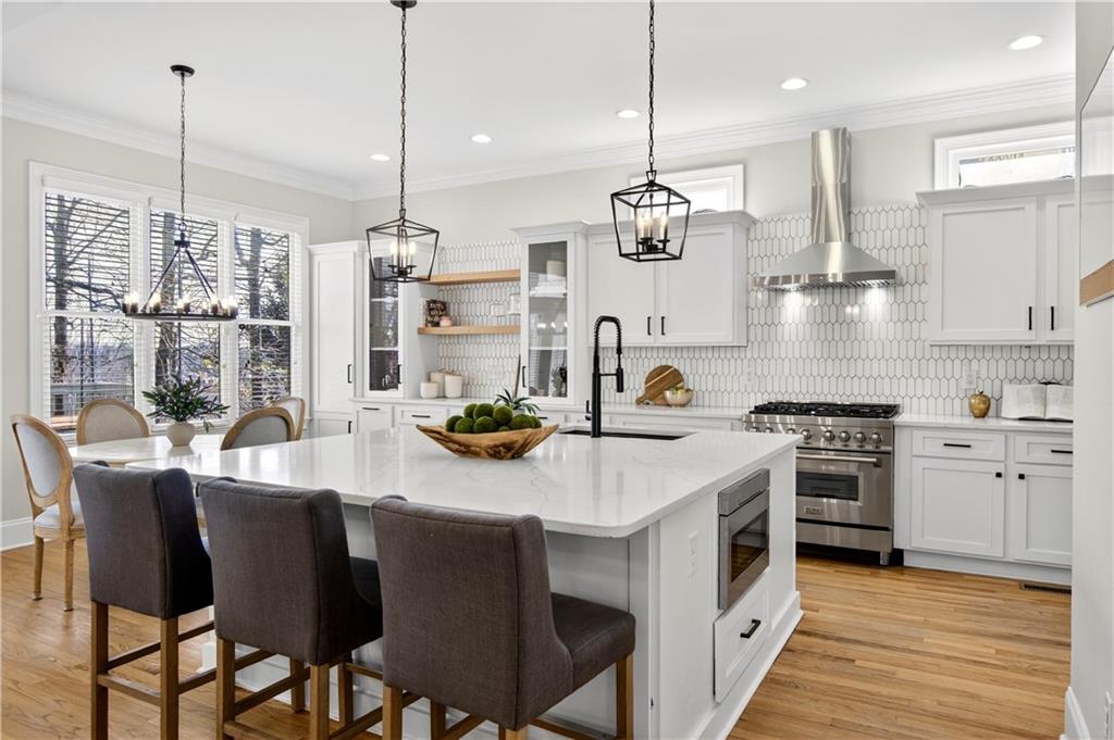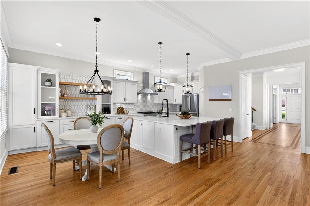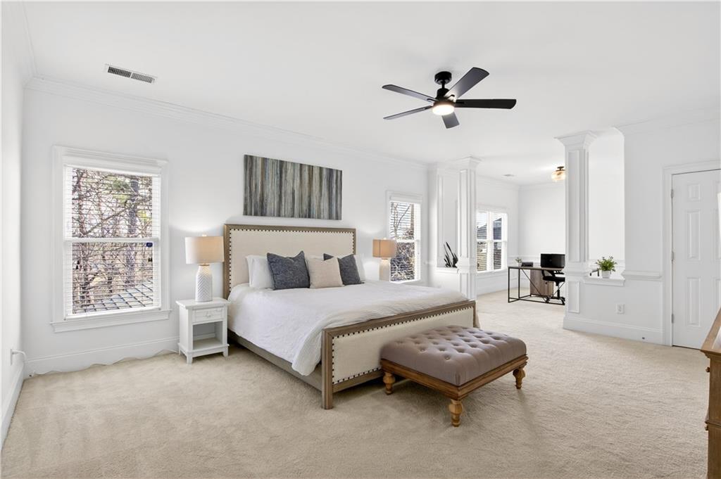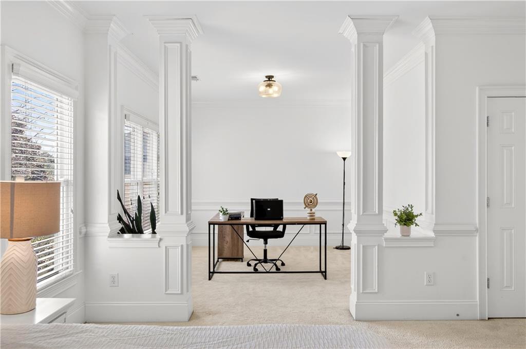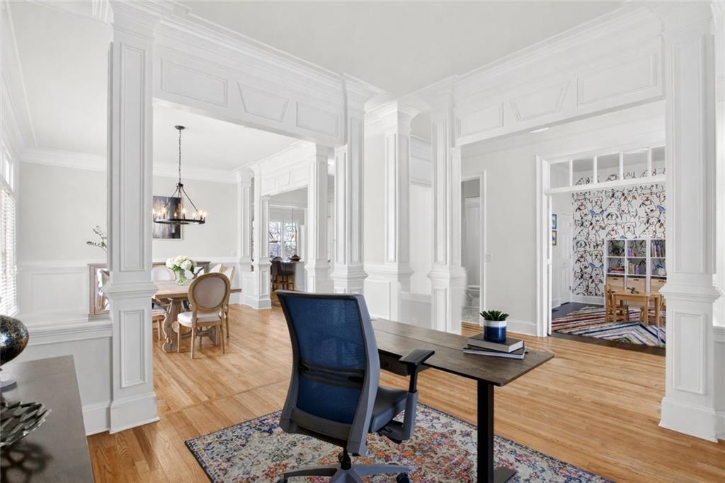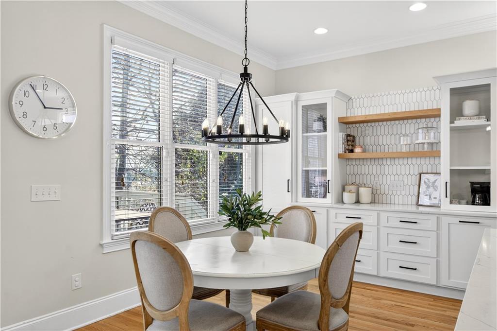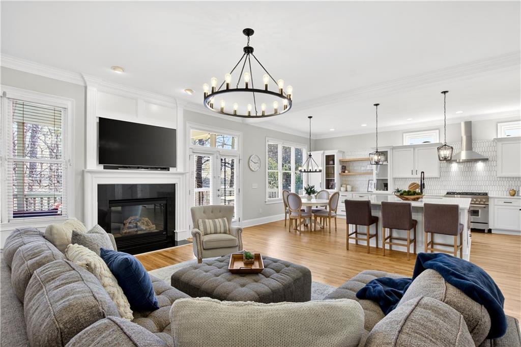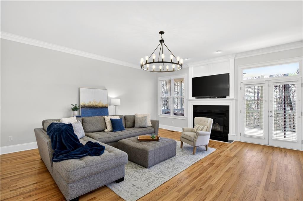 Ideally set on a quiet cul-de-sac in the charming Lois Pointe community - one of Smyrna/Vinings' best-kept secrets - this beautifully maintained home offers timeless architecture, thoughtful updates, and exceptional indoor-outdoor living. Situated on an oversized lot with a spacious backyard, the home welcomes you with a classic front porch and a light-filled interior featuring 10-foot ceilings, extensive trim work, hardwood floors across the main level, and fresh interior paint. Just off the entry, the front living room - currently used as a home office - offers flexible space for a sitting room, library, or additional gathering area. The fully renovated kitchen features stainless steel appliances, generous quartz countertops, an oversized island with breakfast bar, and a walk-in pantry, opening seamlessly to the fireside family room for easy everyday living and entertaining. French doors lead to a covered back porch overlooking the private backyard, where you can enjoy beautiful sunrises and a peaceful natural setting. The backyard feels peaceful and tucked away, with mature trees and beautiful touches of color creating a calm outdoor setting. From the front porch, you can catch the sunset in the evenings, adding to the home's inviting outdoor spaces. A full bedroom and bath on the main level provide excellent flexibility for guests. Upstairs, the oversized primary suite offers a true retreat with a spacious sitting area ideal for a nursery, reading lounge, or office, while two additional generously sized bedrooms share a Jack-and-Jill bath and the laundry room completes the upper level. The finished terrace level expands the home's versatility with a stylish bar and studio-style living area featuring a built-in Murphy bed - perfect for an in-law suite, guest space, media room, or recreation area - along with a full bath. With its oversized yard, renovated kitchen, flexible terrace level, and prime location near the Silver Comet Trail and close to West Village, this home offers the perfect balance of charm, comfort, and convenience just minutes from Vinings, Smyrna Market Village, The Battery, parks, dining, and major commuter routes.