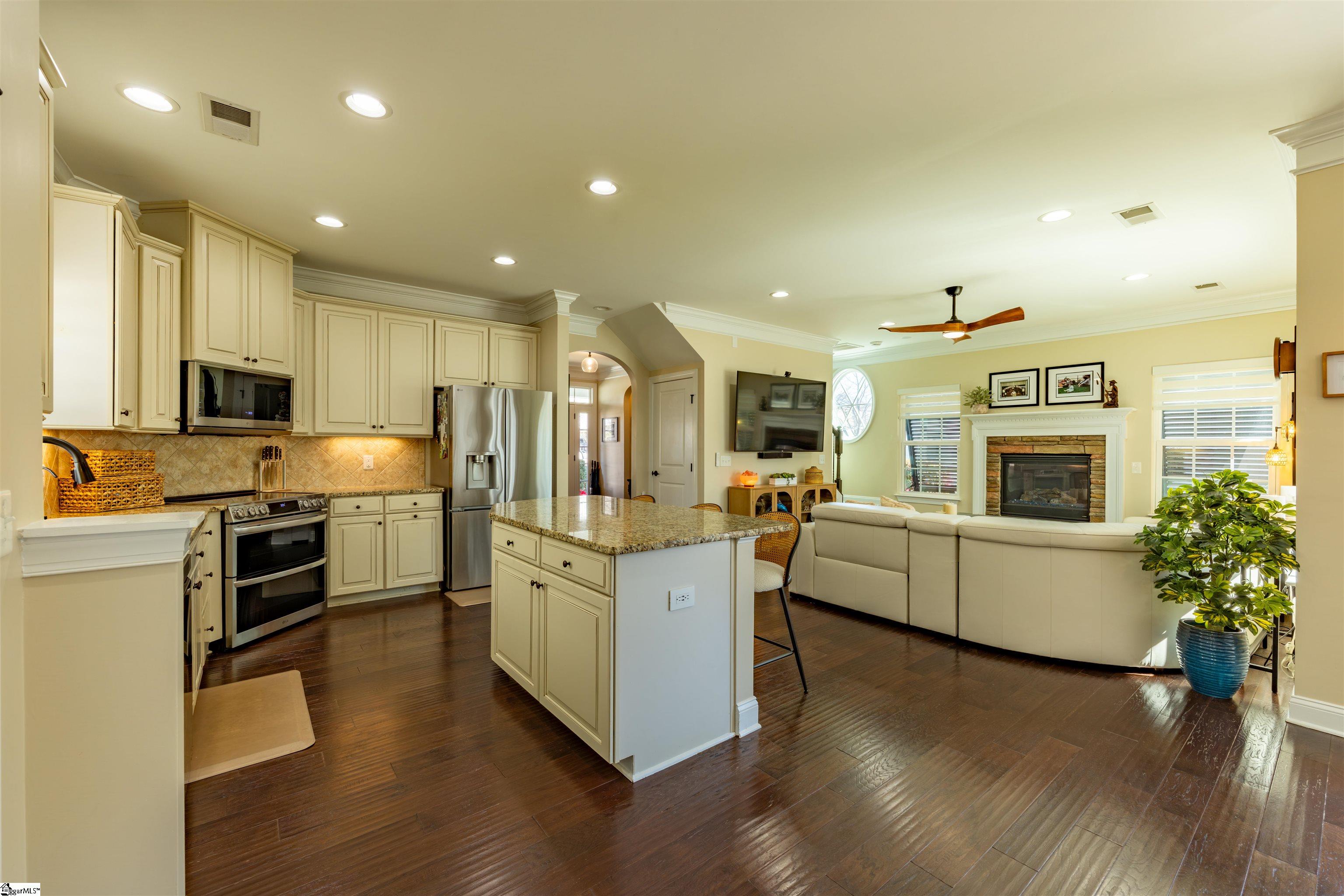 Welcome to Hollingsworth Park in Midtown Greenville! This charming home at 10 Alister Drive features a classic rocking chair front porch, Charleston-style shutters, and a welcoming side-yard patio perfect for relaxing or entertaining. Inside, a spacious foyer leads to a dining room with wainscoting on the right - ideal for formal dining or easily converted into a home office. The main level offers beautiful hardwood floors, a convenient guest bathroom, and a walk-in laundry room. The heart of the home is the open kitchen and great room, highlighted by a gas log fireplace with a stunning stone surround. The kitchen features granite countertops, a large island/bar, tiled backsplash, stainless steel appliances, and a French door pantry. The adjacent breakfast/dining area overlooks the side patio and provides plenty of space for everyday dining. Brand-new custom screened porch located just off the rear of the home - perfect for relaxing, entertaining, and enjoying the outdoors year-round. This home offers two staircases. One leads to a spacious flex room with an enormous storage/seasonal closet that is already plumbed for a potential third full bathroom (per previous owner). The second staircase leads to the upstairs bedrooms. The primary suite includes a tray ceiling, large walk-in closet, and a well-appointed bathroom with a fully tiled shower, soaking tub, and double vanity with granite countertops. Two additional bedrooms share a hall bathroom with ceramic tile flooring and a tub/shower combination. The oversized two-car garage features custom glazed floors, a utility sink, and exceptional storage space. Opportunity to purchase the home fully furnished - seller open to negotiations. Located in the highly desirable Hollingsworth Park community, residents enjoy convenient access to the Swamp Rabbit Trail, YMCA, parks, restaurants, and medical offices. Member only pool membership is transferable. This home blends charm, functionality, and an unbeatable location in one of Greenville's most sought-after neighborhoods.