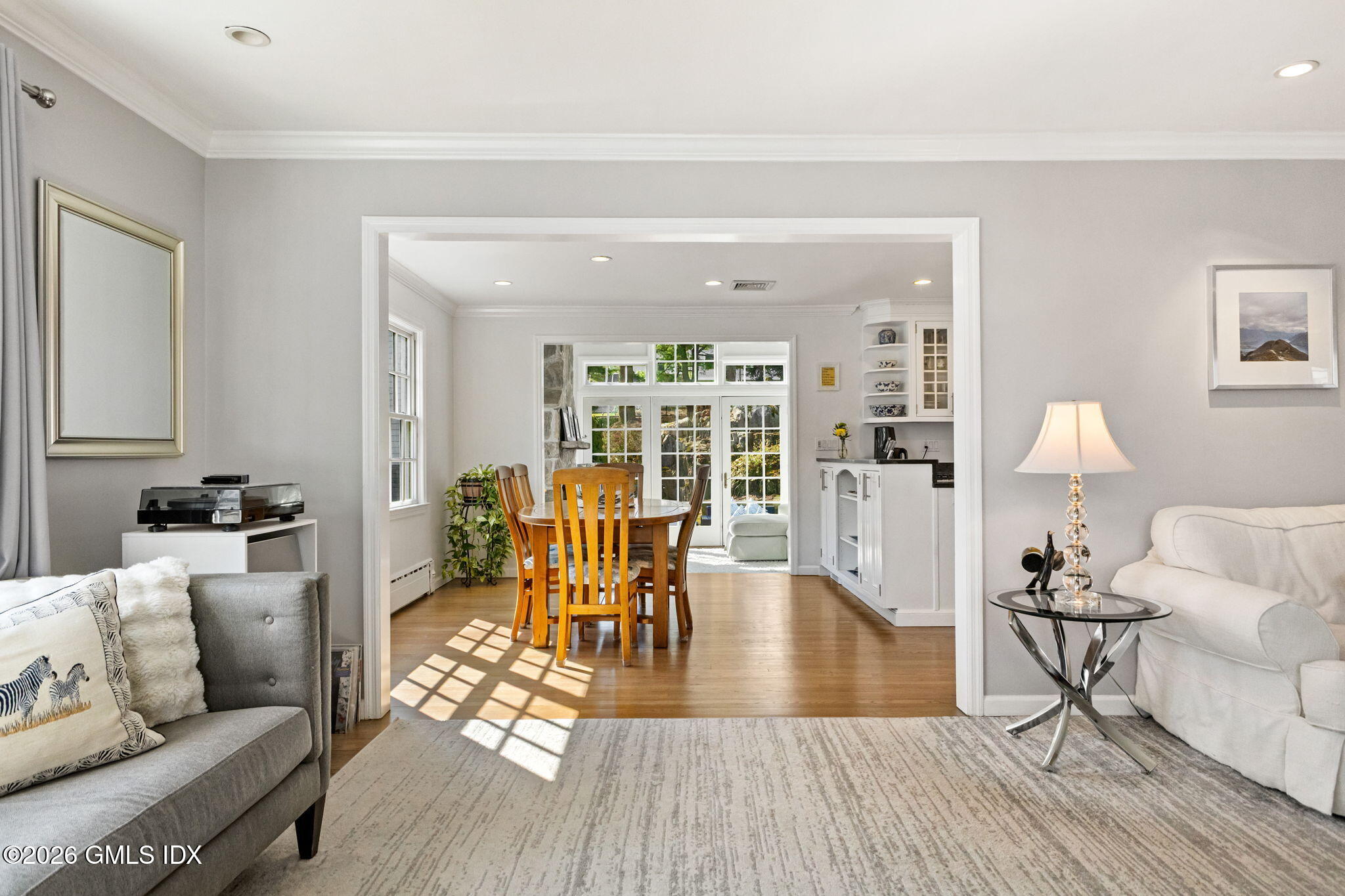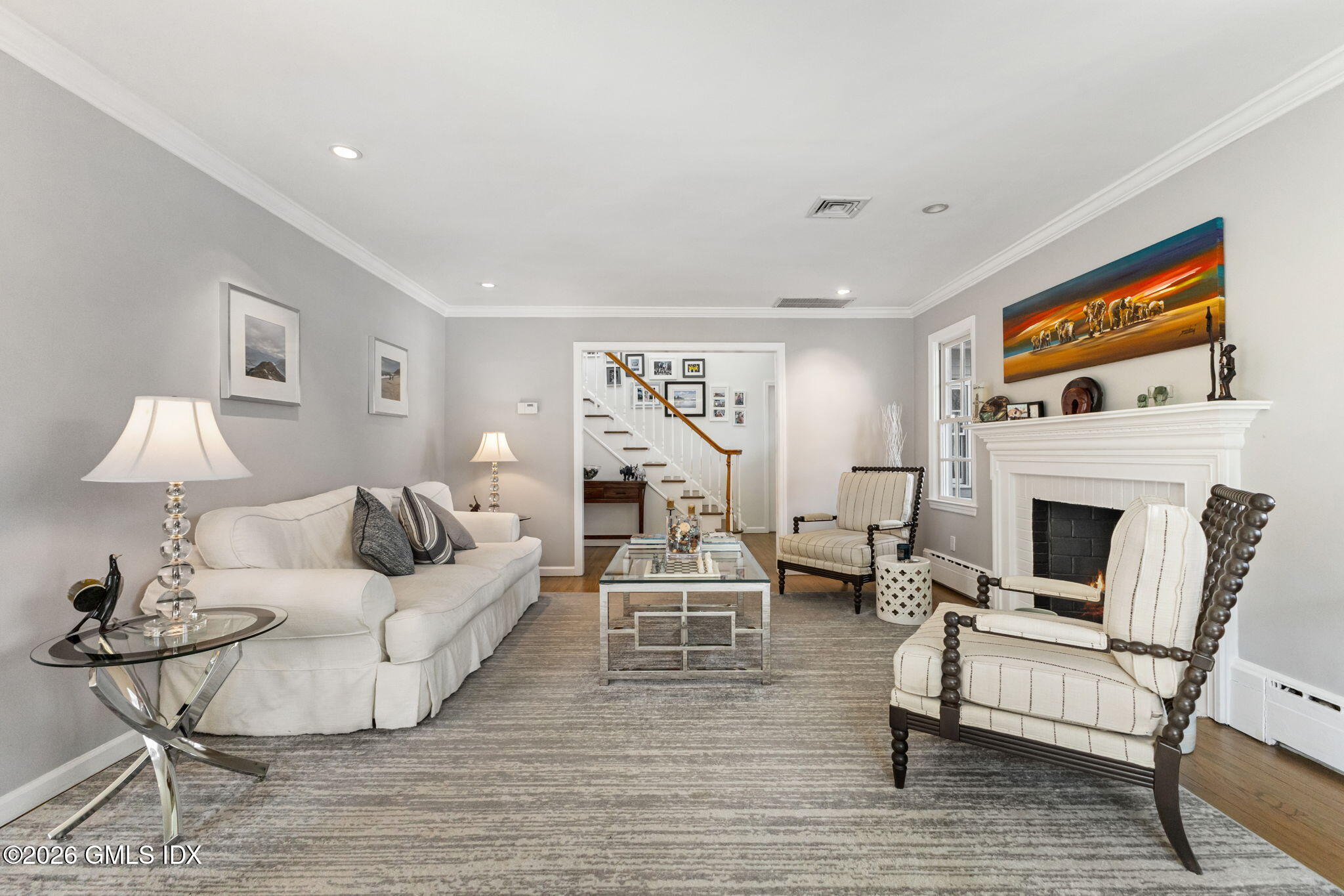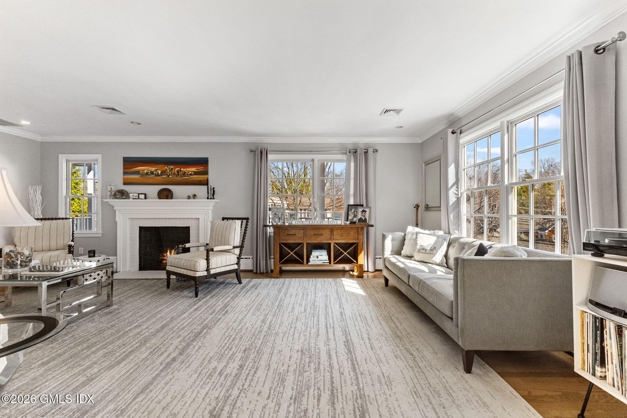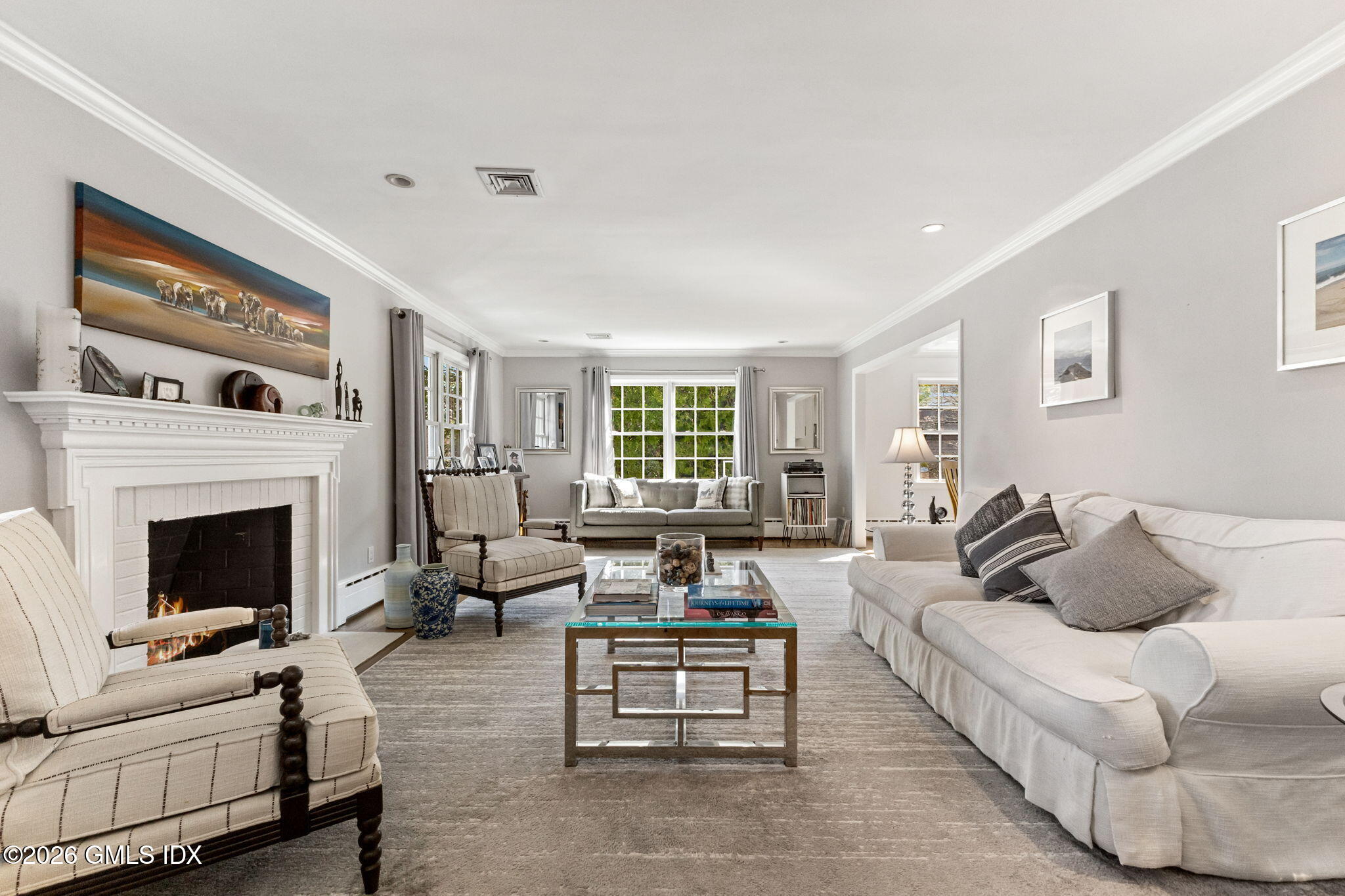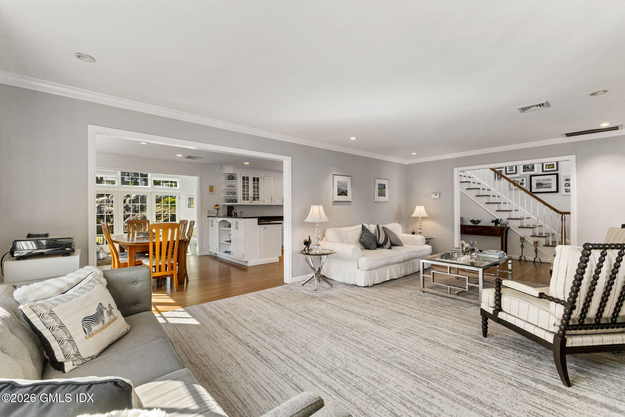 Beautifully maintained 5-bedroom, 4.1-bath rental in Riverside offering generous living space and a flexible layout. The main level features hardwood floors, a welcoming living room open to the dining area and modern kitchen, and a sun-filled family room with a dramatic fieldstone fireplace and French doors leading to a large terrace overlooking private, park-like grounds. A first-floor primary suite occupies its own private wing, while a separate fifth bedroom-ideal for a home office or playroom is located in another wing. Upstairs includes a second primary suite, two additional bedrooms, and a full bath. The finished lower level with separate access offers additional space for recreation, fitness, or storage, plus a dedicated bike/storage room. Two-car garage with a 450 sq ft bonus room above (not included in total square footage), ideal for a studio, workspace, or gym. Conveniently located near Binney Park, Perrot Memorial Library, Old Greenwich Village, Metro-North train, Riverside Elementary, and Eastern Middle School. This home offers the convenience of village living in one of Greenwich's most desirable neighborhoods.