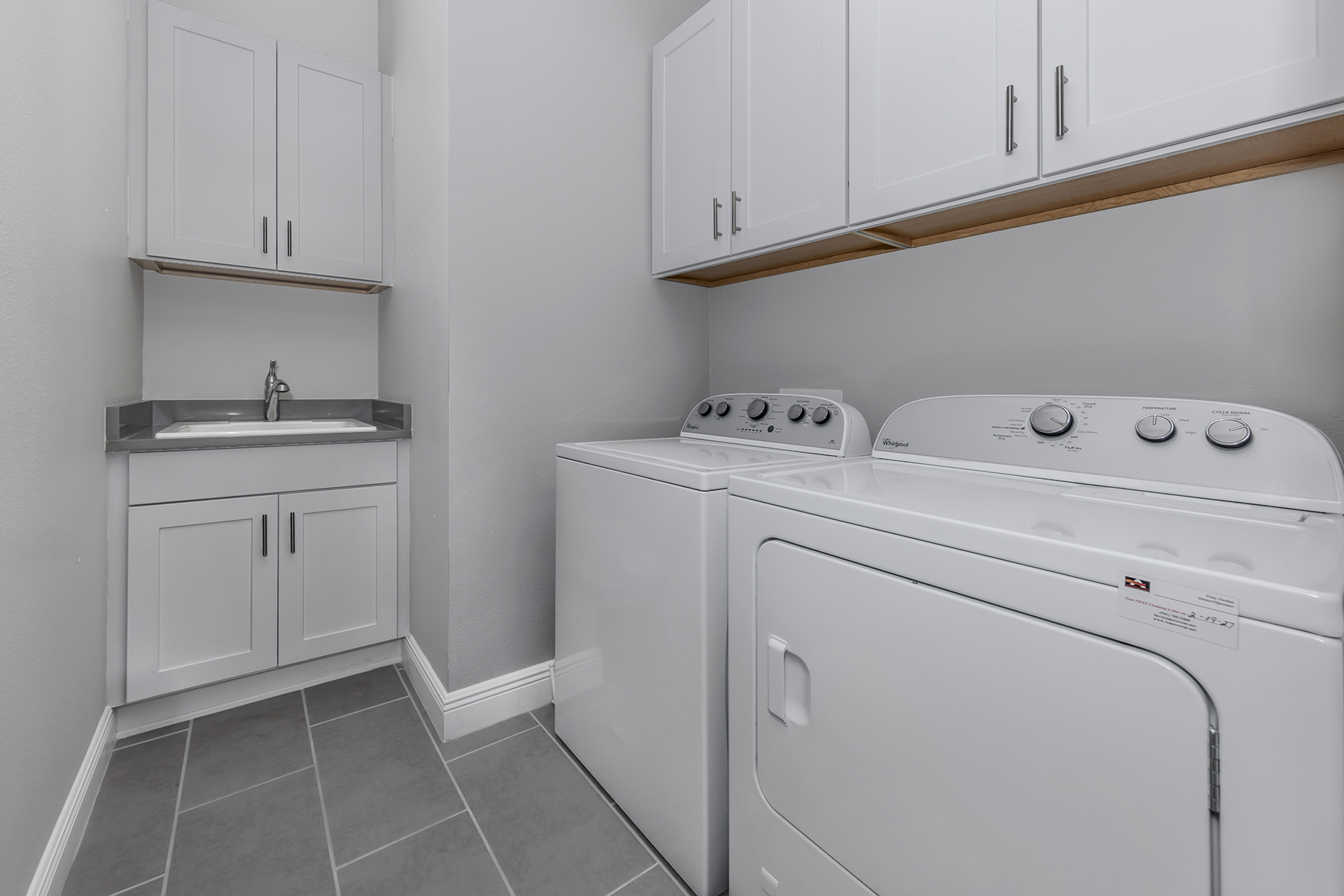 The home features crown molding and tile flooring in the main living areas, hardwood flooring in the bedrooms and den and in-ceiling lighting throughout. In addition, the kitchen features upgraded wood cabinets, quartz counters, a marble tile backsplash, and stainless-steel appliances including a gas range. The owners' suite includes a spacious bath with dual sinks and a large glass shower, as well as a huge walk-in closet affording maximum convenience and storage. All three-bedroom closets feature attractive upgraded oak shelving.