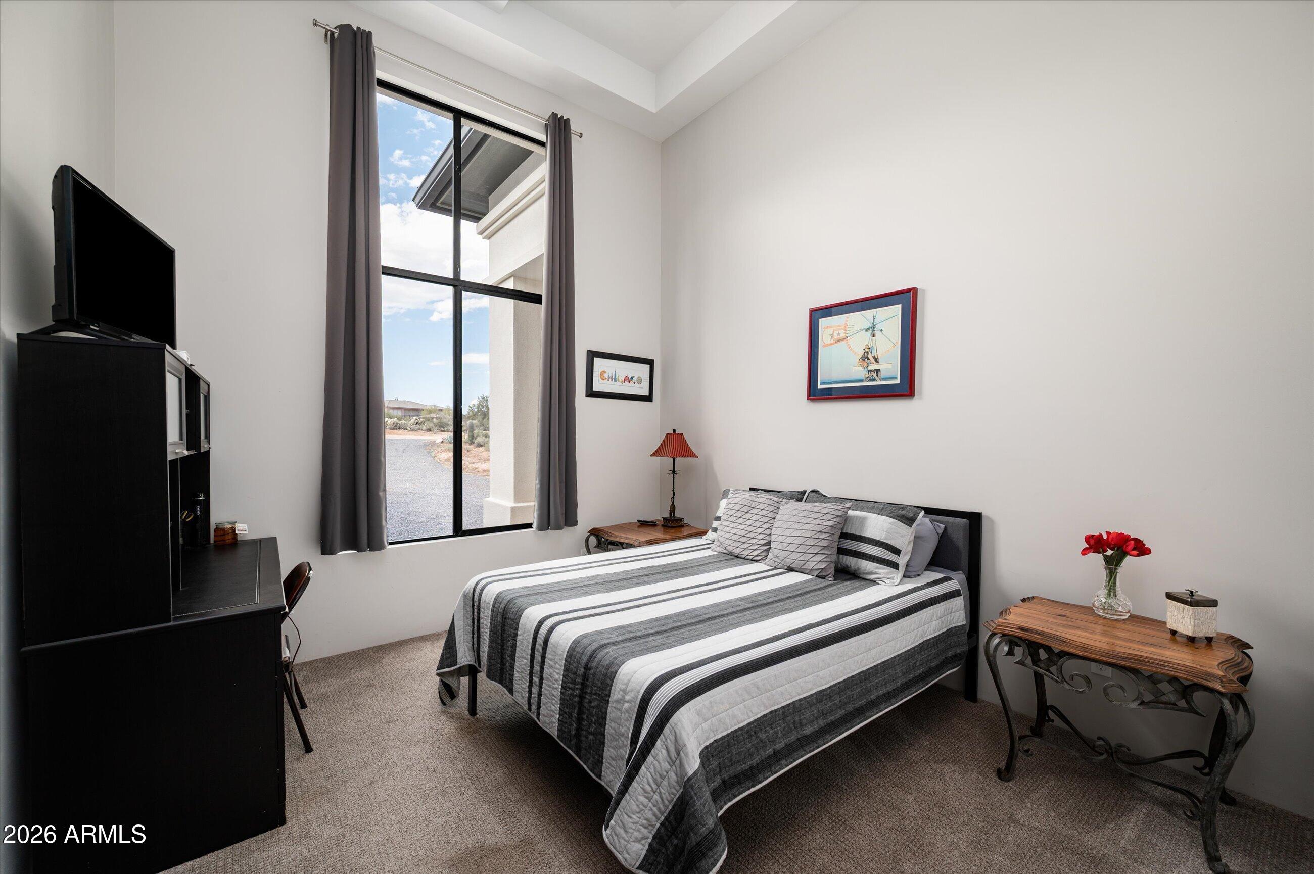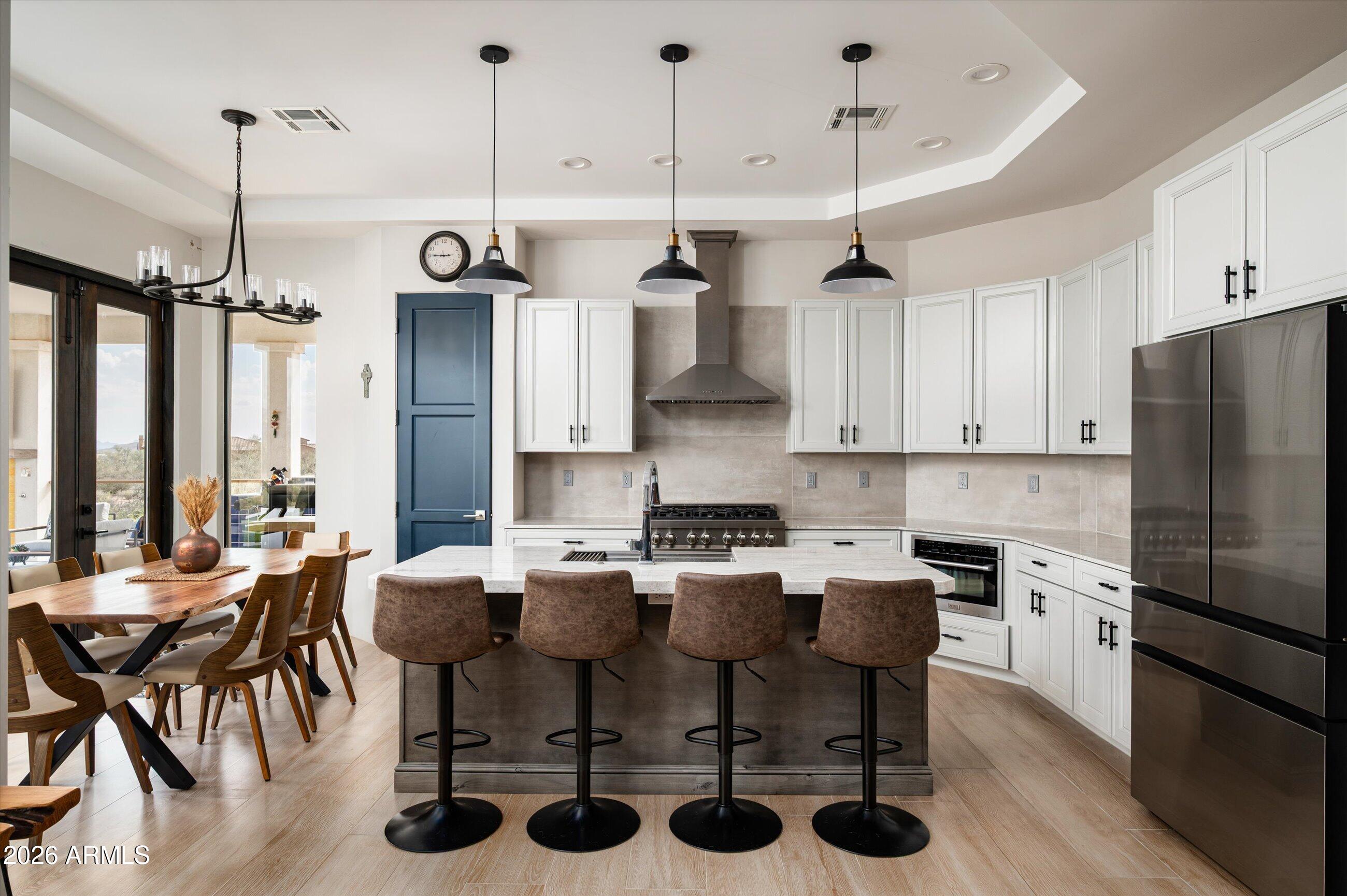 In the scenic desert community of Rio Verde, this stunning modern desert retreat offers luxury living on a sprawling 2.49-acre private lot with breathtaking mountain views. This custom home blends sophisticated design with effortless indoor-outdoor living. Warm plank tile flooring and designer finishes flow throughout the open floor plan. The chef's kitchen featuring ZLINE appliances, a large island w/quartzite countertop, and seamlessly opening to the great room. At the heart of the home, dramatic 6 panel folding glass doors create a seamless transition to the resort-style backyard. Featuring a hot tub, Ramada, outdoor BBQ with sink, mini fridge, and gas fireplace. With luxury finishes, and stunning desert surroundings, this home captures the very best of Arizona living.