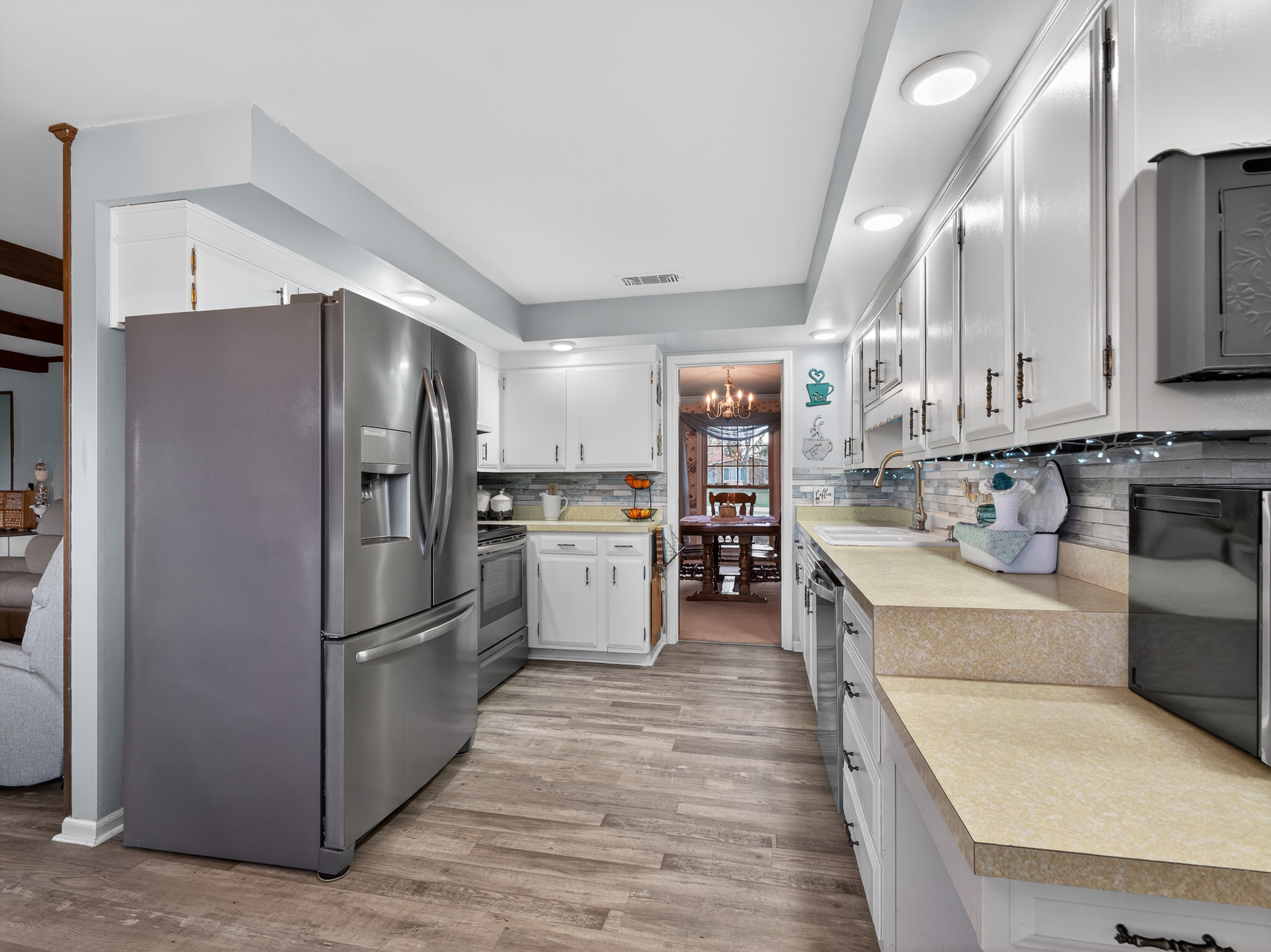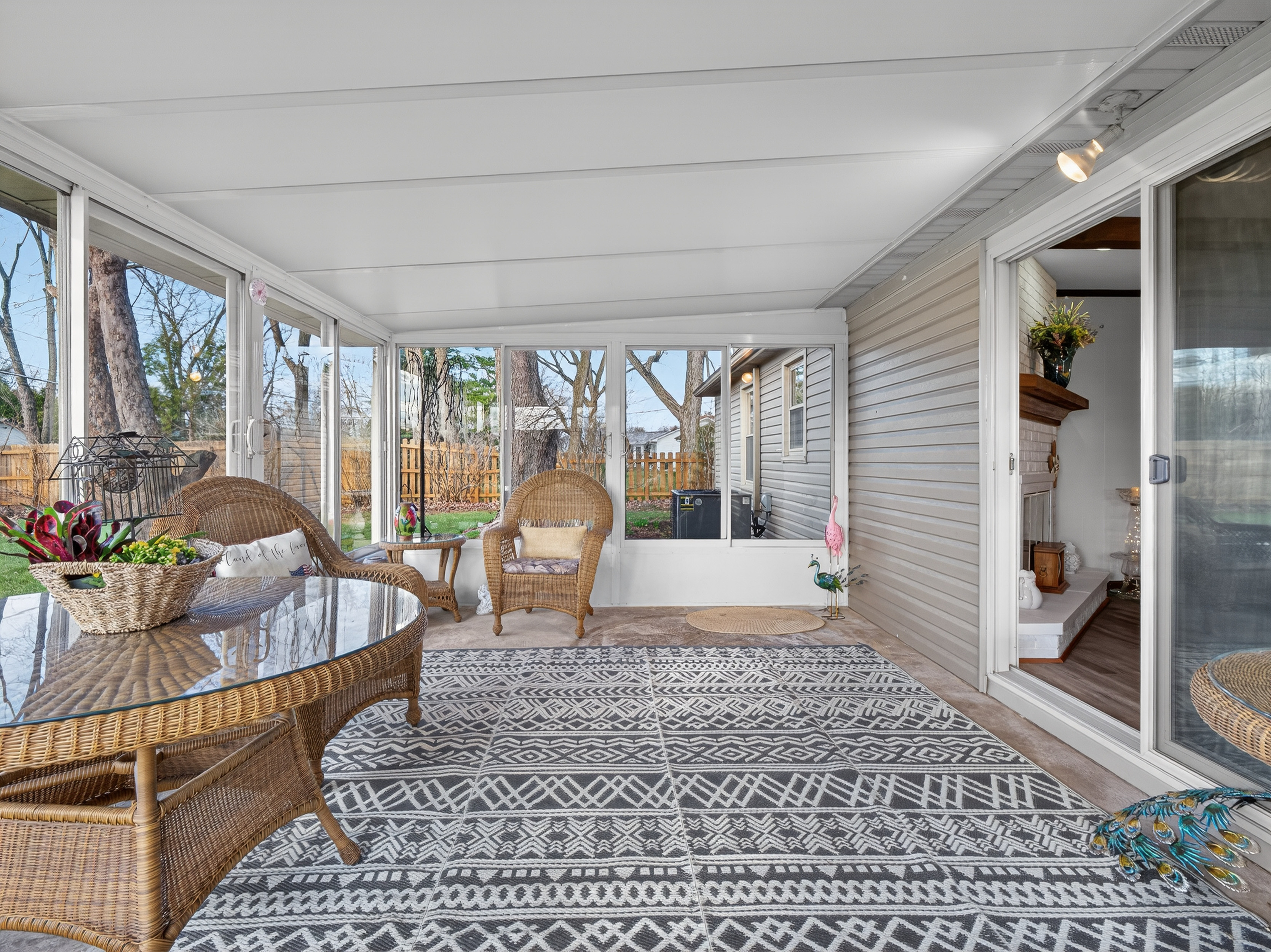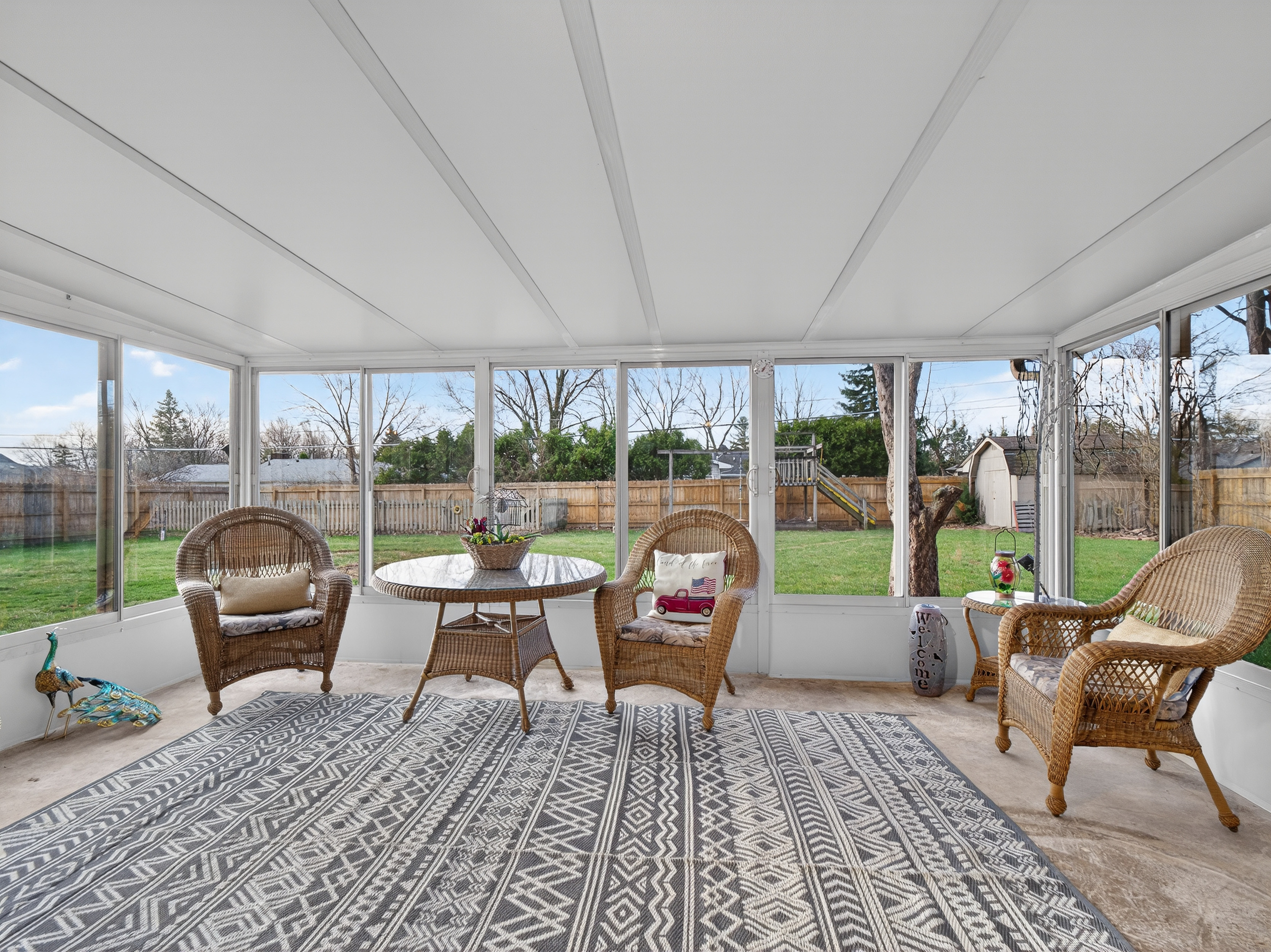 The home includes three generously sized bedrooms, highlighted by a private master wing with double closets and a full bath. A large four seasons room with sliding windows provides year-round enjoyment and showcases expansive views of the backyard—perfect for relaxing or entertaining.