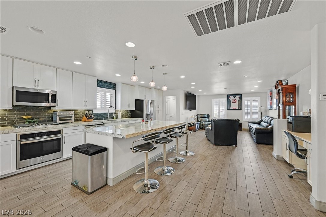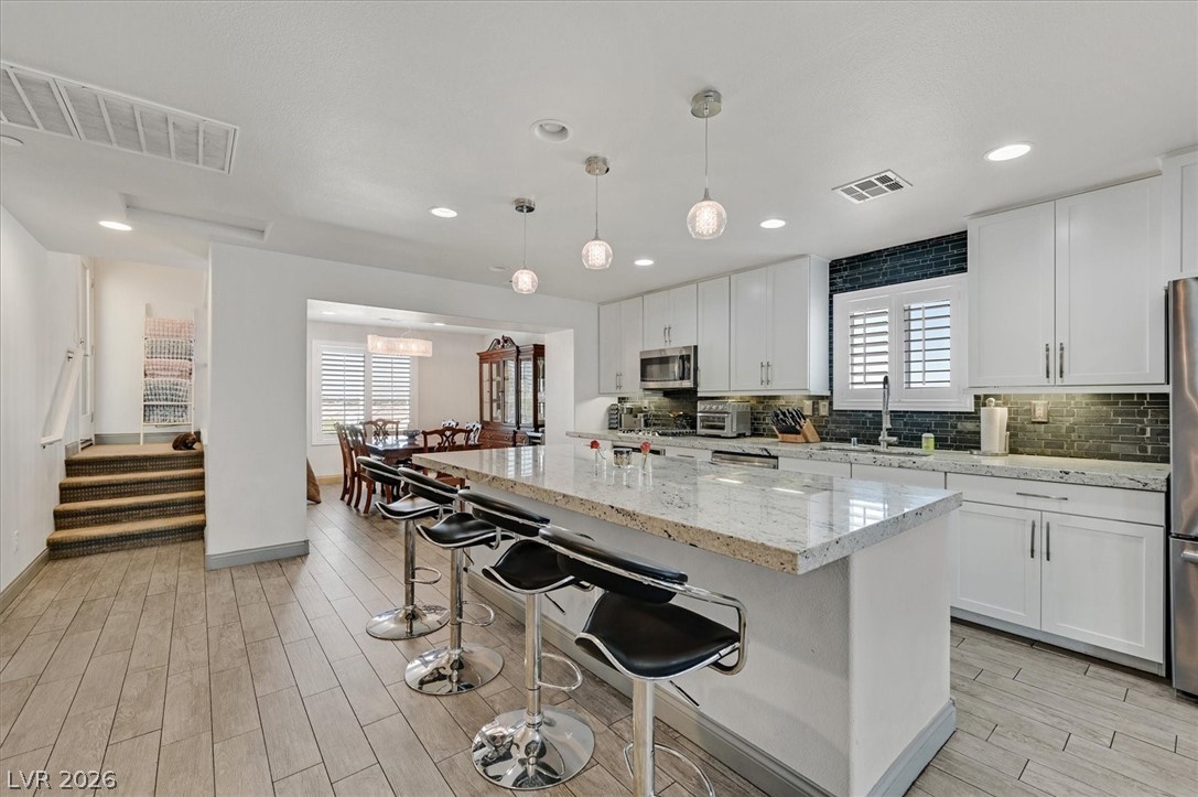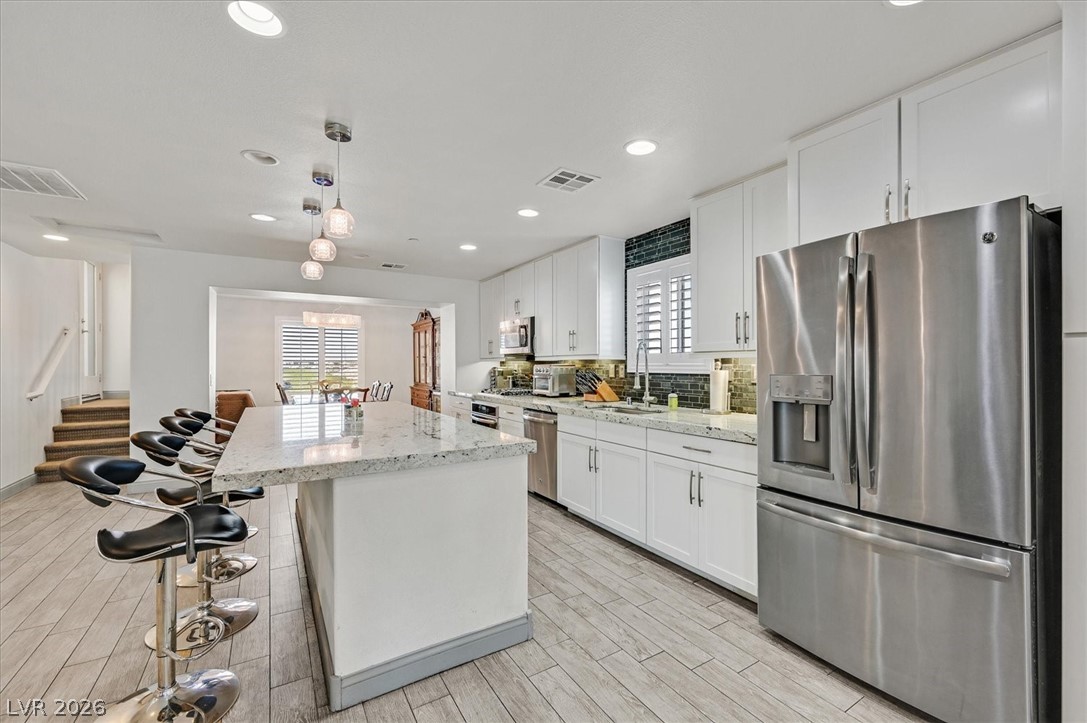 Experience luxury living in this stunning three-story townhome with a private rooftop deck offering 360 views of the Las Vegas Strip and surrounding mountains. This 2,120 sq. ft. home features three en-suite bedrooms with walk-in closets and an open-concept third floor ideal for entertaining. New Carpeting! The gorgeous kitchen includes stainless steel appliances and a large center Island, flowing into a spacious living and dining area. The rooftop deck boasts a built-in gas fireplace, gas grill, and unobstructed skyline views. Additional features include plantation shutters, tile flooring, recessed lighting, a tankless water heater, and a unique dining room light fixture. Located near Reunion Trails Park in a Gated community close to shopping, dining, and freeway access. This home blends modern luxury with an exceptional lifestyle.