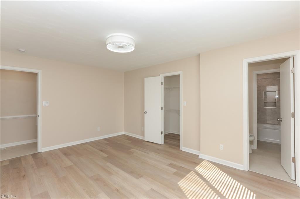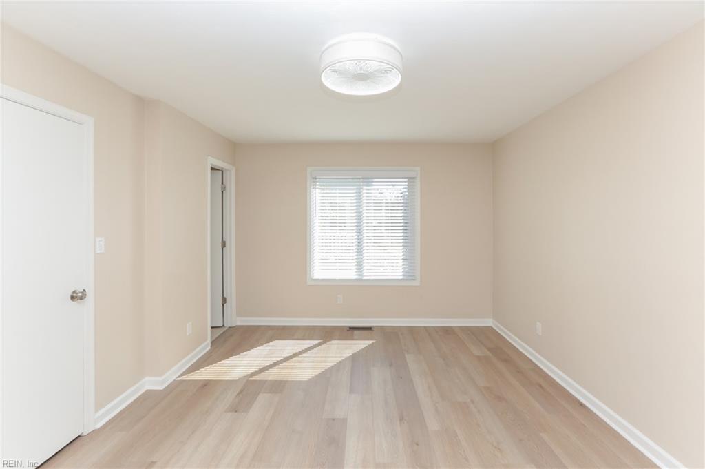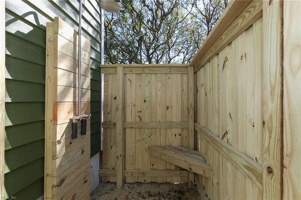 Bedrooms on first floor. Two bedrooms each have their own sink and toilet and share the shower. Living room, eat in kitchen on second floor with a full bathroom. Outside Shower and ample off-street parking. Freshly renovated and updated with new finishes in the bathrooms and kitchen. All flooring is new LVT and freshly painted. HVAC, Hot water, Windows and Roof replaced within the last 2 years. Less than 150 yards to the Chesapeake Bay. Deck off of kitchen has some limited water views.