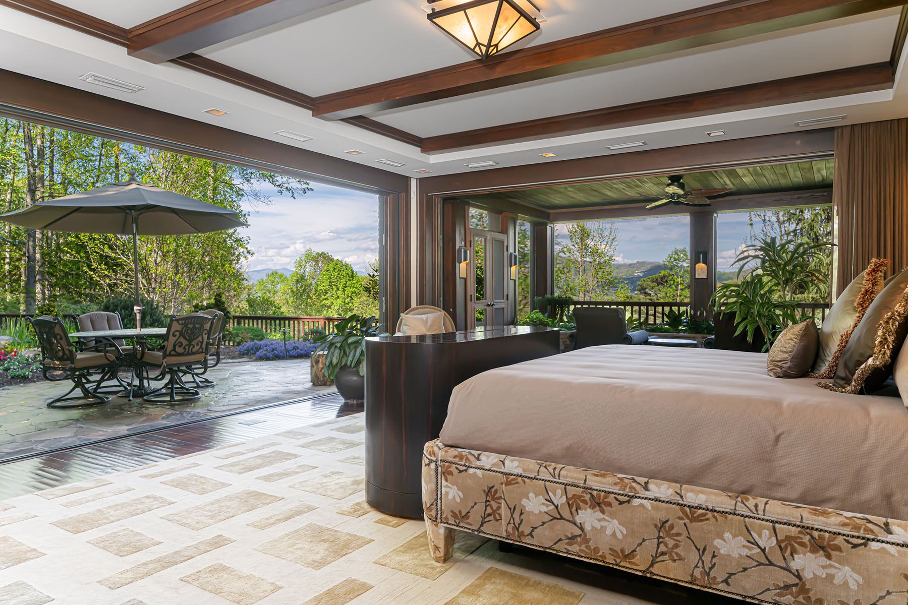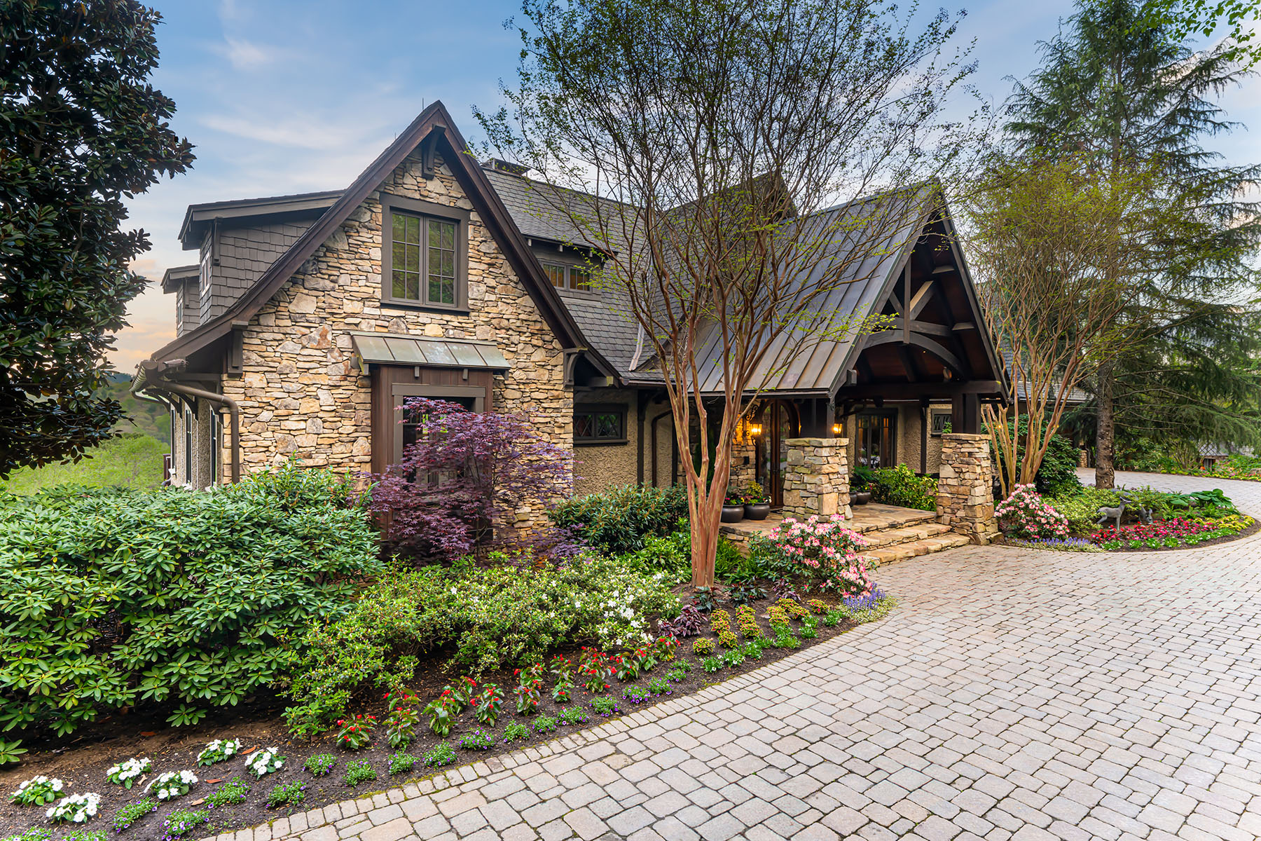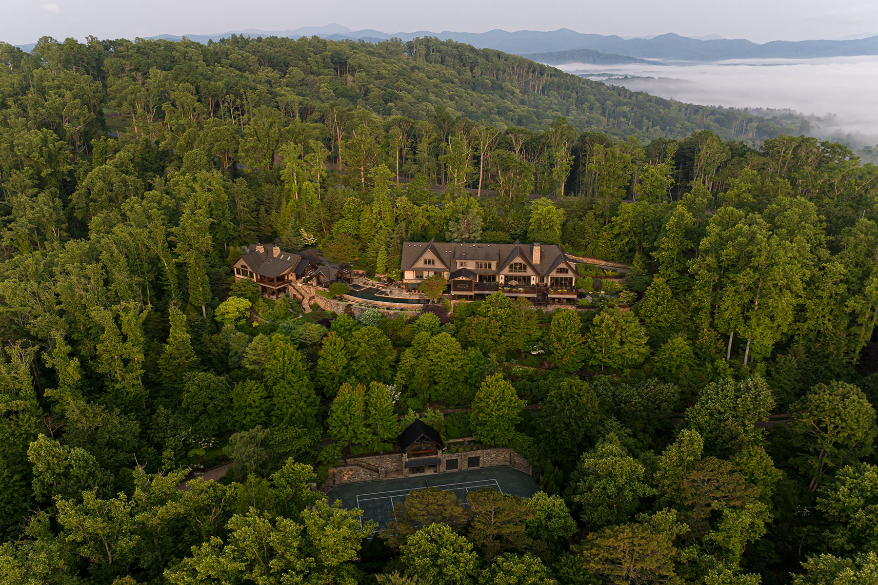 Just minutes from downtown Asheville, 66 North Deerhaven Lane is an extraordinary gated luxury estate in Asheville, N.C. offering over five acres of private gardens, award-winning landscape design and refined mountain living in the heart of the Blue Ridge Mountains. Known as Deerhaven Gardens, this remarkable property combines architectural elegance, world-class outdoor living and exceptional privacy just minutes from Asheville's dining, arts and cultural amenities. The residences were completely renovated and expanded in 2011 with the estate's grounds were masterfully designed by renowned Asheville landscape architect Charles Clay Mooney, whose work at Deerhaven Gardens earned the American Society of Landscape Architects' highest national award. The property is centered around a spectacular 77-foot infinity-edge swimming pool with cascading waterfalls, natural stone terraces, streams and botanical gardens, recognized by Luxury Pools & Outdoor Living Magazine as Best Overall Outdoor Living Design in the United States. The main residence is designed to seamlessly blend indoor and outdoor living. A dramatic great room with vaulted ceilings, exposed beams and tongue-and-groove paneling opens through more than 200 feet of NanaWall accordion glass doors, creating an indoor-outdoor mountain retreat. Imported stone surfaces and natural materials complement the surrounding landscape while providing sophisticated luxury finishes throughout. At center of the home, the chef's kitchen features a 60-inch Wolf range, Sub-Zero refrigeration, dual Miele dishwashers and custom cabinetry, opening to expansive living and dining spaces ideal for entertaining. Modern systems include fully integrated smart-home technology, geothermal HVAC, backup generators and advanced lighting, security and climate controls. The primary suite offers a private sanctuary with fireplace, spa-inspired bath, heated floors, steam shower, jetted soaking tub and custom cabinetry. Upstairs guest suites and an executive office capture sweeping sunrise views across the Blue Ridge Mountains. The terrace level recreation wing includes a media lounge, billiards room, full bar, wellness room, and fitness studio with direct access to the pool terrace and gardens. A separate guest house provides exceptional flexibility with its kitchen, living room, primary suite, bunk room and recreation space, ideal for hosting extended guests, multigenerational living or private staff accommodations. Outdoor amenities are equally impressive and include multiple entertaining terraces, a screened porch with hibachi grill, poolside summer kitchen and bar, and a private tennis court with observation deck and outdoor wet bar. Meandering paths wind through curated botanical gardens, tranquil ponds and wooded trails, creating one of the most remarkable private estates in the Southeastern United States. Despite its serene setting, the property is exceptionally convenient, approximately 15 minutes to downtown Asheville, eight minutes to Biltmore Forest Country Club, five minutes to the Blue Ridge Parkway, and under 15 minutes to Asheville Regional Airport and private aviation at Signature FBO. Offered turnkey with select exclusions, Deerhaven Gardens represents a rare opportunity to own one of Asheville's celebrated luxury estates, combining privacy, architectural design, award-winning gardens and world-class outdoor living in the Blue Ridge Mountains.