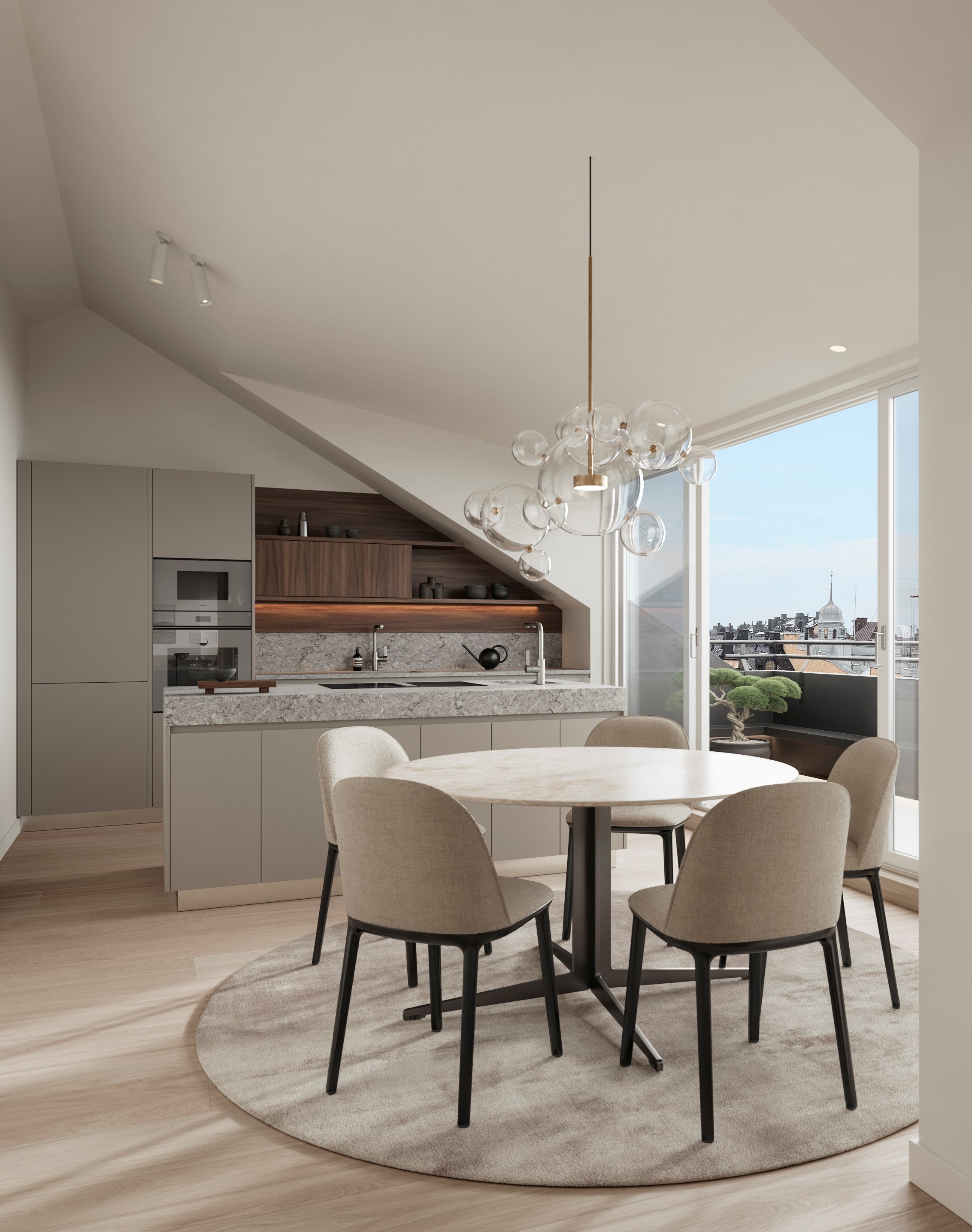 The apartment will feature waterborne underfloor heating for optimal indoor comfort, with additional electric underfloor heating in wet areas.