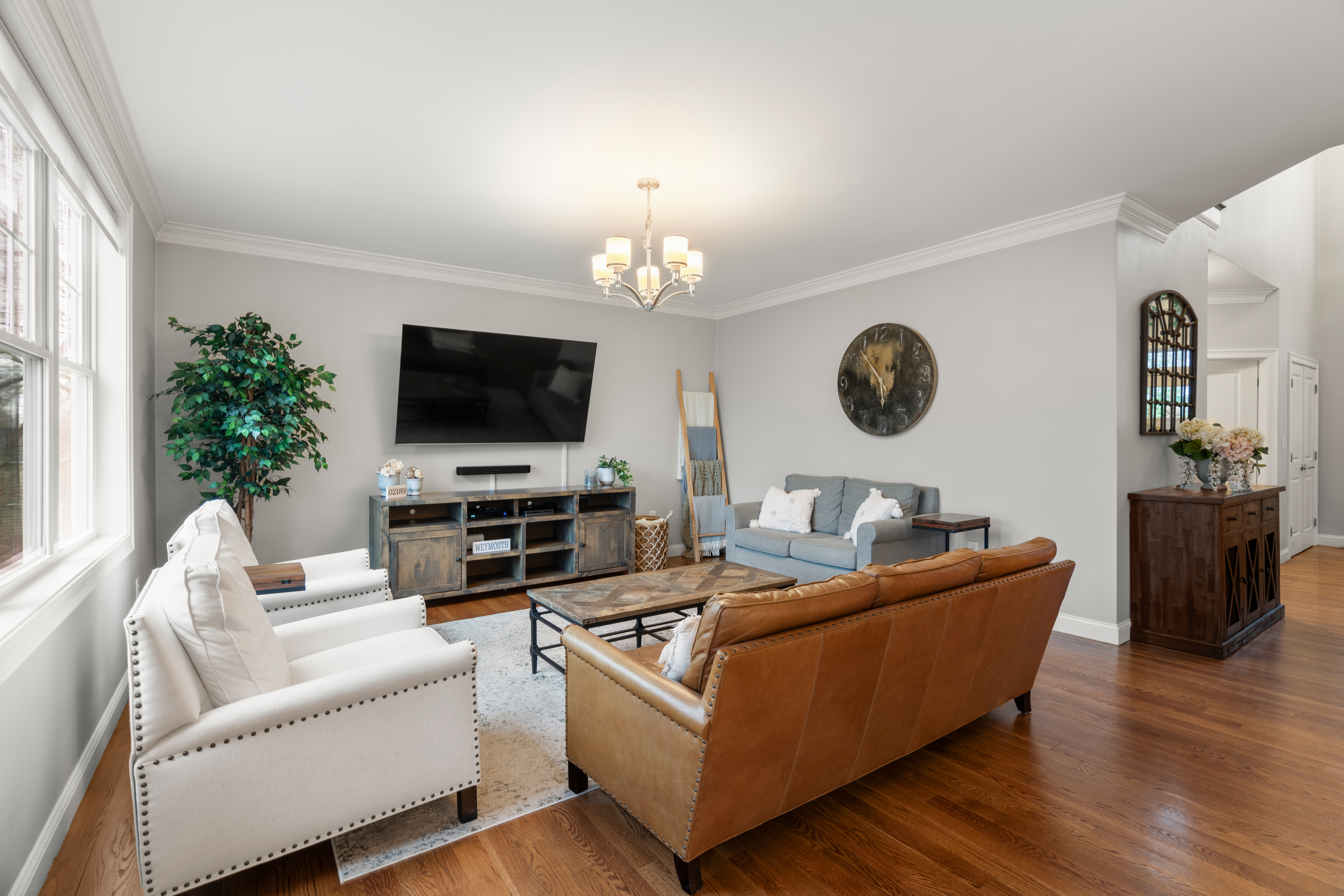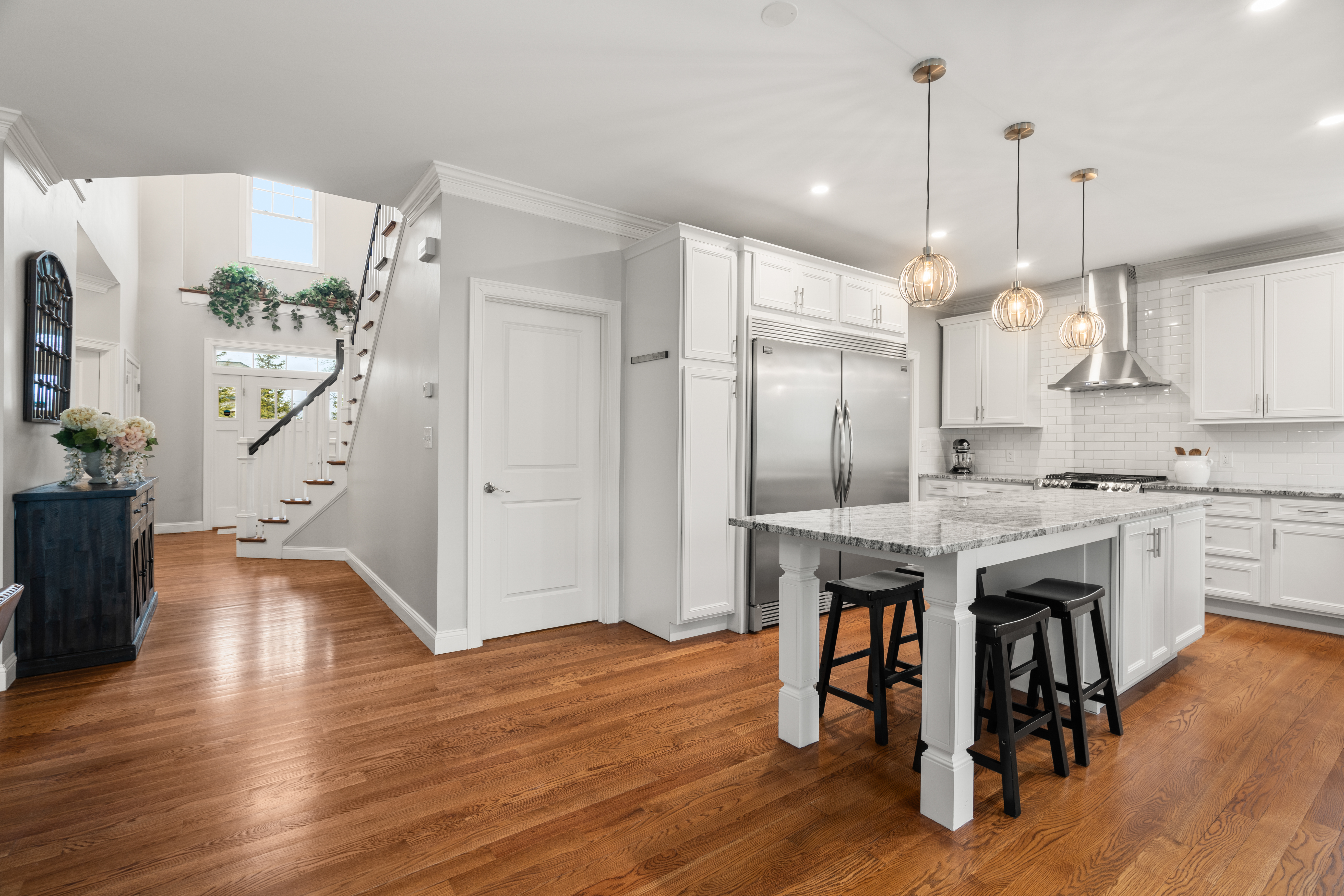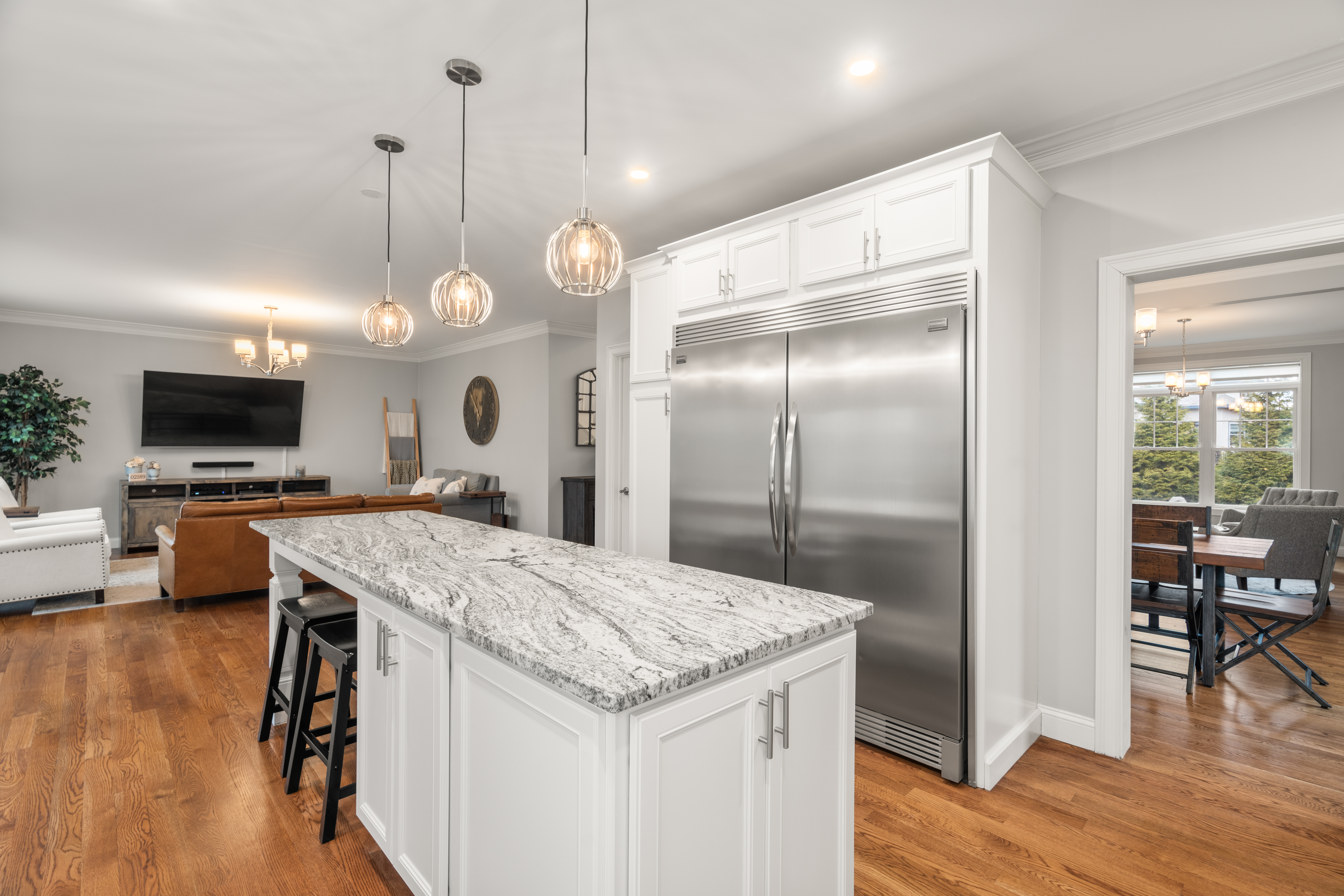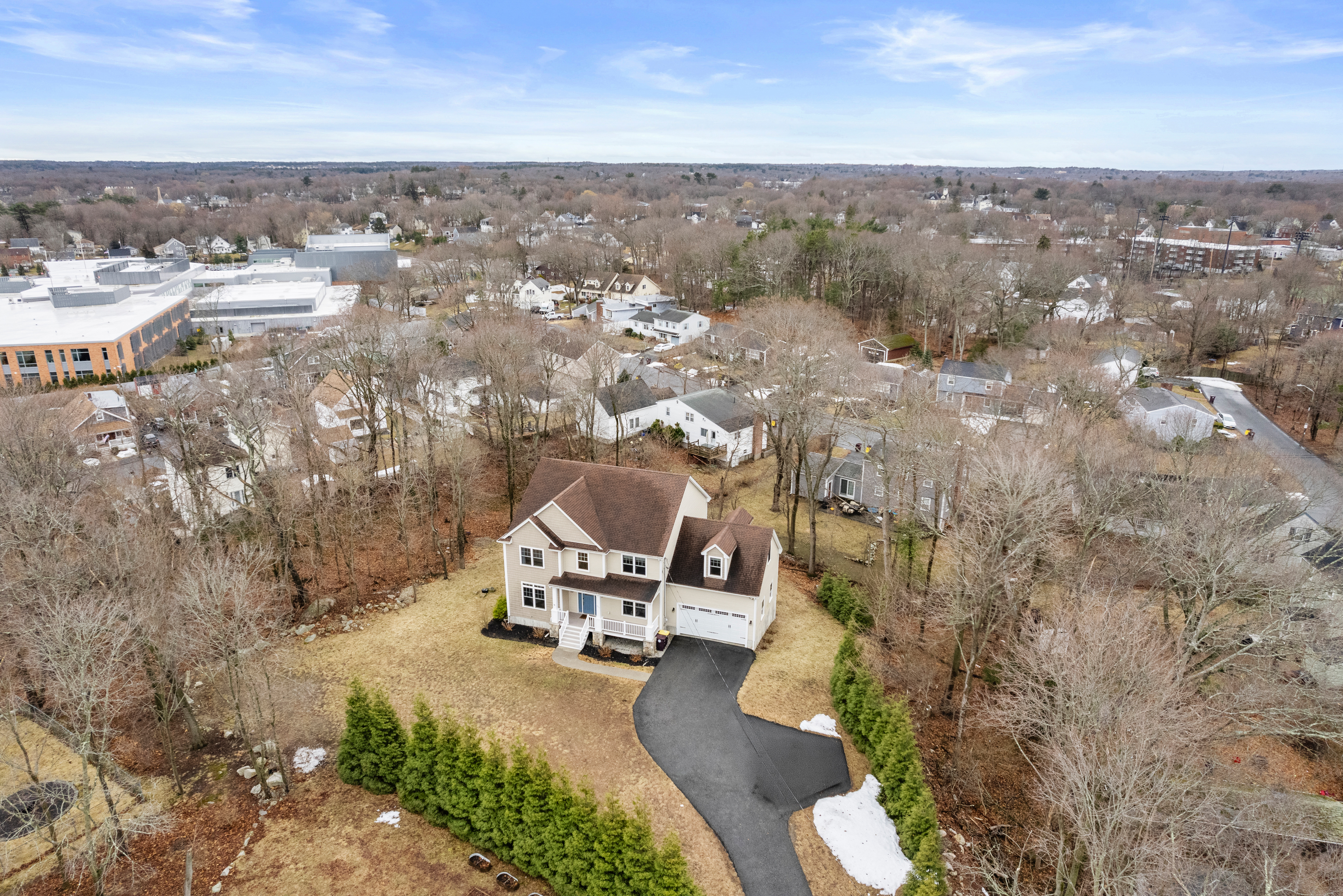 Set far back from busy Commercial Street on a private, nearly one acre lot, this stunning 2018 construction offers the rare combination of seclusion and convenience. Just minutes from Legion field and Jackson square, and a short drive to East Weymouth commuter rail, the location is stellar. The home is anchored by a grand staircase leading to four generous bedrooms plus a versatile bonus room currently used as a gym. The primary suite is a true sanctuary, with a walk-in closet and sun-drenched bathroom with soaking tub, walk-in shower, and double vanity. On the main level sits an expansive open-concept kitchen with large island flowing seamlessly into a light-filled living room. A formal dining room, separate den, dedicated office, powder room, and laundry room complete the first floor. The home features central air as well as hardwood floors and recessed lighting throughout, a large back deck overlooking the yard, garage, and unfinished walk out basement for expansion potential.