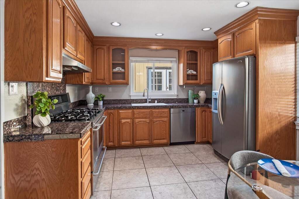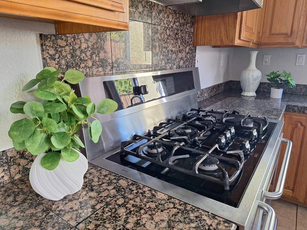 The spacious kitchen is a dream, boasting granite counters, stainless steel appliance, including an oversized Kenmore Elite 5-burner gas stove and oven and a Miele dishwasher less than a year old, and a breakfast nook with ample cabinetry.The updated bathroom features a granite counter vanity, and a shower-over-tub with tile surround. Open living and dining areas with backyard access. Prized upgrades include central air conditioning, large dual pane windows, hardwood floors, brand new hot water heater, fireplace in the living room, and ceiling fans in the bedrooms. Relax in the hot tub and enjoy the large backyard with mature landscaping. The finished shed with heating and cooling offers a wonderful, flexible-use space. Great house and yard for entertainment!One bedroom has been adapted into a deluxe closet and dressing room with built-in storage window seat, and an island-style dresser (not attached).Convenient location close to commute routes (including Lower Silver Creek Trail and VTA lightrail), shopping, and dining.Washer, dryer, and fridge included. Outside furniture may stay if desired.