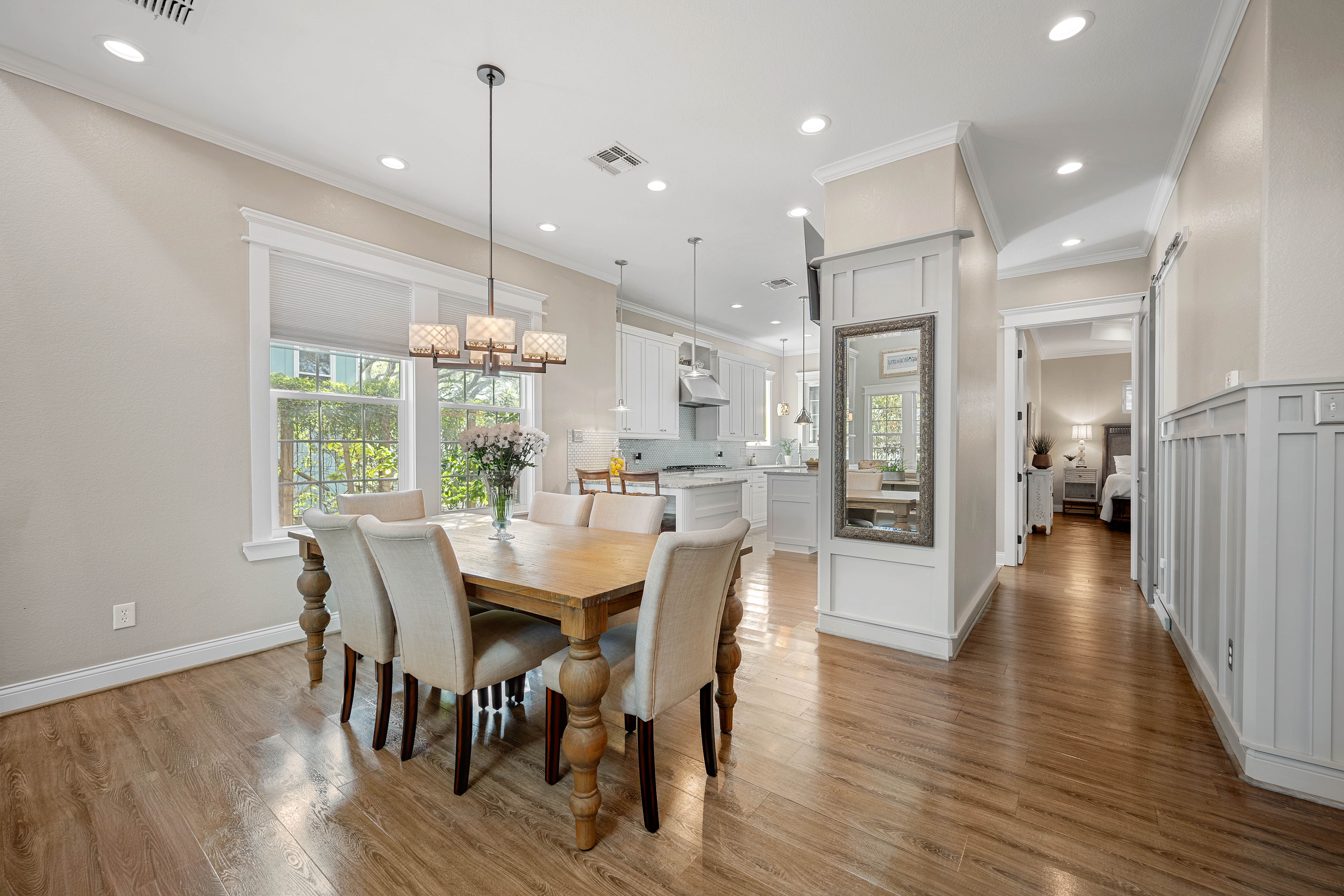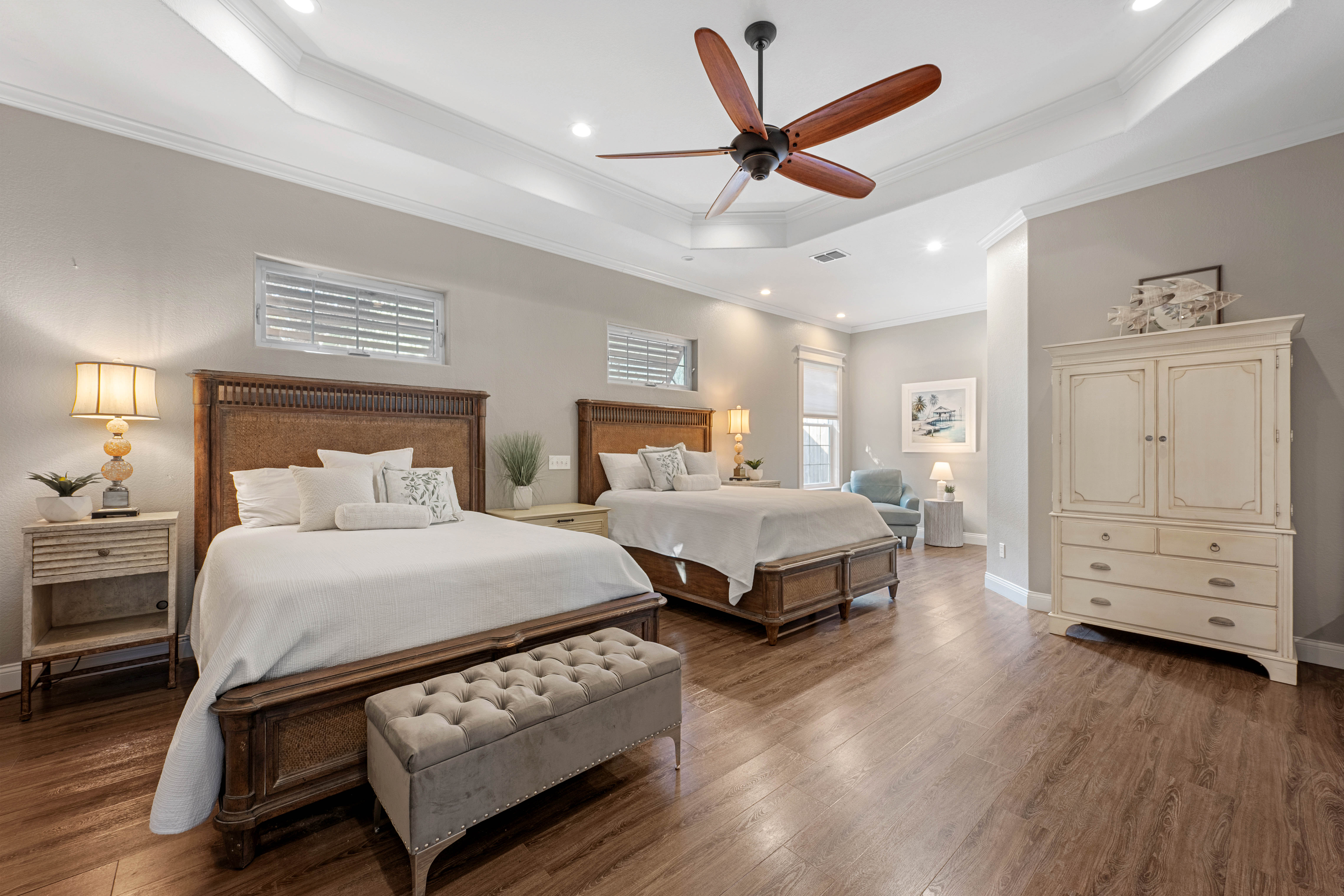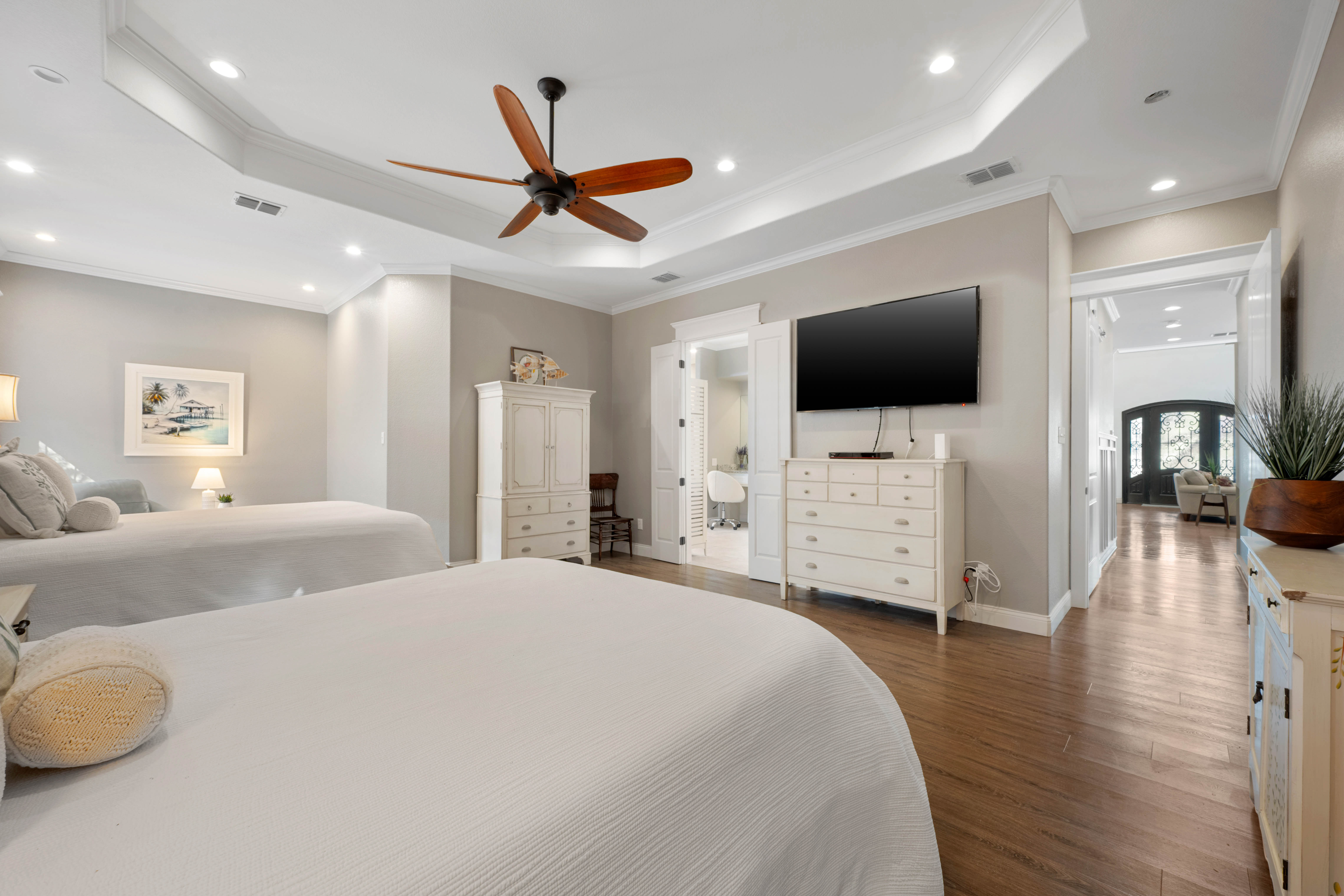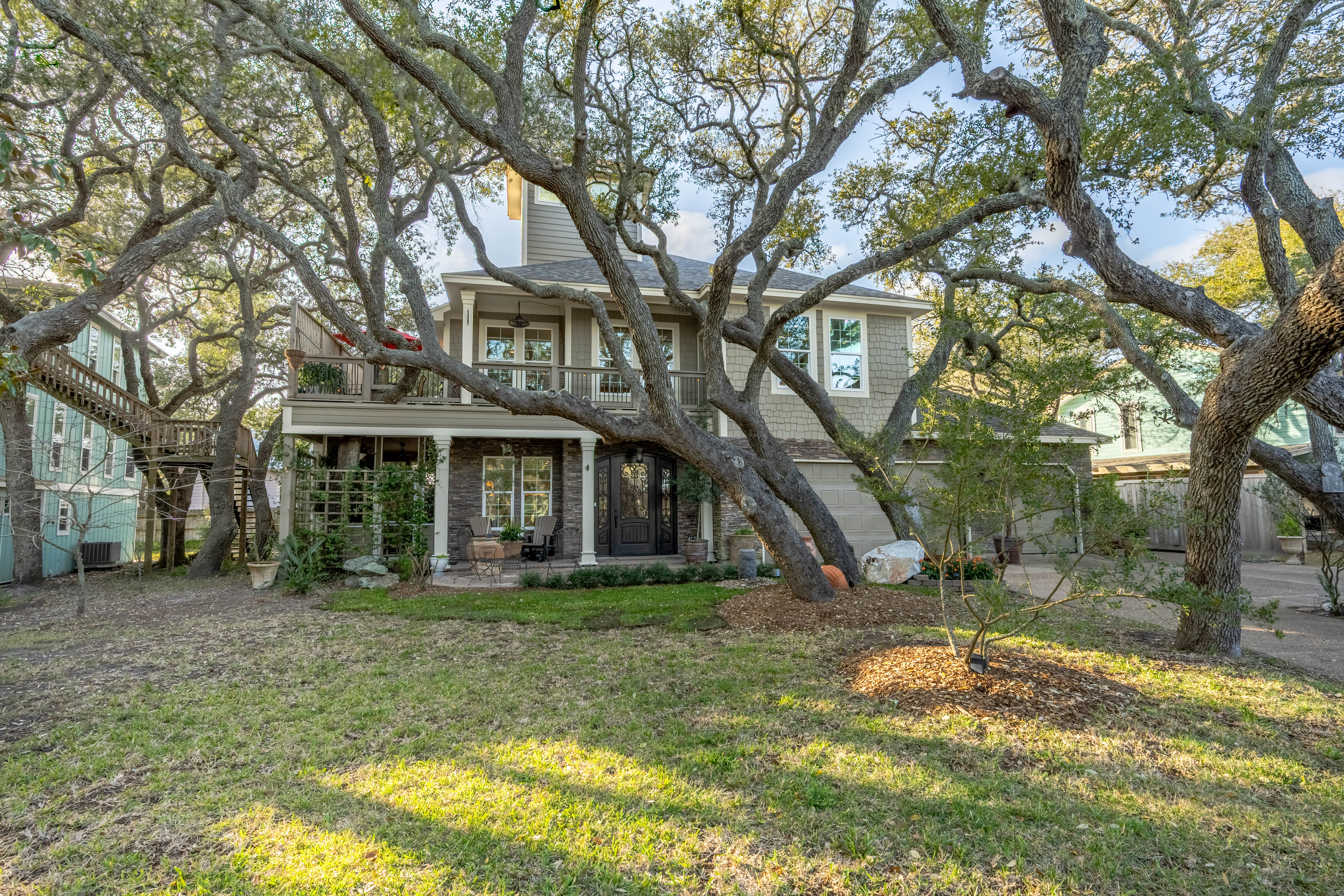 Tucked beneath a canopy of majestic coastal trees in the exclusive Bahamas private subdivision, this exceptional custom-built residence offers a rare opportunity to experience refined coastal living. Residents enjoy the privilege of private beach access and a 500-foot fishing pier, perfect for sunrise views or relaxing evenings watching spectacular coastal sunsets. Designed with both elegance and comfort in mind, the home features 3 bedrooms, 2 baths, and two spacious living areas, all enhanced by soaring ceilings and an abundance of windows that fill the home with natural light while showcasing the serene, tree-filled surroundings. The thoughtfully designed kitchen is appointed with high-end appliances, abundant cabinetry, and generous storage, creating an ideal space for both everyday living and entertaining. Throughout the home, you’ll find extensive cabinet space and storage areas, offering exceptional functionality without sacrificing style. Both living levels are designed for entertaining, each featuring its own wet bar. The upstairs living area opens onto a covered porch overlooking the towering trees, providing a peaceful retreat for unwinding or hosting guests while enjoying the coastal breeze. The two screened porches downstairs offer yet another inviting space to relax and take in the tranquil setting. Additional highlights include a workshop and an extra-wide two-car garage, providing ample room for hobbies, tools, and storage. Combining privacy, natural beauty, and exclusive coastal amenities, this remarkable property captures the essence of luxury coastal living along the Texas coast.