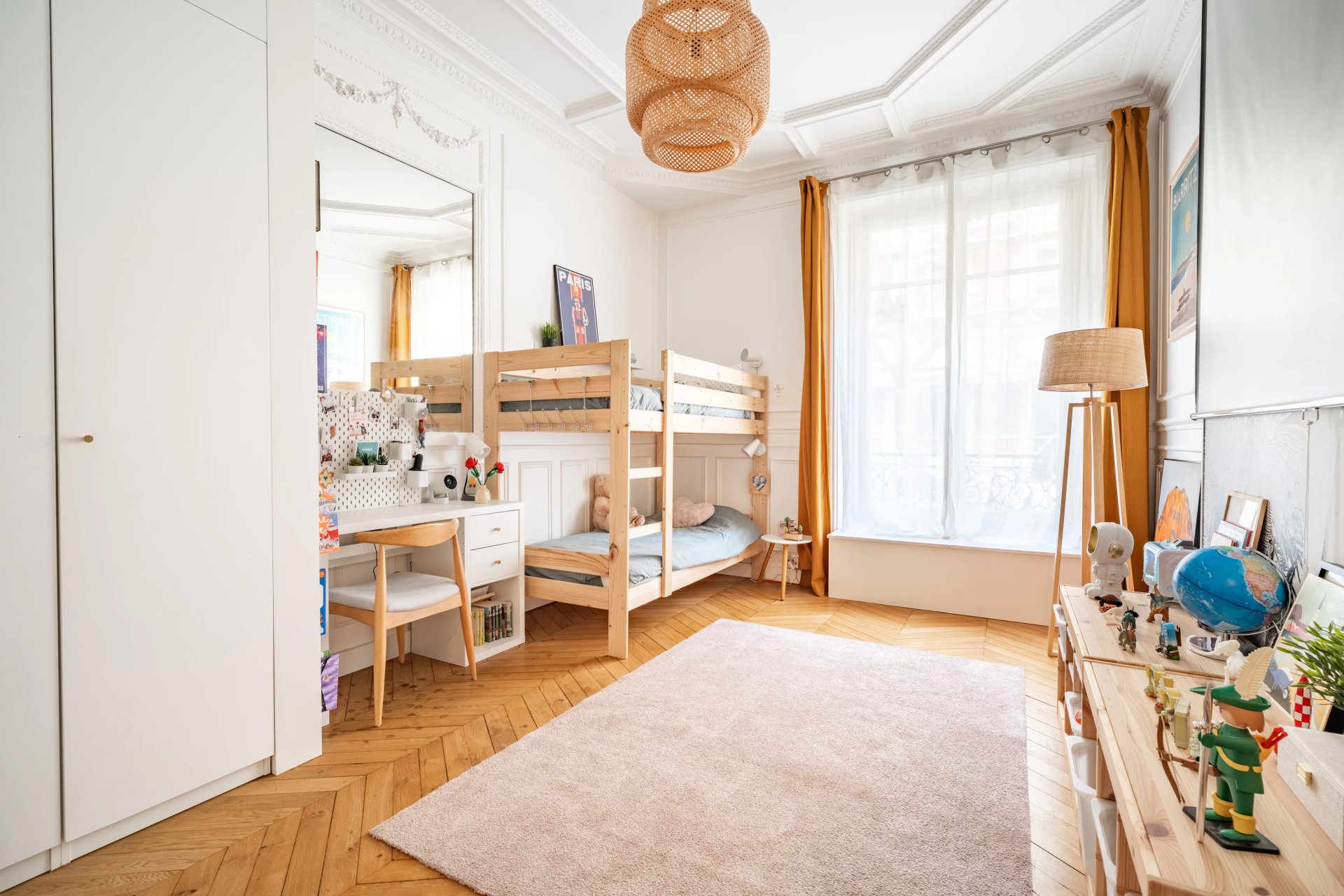 Charme de l'ancien avec parquet, moulures et hauteur sous plafond.