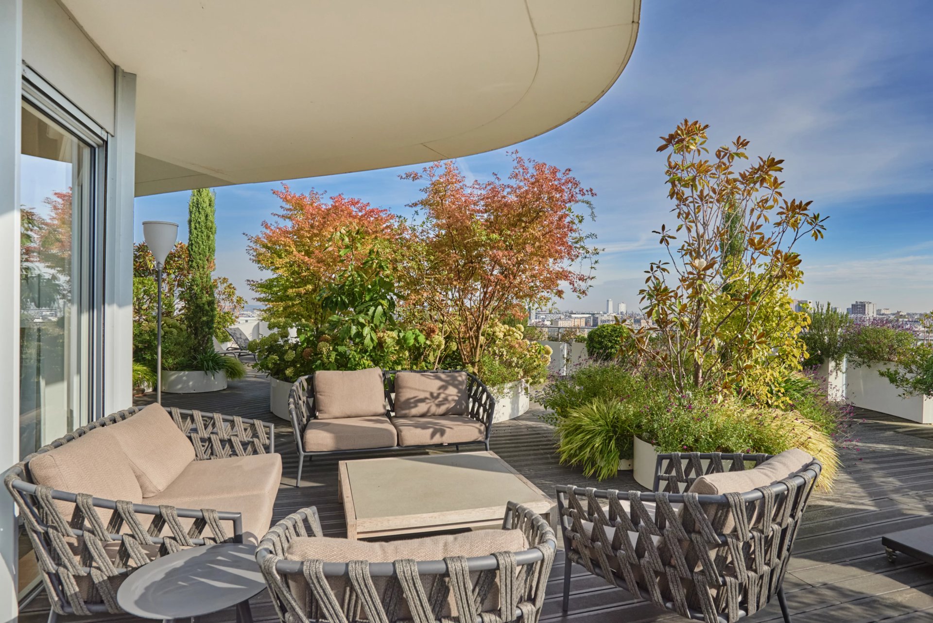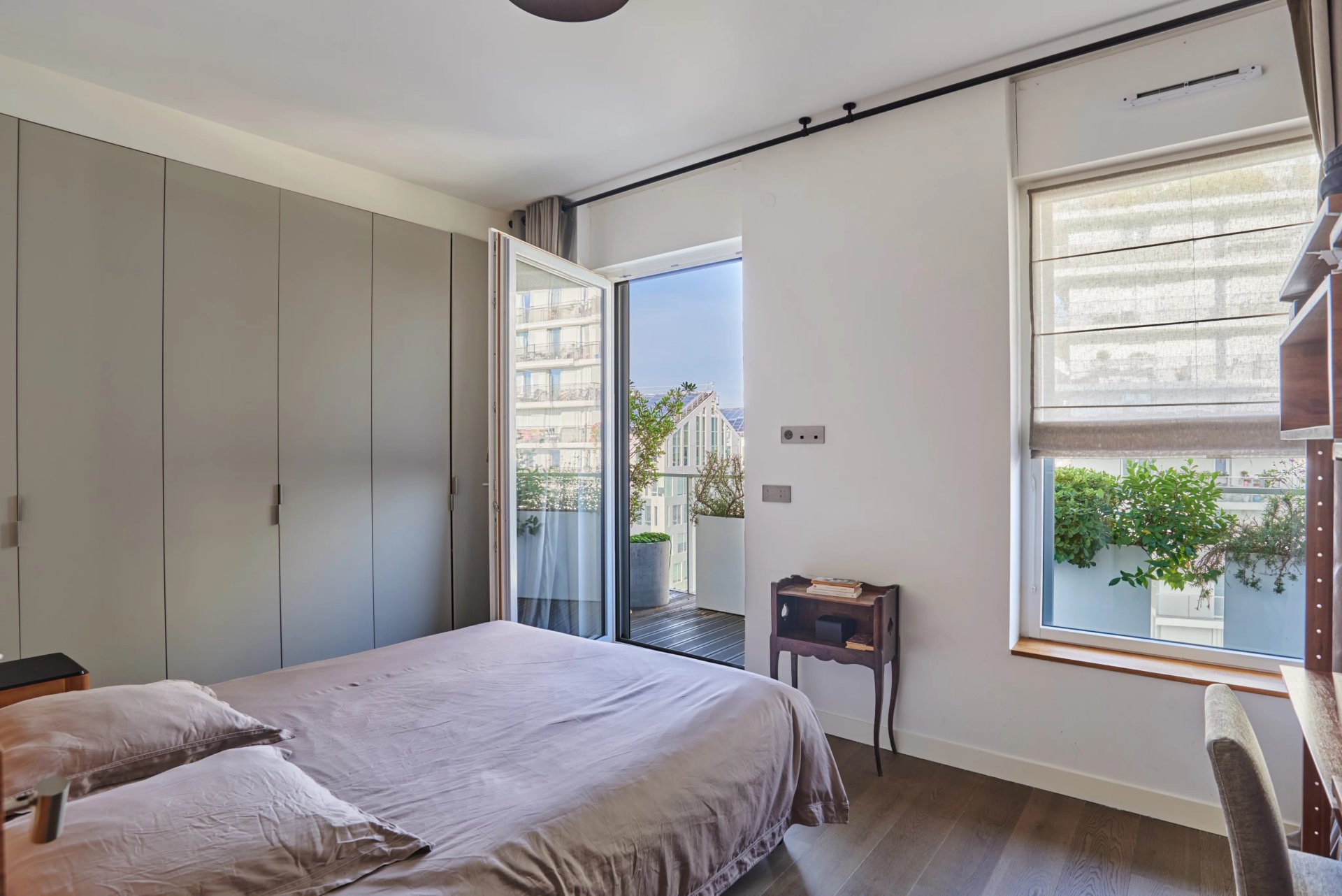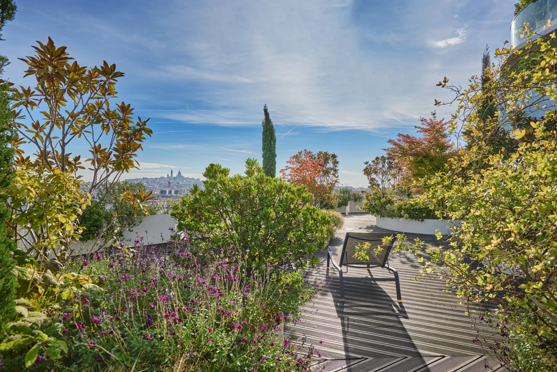 This superb apartment benefiting from a stunning near 250 sqm terrace commanding an open view of Sacré Coeur Basilica is on the 9th floor of a recent building with a lift located just next to Martin Luther King Park. Beautifully appointed and in perfect condition, it includes a double living/reception room opening onto the leafy terrace, a semi open-plan kitchen, a master suite with a bathroom, a study, a dressing room and a separate wc, two further bedrooms each with a shower room, a utility room and a separate wc.