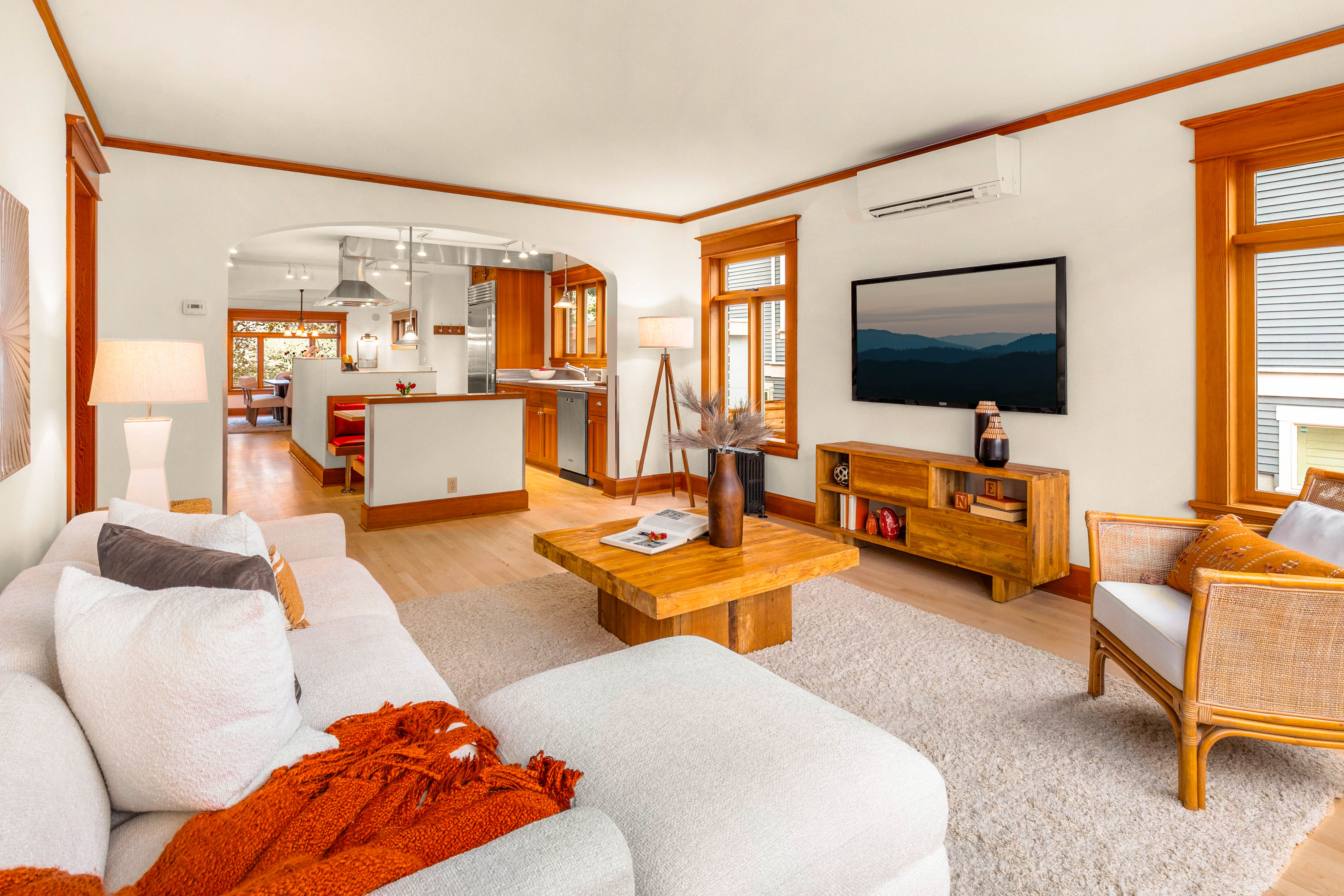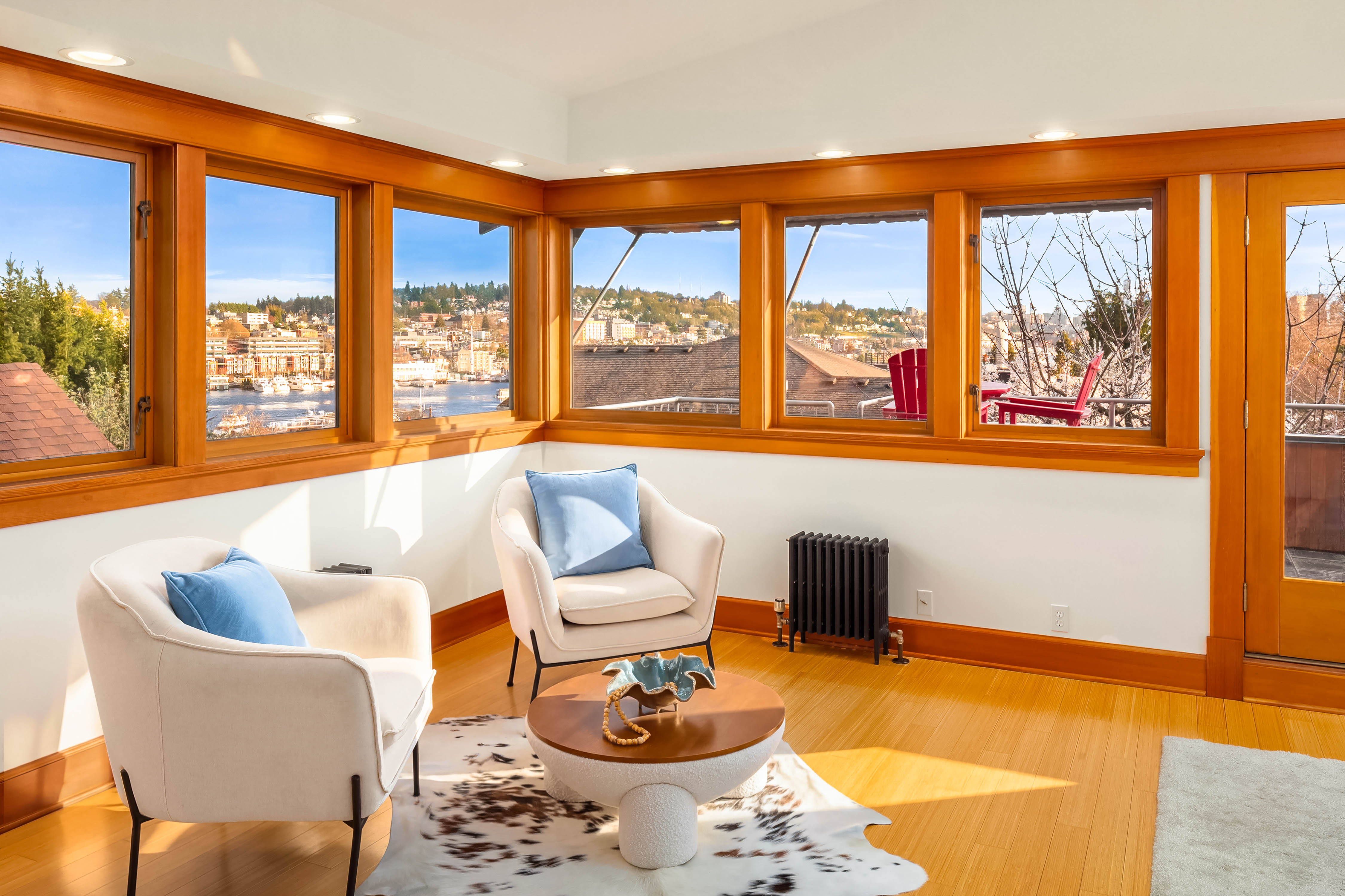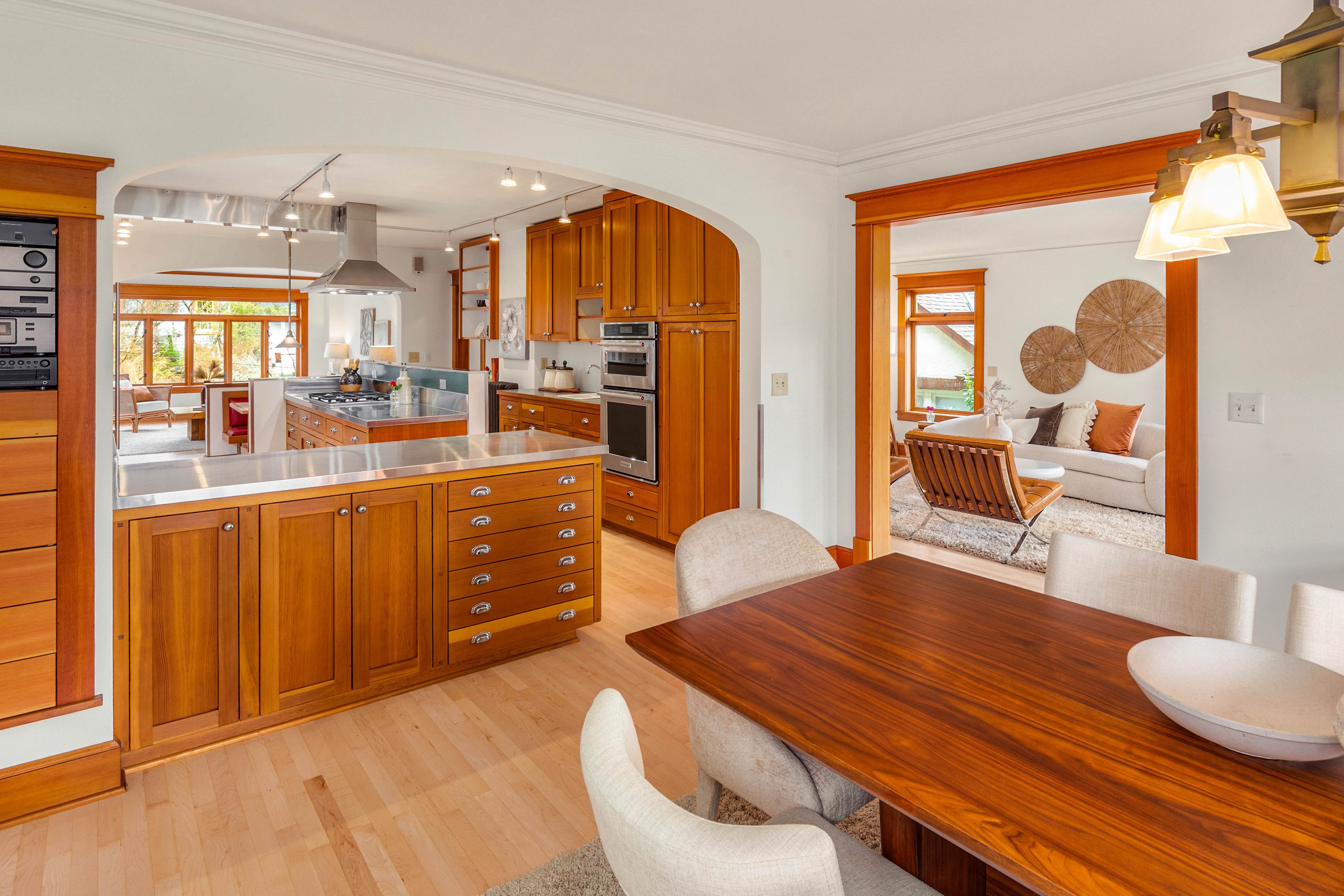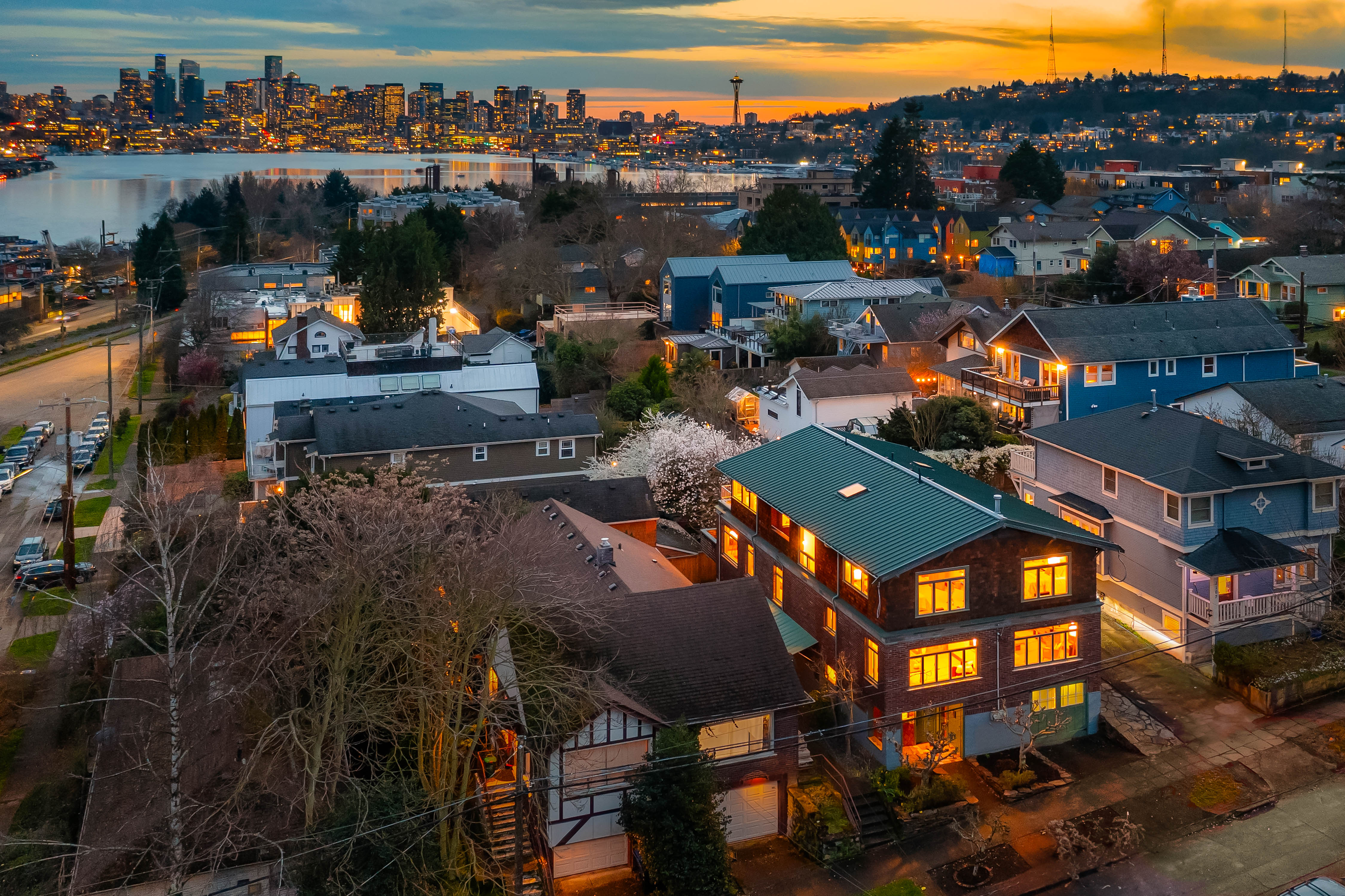 Offered for the first time in 40 years, this remarkable home in the heart of Wallingford blends historic character with striking architectural design. Originally built in 1927 and thoughtfully transformed into a stunning single-family residence with extensive upgrades throughout, the home is beautifully positioned to capture panoramic views of Lake Union and the Seattle skyline. Exceptional craftsmanship and custom design define the interior. Vertical grain fir trim, maple and bamboo floors, and abundant wood windows fill the home with warmth and natural light, while a sculptural steel and maple staircase serves as an architectural centerpiece. Designed for everyday living and entertaining, the chef’s kitchen features Sub-Zero refrigeration, double wall ovens, stainless steel countertops, custom fir cabinetry, and an inviting built-in banquette. A hidden passive wine cellar stores up to 750 bottles, while a daylight MIL suite with a separate entrance offers flexibility for guests, extended living, or potential rental income. The upper level enjoys sweeping lake and skyline views and hosts a serene primary suite with a custom-designed bath and two private outdoor spaces—a hot-tub-ready deck and a sunny south-facing terrace with 180-degree views, perfect for gardening. Ideally located just blocks from Wallingford’s restaurants, parks, the Burke-Gilman Trail, and Lake Union—a rare opportunity to own one of Wallingford’s most distinctive and thoughtfully crafted homes.