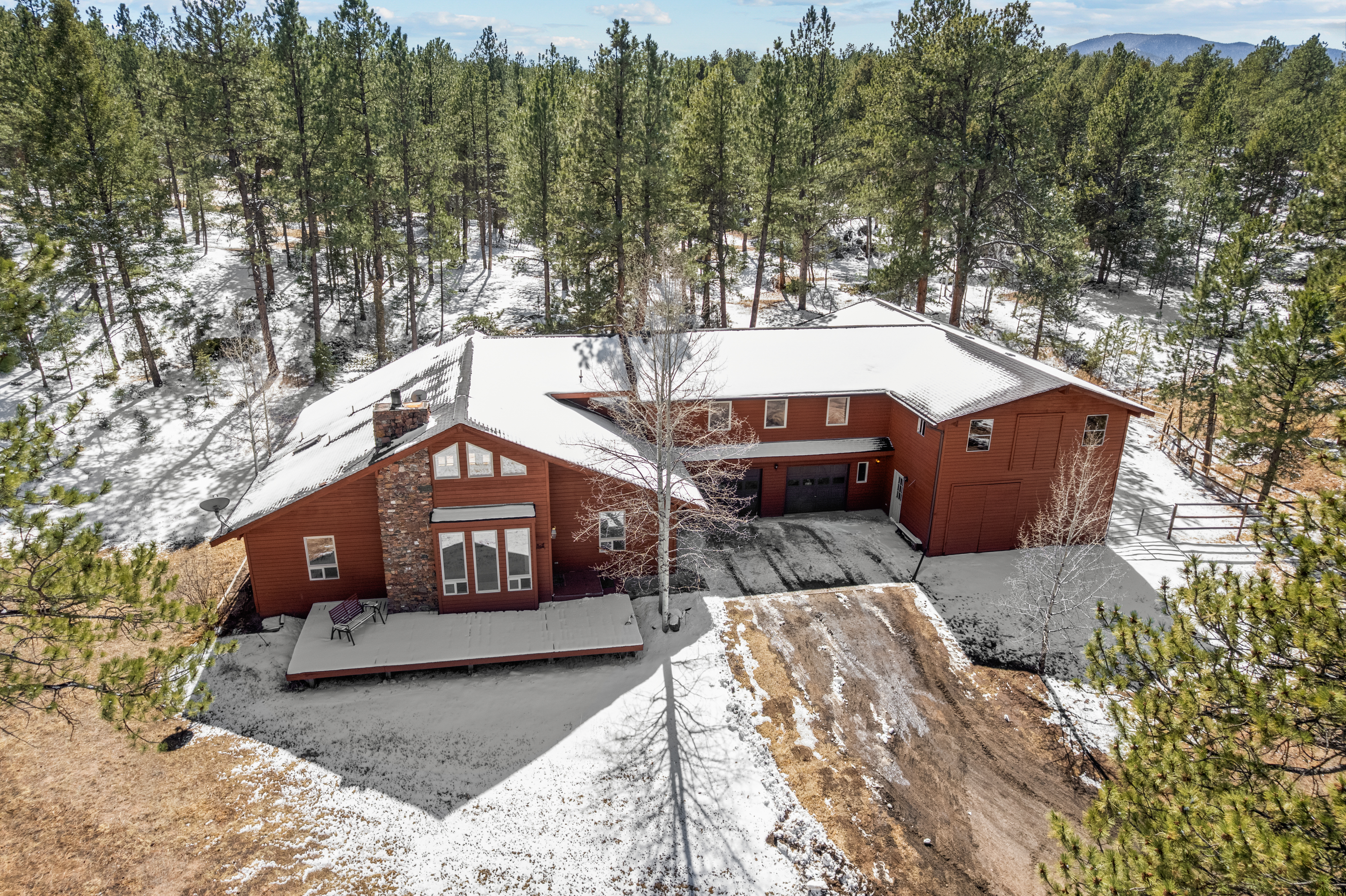 Welcome to your Rocky Mountain sanctuary—where breathtaking views, peaceful surroundings, & refined mountain living come together in perfect harmony. Set on 10 pristine acres in Spring Creek Ranch, this exceptional 5-bed, 3-bath mountain contemporary home offers 2,780 sq ft of thoughtfully designed living space. Step inside to a dramatic 2-story living room featuring soaring cathedral windows, exposed wood beams, & a striking wall of wood shelving. The inviting dining area is perfect for entertaining, while the cozy eat-in kitchen provides ample counter space & storage for everyday living. The main-floor primary suite is a true retreat, complete with a nice 4-piece bath. Two additional bedrooms, a full bath, & a convenient laundry space complete the main level. Upstairs, a versatile loft offers the ideal space for a home office, study, or media area, enhanced by custom built-ins. Two additional bedrooms & a third bath are situated above the oversized attached garage, offering privacy & flexibility for guests or family. Designed with both comfort & functionality in mind, the home features a direct connection to the barn—allowing easy access without exposure to the elements. The impressive 24’ x 48’ two-story barn includes 3 stalls, a tack room, a 1,200 sq ft loft, & opens to a corral and level pasture—perfect for horses, equipment storage, or creative pursuits. A 12-foot-wide drive-through lane accommodates tractors, trailers, or RVs with ease. Residents of Spring Creek Ranch enjoy exclusive access to a stocked community pond for fishing, canoeing, & paddleboarding, as well as a charming outdoor pavilion for picnics. Ideally located near Buffalo Creek & adjoining Pike-San Isabel National Forest, with direct access to the Colorado Trail, this property also sits just minutes from the North Fork of the South Platte River—renowned for its gold medal trout fishing.This is Colorado mountain living at its finest—private, picturesque, and full of possibility.
