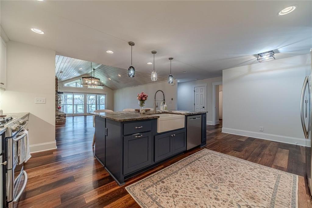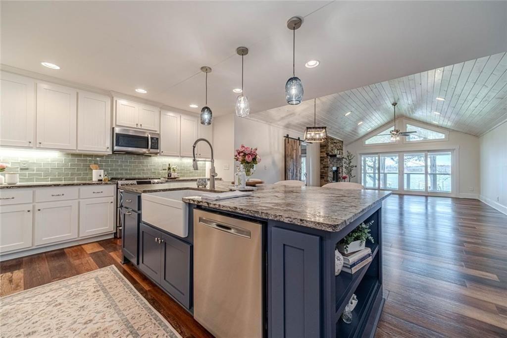 Lake Lanier waterfront living with stunning sunset views of scenic Lathem Bay. Enjoy lakefront living with grass-to-water access and beautiful lake views from nearly every room in this stunning Lake Lanier retreat. Located in a quiet, well-maintained neighborhood where lawn care is included, this home offers a low-maintenance lifestyle with direct access to the lake and breathtaking sunset views that make every evening unforgettable. From the moment you arrive, you'll be captivated by the sweeping water views and the gentle grassy walk straight to the lake, a rare and highly desirable grass-to-water lot on Lake Lanier. Enjoy easy access to the single-slip covered dock with two jet ski ports, making days on the water effortless and fun. One of the most incredible features of this home is the massive screened back porch overlooking the lake, complete with a cozy fireplace and custom porch daybed swing. This space is perfect for entertaining guests or simply enjoying peaceful moments with family. Whether you're hosting friends, playing games, sharing meals, or relaxing with a glass of wine while watching Lanier's unforgettable sunsets, this porch is designed for making memories. The bed swing is the perfect place for an afternoon nap or curling up with your favorite book while enjoying the peaceful lake breeze. Inside, the home has been beautifully renovated and modernized with a bright, open floor plan designed for comfortable lake living. The home features three bedrooms and three baths, including two owners' suites, both with direct access to the incredible screened porch. The spacious kitchen is the heart of the home and features an enormous island with leathered granite countertops, abundant cabinetry, and plenty of storage, making it perfect for gathering with friends and family after a day on the lake. Tongue and groove ceilings, durable luxury vinyl plank flooring, and a striking double-sided fireplace add warmth and character throughout the living spaces. Additional features include a tankless water heater and an oversized two-car garage with large storage closets. Beyond the home itself, the neighborhood offers an incredible lifestyle and is a wonderful place for evening walks with friends and neighbors. Residents enjoy resort style amenities including a swimming pool, tennis courts, pickleball court, a basketball court, pavilion, and private boat ramp. The HOA also provides lawn care, trash service, and septic maintenance, making lake living easy and convenient. Whether you're looking for the perfect weekend retreat or a full-time residence, this home delivers comfort, style, and access to the incredible Lake Lanier lifestyle. Homes with grass-to-water access, breathtaking sunset views, and outdoor living spaces like this rarely come available on Lake Lanier. Come experience the beauty, relaxation, and lifestyle this special waterfront home offers.