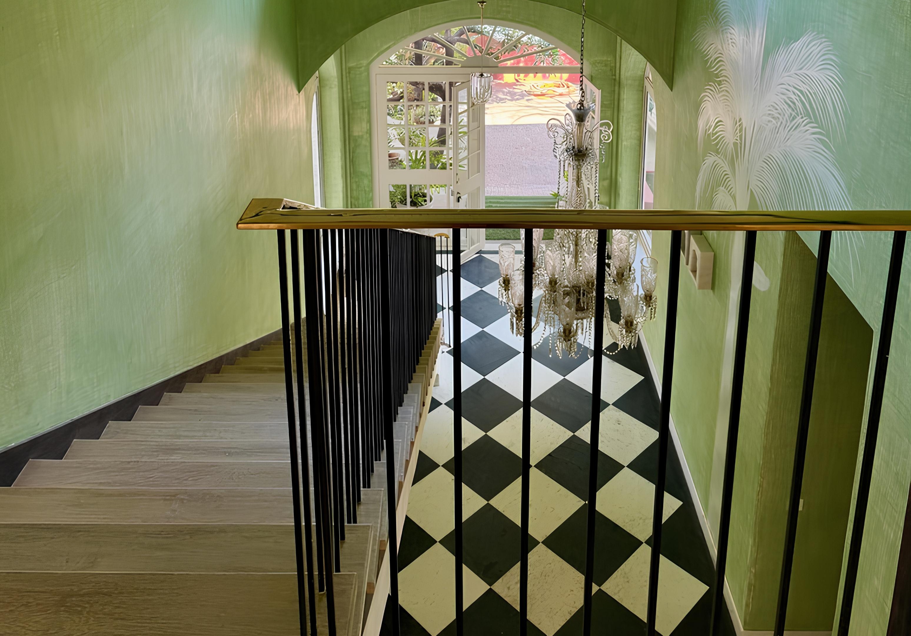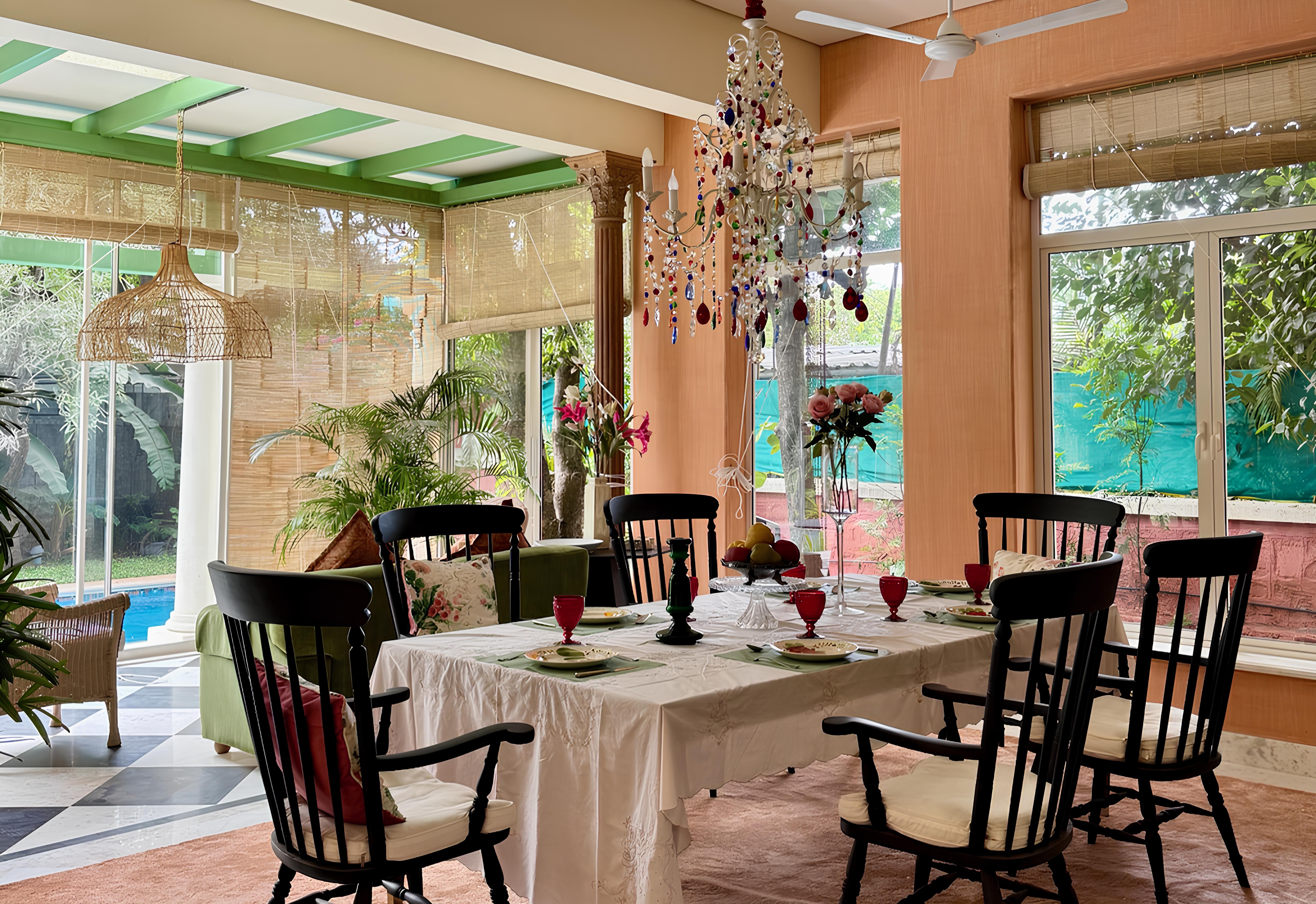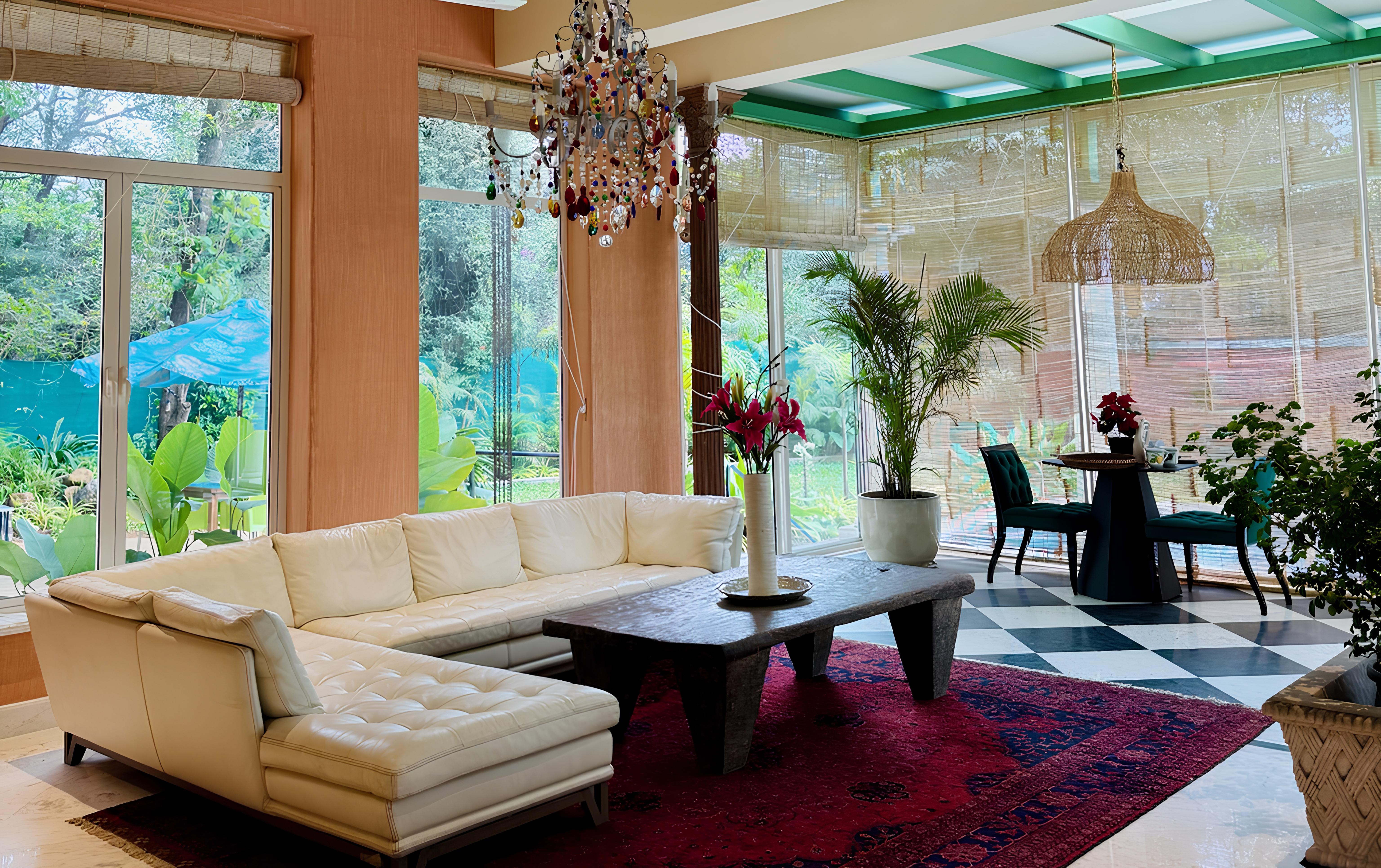 The interiors are defined by a distinctive design language, with wallpaper murals, custom multicoloured chandeliers featuring crystals sourced from the Czech Republic, French doors, latticed arches and black-and-white checkered marble flooring sourced from the quarries of Udaipur. The furniture throughout the home is bespoke, with a statement Roche Bobois sofa anchoring the main living area.