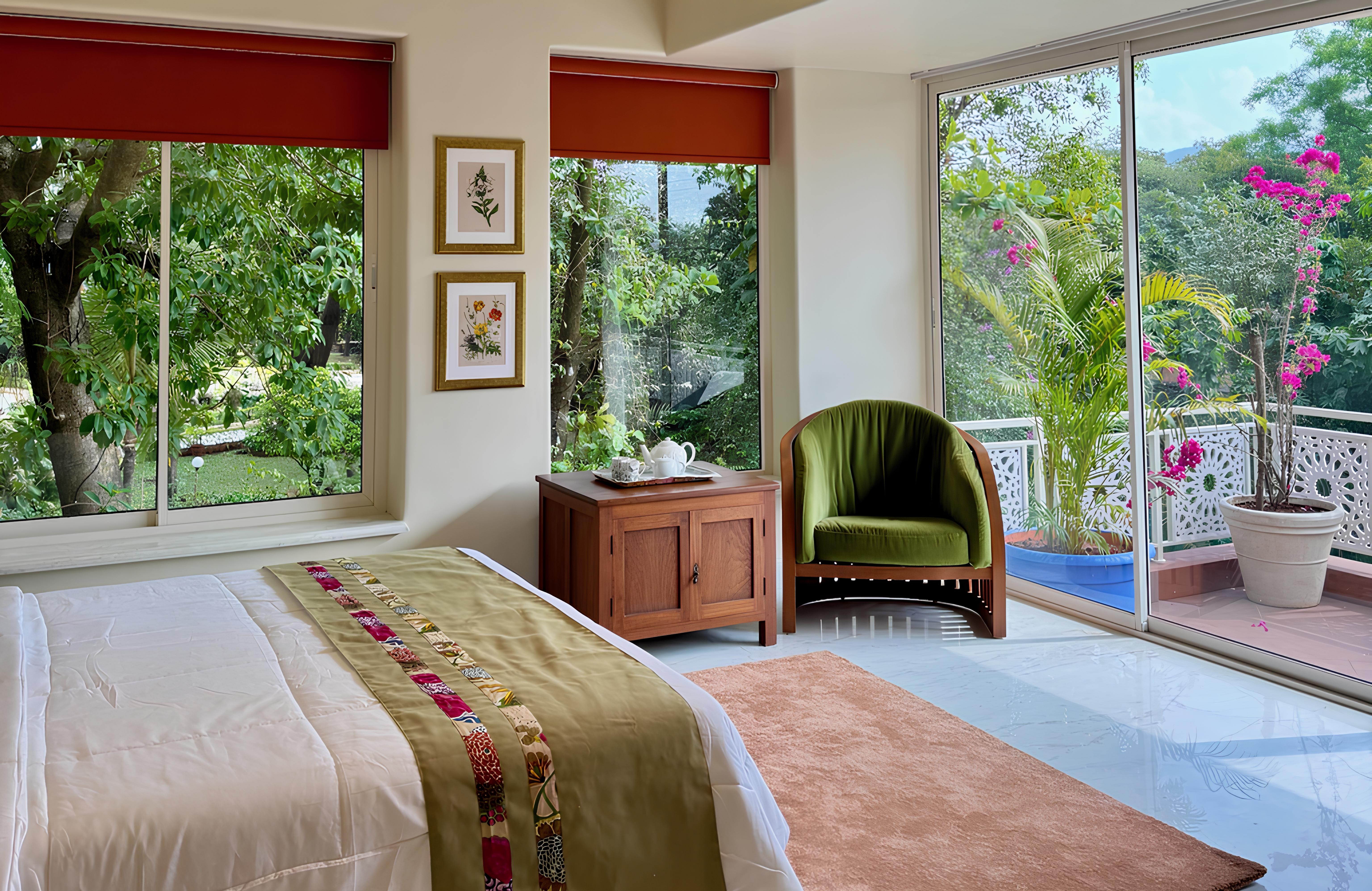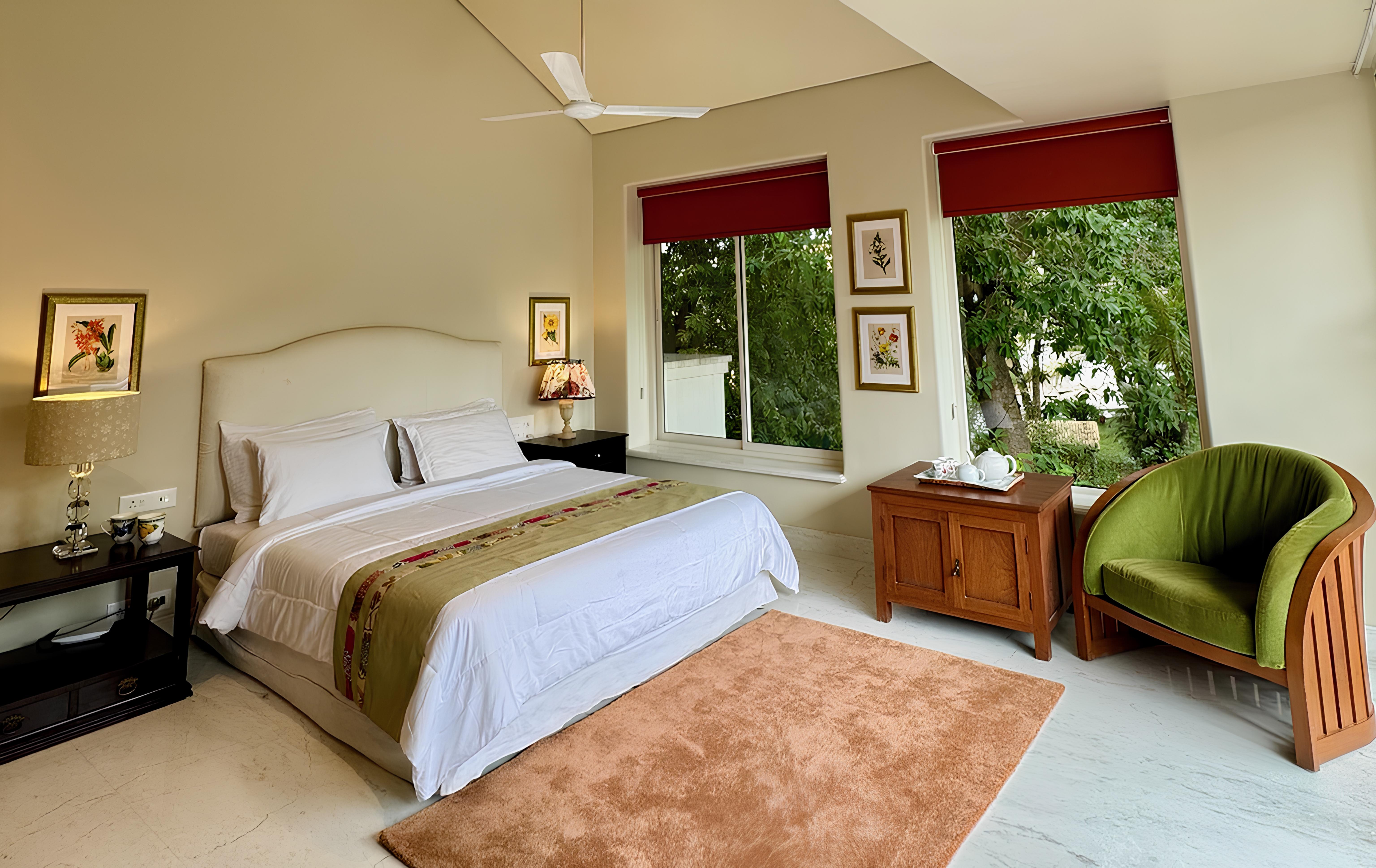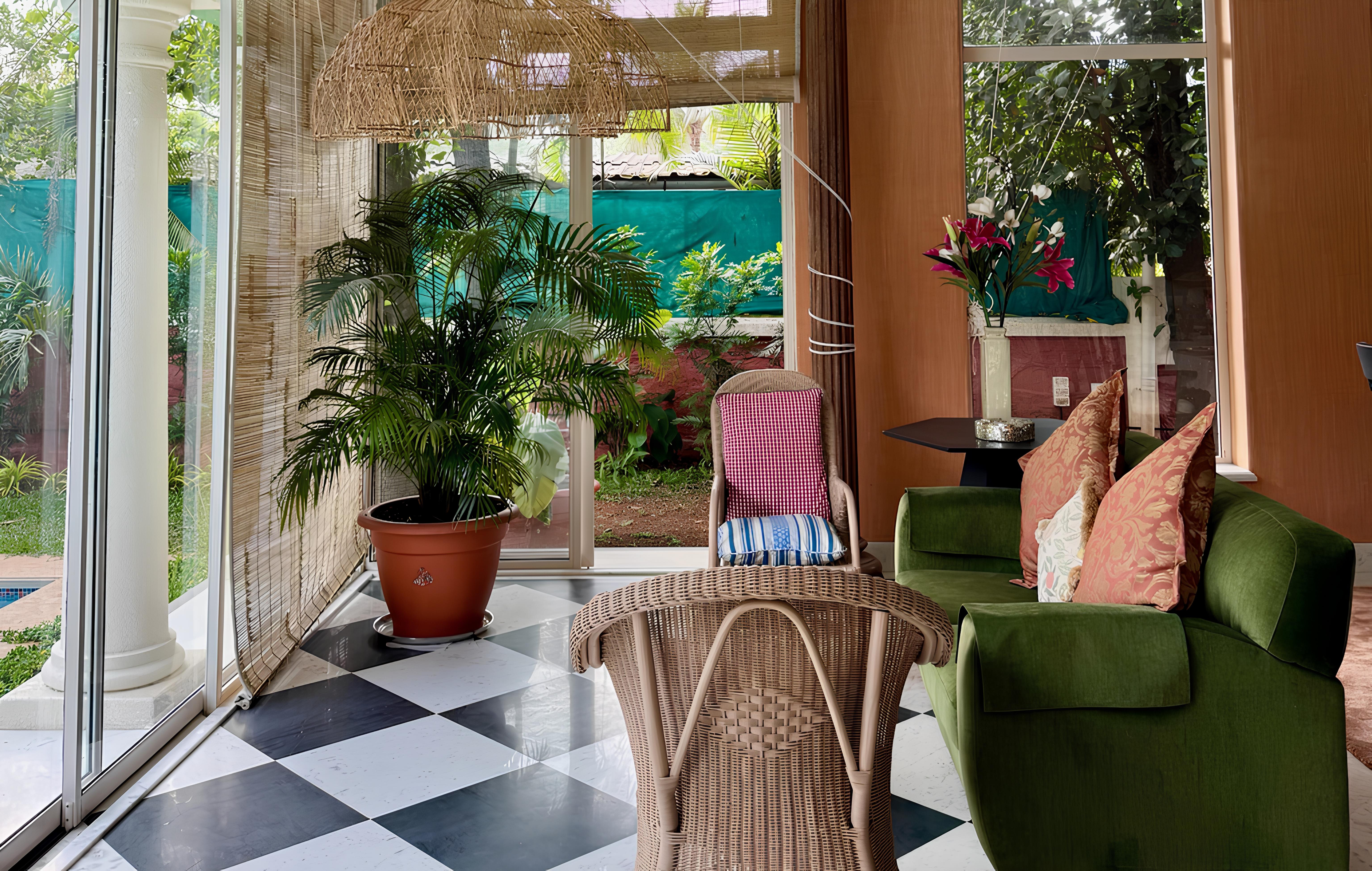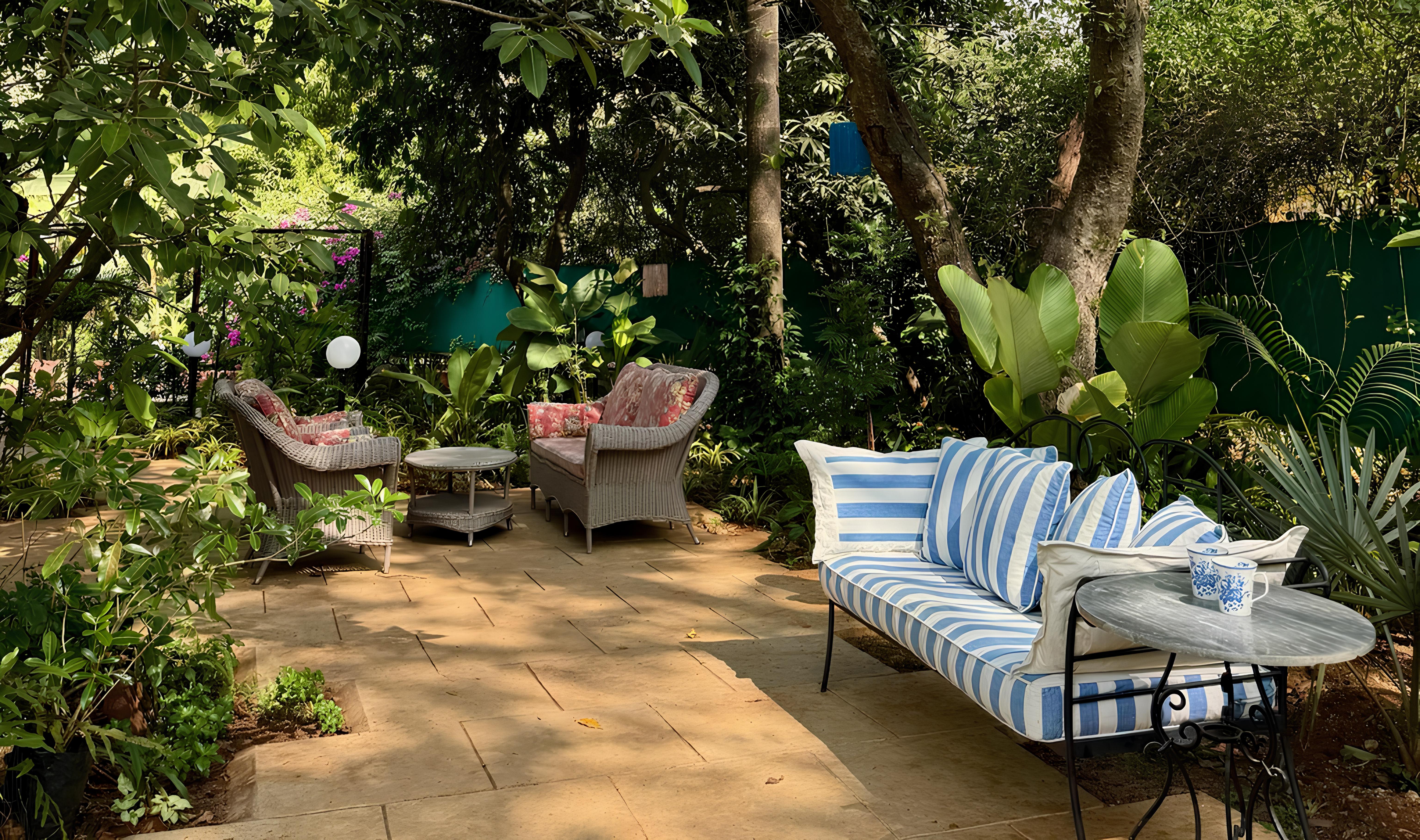 Surrounded by greenery, the villa is anchored by a 100-year-old rubber tree, while the landscaped grounds include fruit-bearing trees such as chikoo, jamun, amla and jackfruit, along with flowering plants and intimate outdoor seating areas suited to alfresco dining and relaxed evenings. A large well at the entrance supports irrigation for the garden, adding to the property’s practical self-sufficiency.