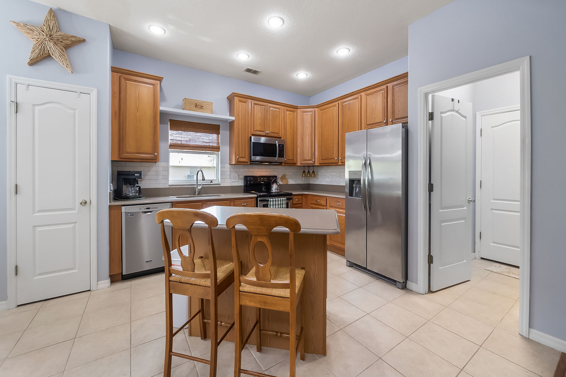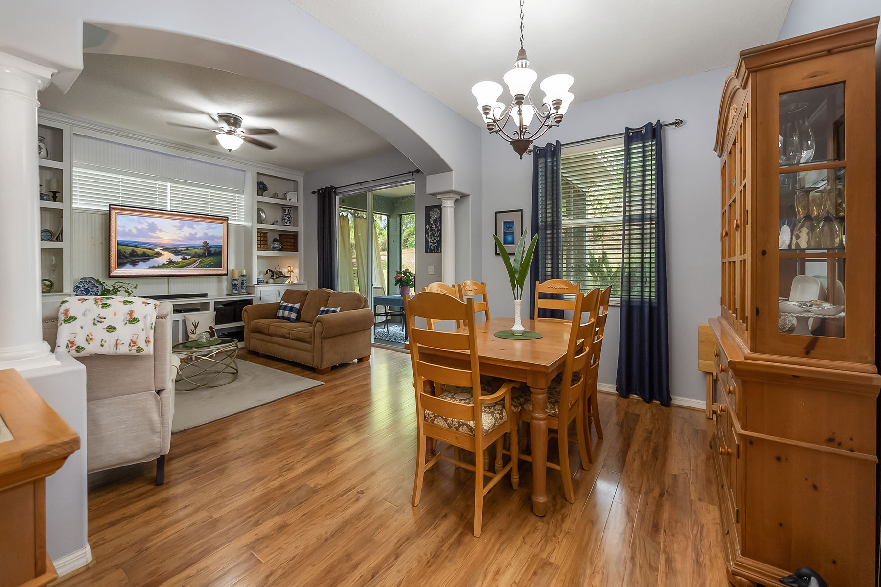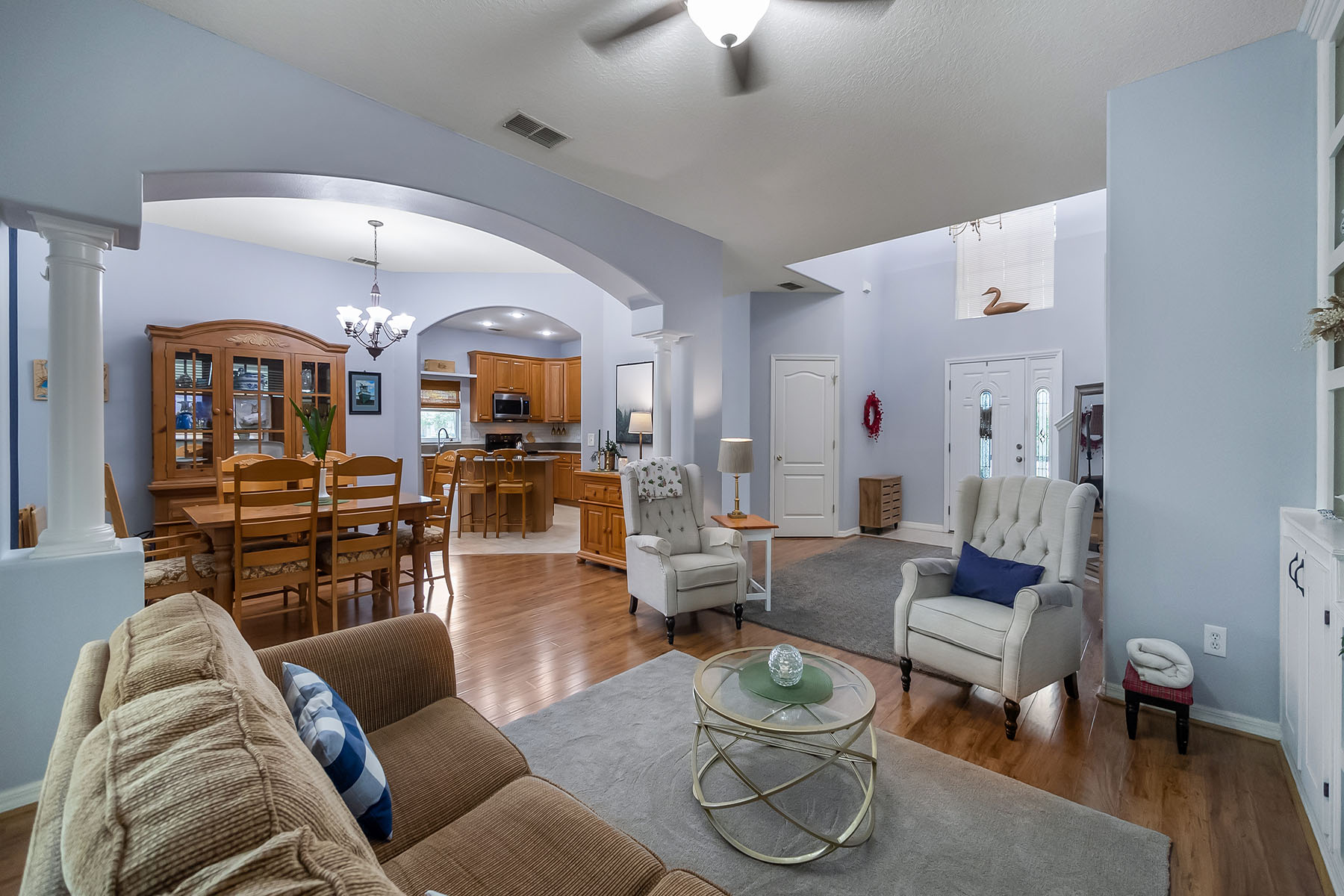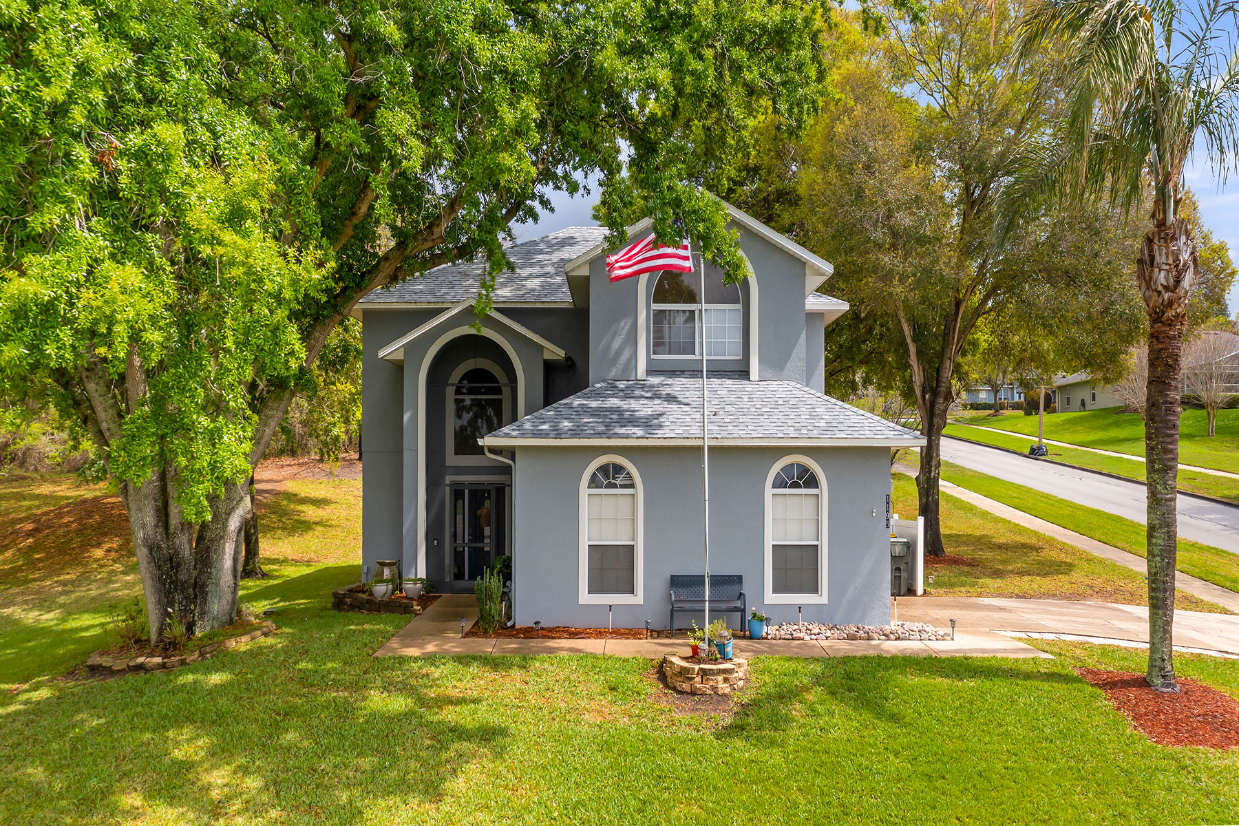 Welcome to this beautifully maintained, one-owner home on a generous 0.37-acre corner lot, shaded by mature trees that create a peaceful and inviting setting. From the moment you arrive, the pride of ownership is clear in the immaculate condition and thoughtful layout that offers comfort and functionality. Inside, you will find spacious living areas designed for everyday living and entertaining. The large living room provides plenty of space to gather and features a substantial built-in entertainment area that offers excellent storage and display space while still leaving plenty of room for your large screen television. The formal dining room is ideal for hosting dinners and special occasions. The kitchen offers a breakfast bar for casual seating along with a bright eat-in area that overlooks the backyard, creating a warm and welcoming space for morning coffee or family meals. The oversized primary suite is a retreat, featuring a generous walk-in closet and a spacious en-suite bath with dual sinks, a relaxing soaking tub and a separate shower. The secondary bedrooms are also large and comfortable, including one with its own walk-in closet. An additional full bath upstairs adds convenience for family members or guests. Go outside to enjoy the screened lanai, an ideal spot to relax and take in the peaceful surroundings of the backyard. The side entry garage adds convenience and curb appeal, while the corner lot provides extra space and privacy. Location is another standout feature of this home. Although it feels tucked away and private, it is within three blocks of multiple shopping centers, including Publix, Home Depot, HomeGoods, restaurants, banks and everyday services. The home is also in the rapidly growing Clermont area, surrounded by new stores and dining options while offering easy access to major roads, including Highway 50 and Highway 27 within a two-minute drive. Be sure to watch the drone and interior video to fully appreciate the setting and layout, then schedule your showing and experience this immaculate home in person.