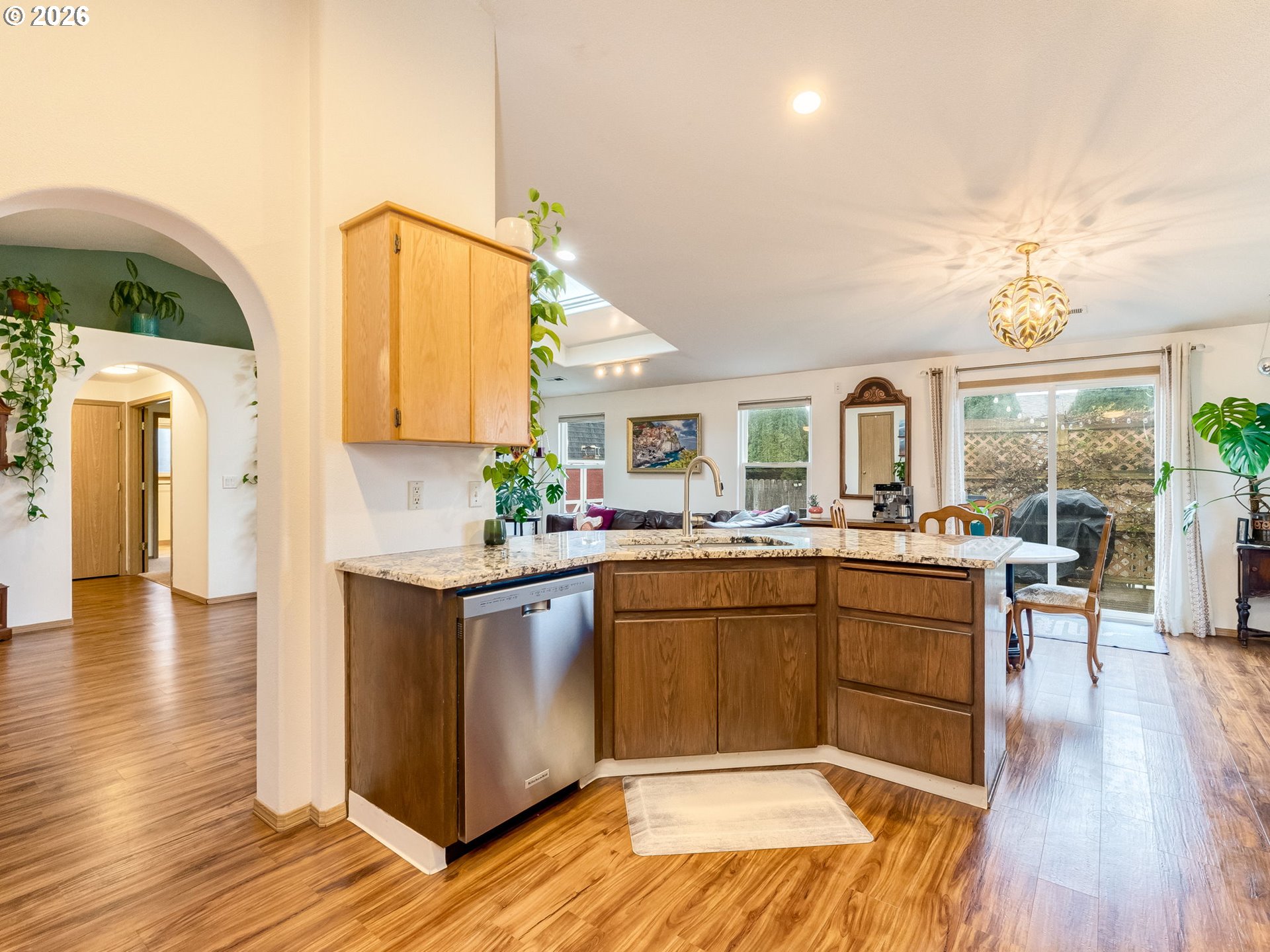 Beautiful one-level home in a convenient location close to all your daily needs! This 3-bedroom, 2-bath home offers an open layout with a kitchen featuring granite counters, a breakfast bar, and great flow into the spacious vaulted family room with skylight, creating a bright and inviting space. The vaulted primary bedroom provides a comfortable retreat. Step outside to a large 10x20 deck overlooking a private backyard - perfect for relaxing or entertaining. The yard has been completely renovated with exceptional curb appeal and includes a custom shed and dedicated TV parking. Additional updates include new exterior paint in 2018 and a high-efficiency gas furnace with A/C for year-round comfort. A well-maintained home with thoughtful upgrades inside and out! Price to Sell! Don't Wait.