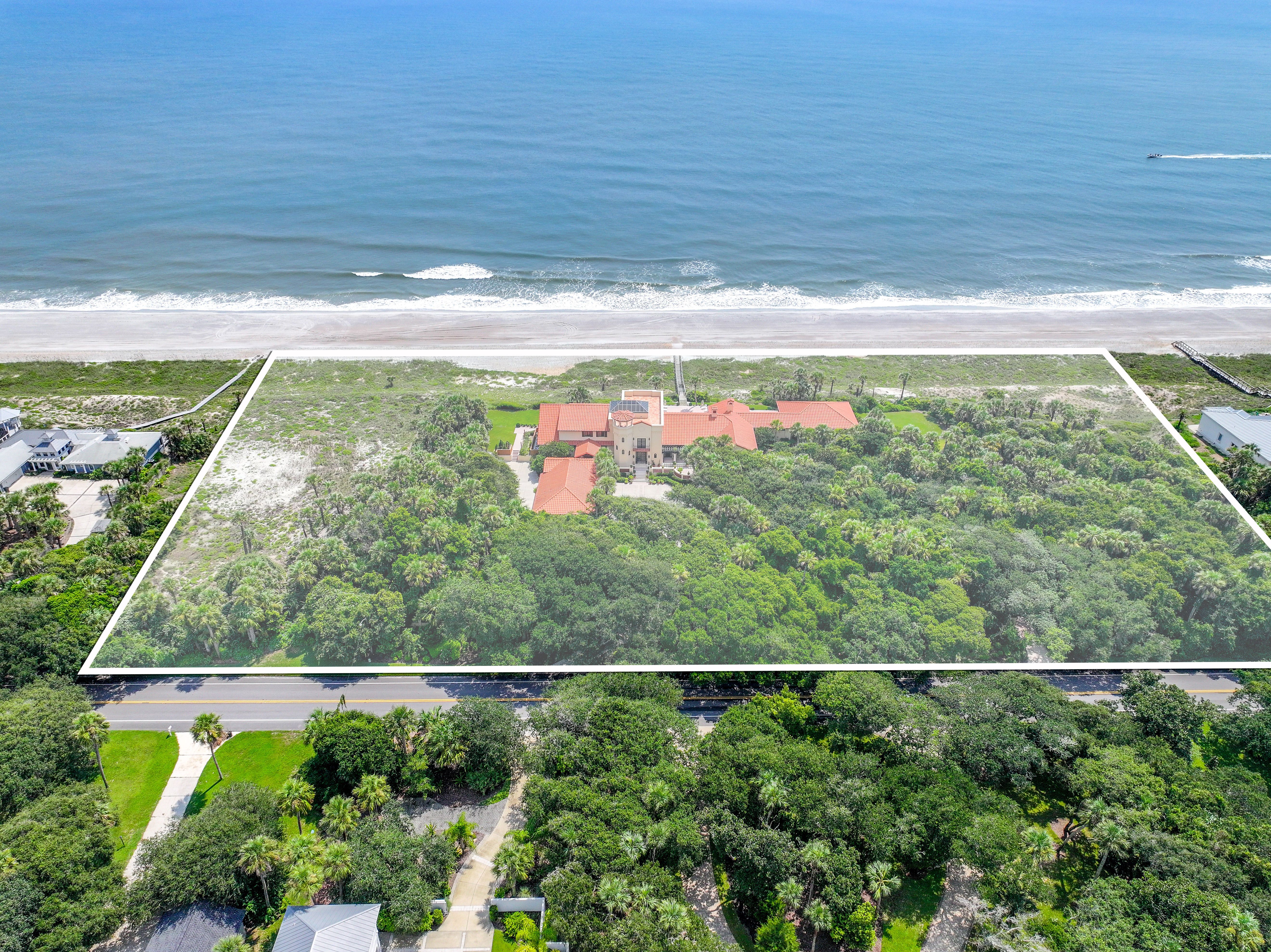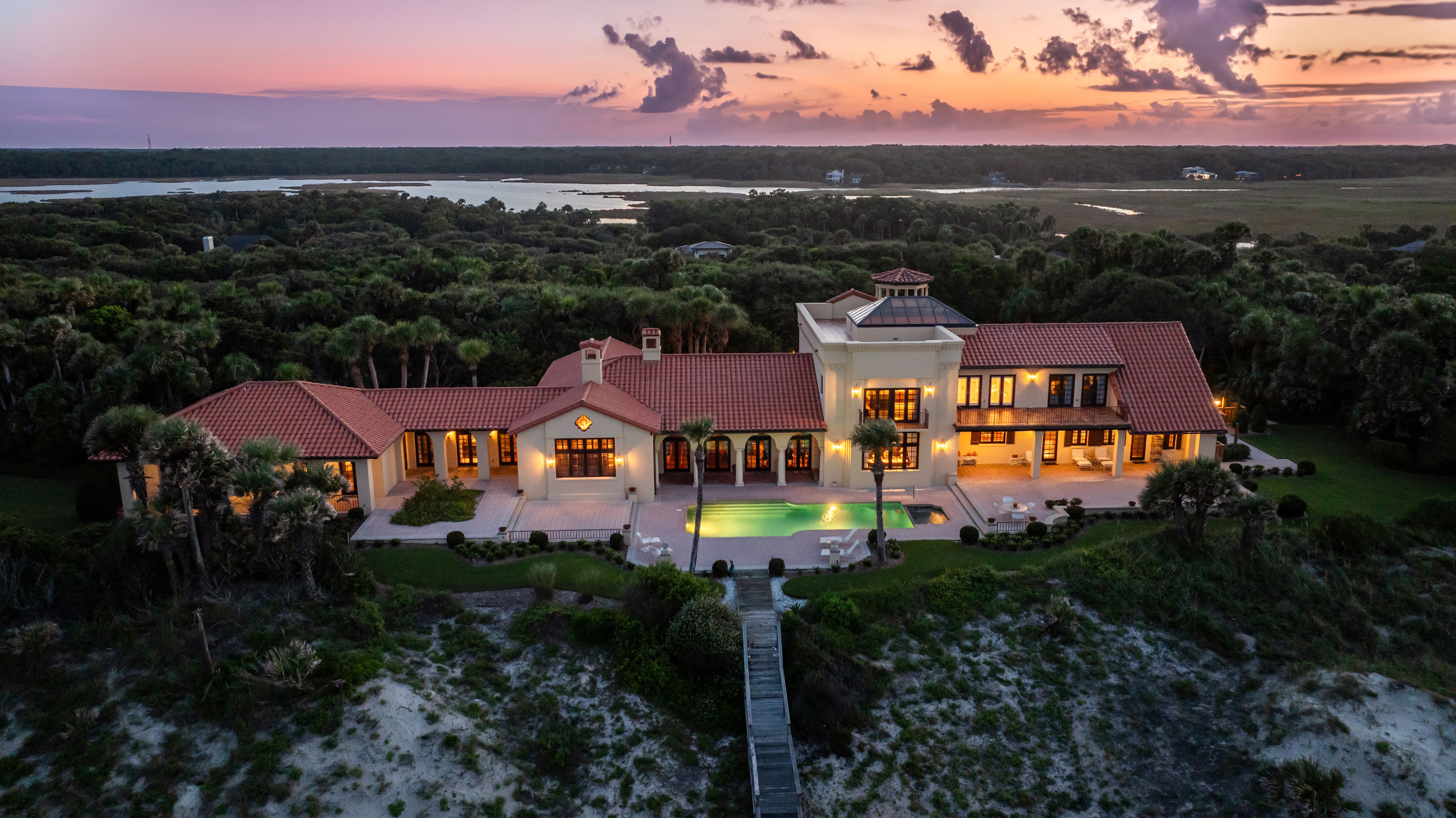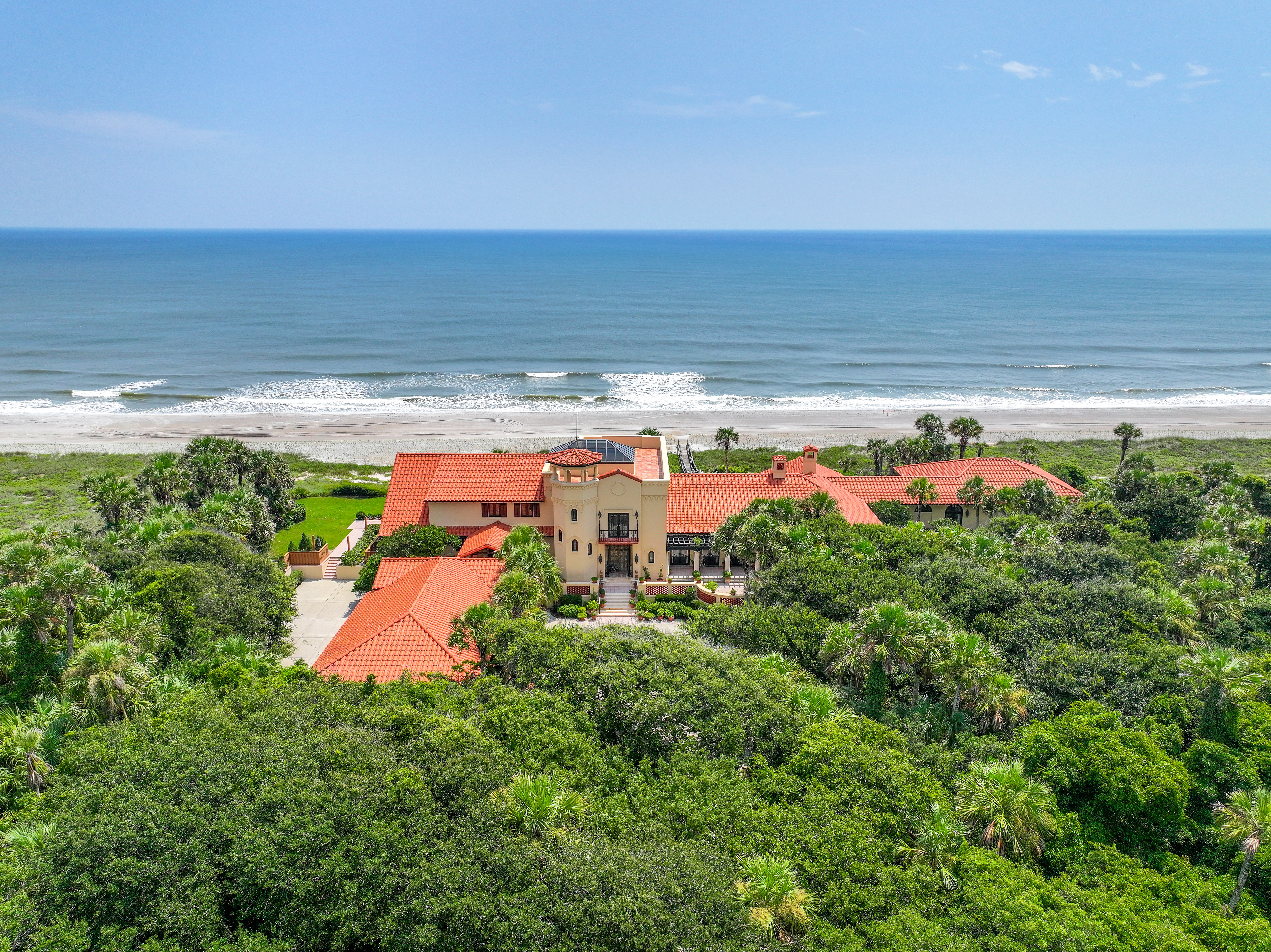 Estates of the quality and uniqueness come along once in a lifetime. This extraordinary oceanfront property is a truly outstanding offering, not only for northeast Florida but for the entire East Coast of the state. It consists of a 10,000 square foot Spanish Colonial style house placed in the center of four contiguous individually platted 160 foot wide lots. Each of the two 160 foot lots at both ends of the property is undeveloped and ready to be used for expansion of the main house or to be developed separately. All 640 feet of this oceanfront property is situated on one of the highest dunes in Northeast Florida at 25 feet above sea level. It is surrounded by lush, jungle-like landscaping. As a result it offers unparalleled views and unmatched privacy. It is truly a one of a kind secluded estate.